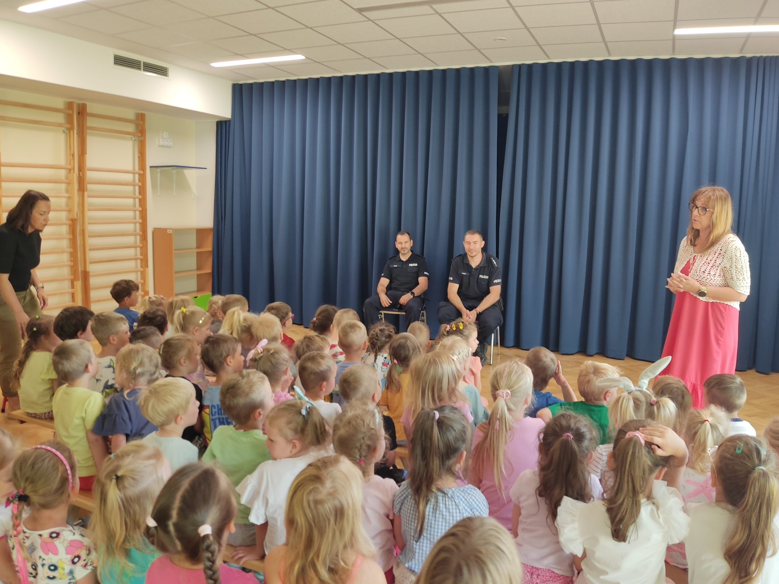 Dnia 24 czerwca 2025 roku w naszym przedszkolu odbyło się wyjątkowe spotkanie z policjantami z Komisariatu Policji Tarnów-Centrum asp. Pawłem Jędrysem oraz asp. Pawłem Kosiarskim. Wydarzenie pod hasłem „Bezpieczne wakacje” miało na celu przypomnienie dzieciom najważniejszych zasad bezpieczeństwa podczas letniego wypoczynku.