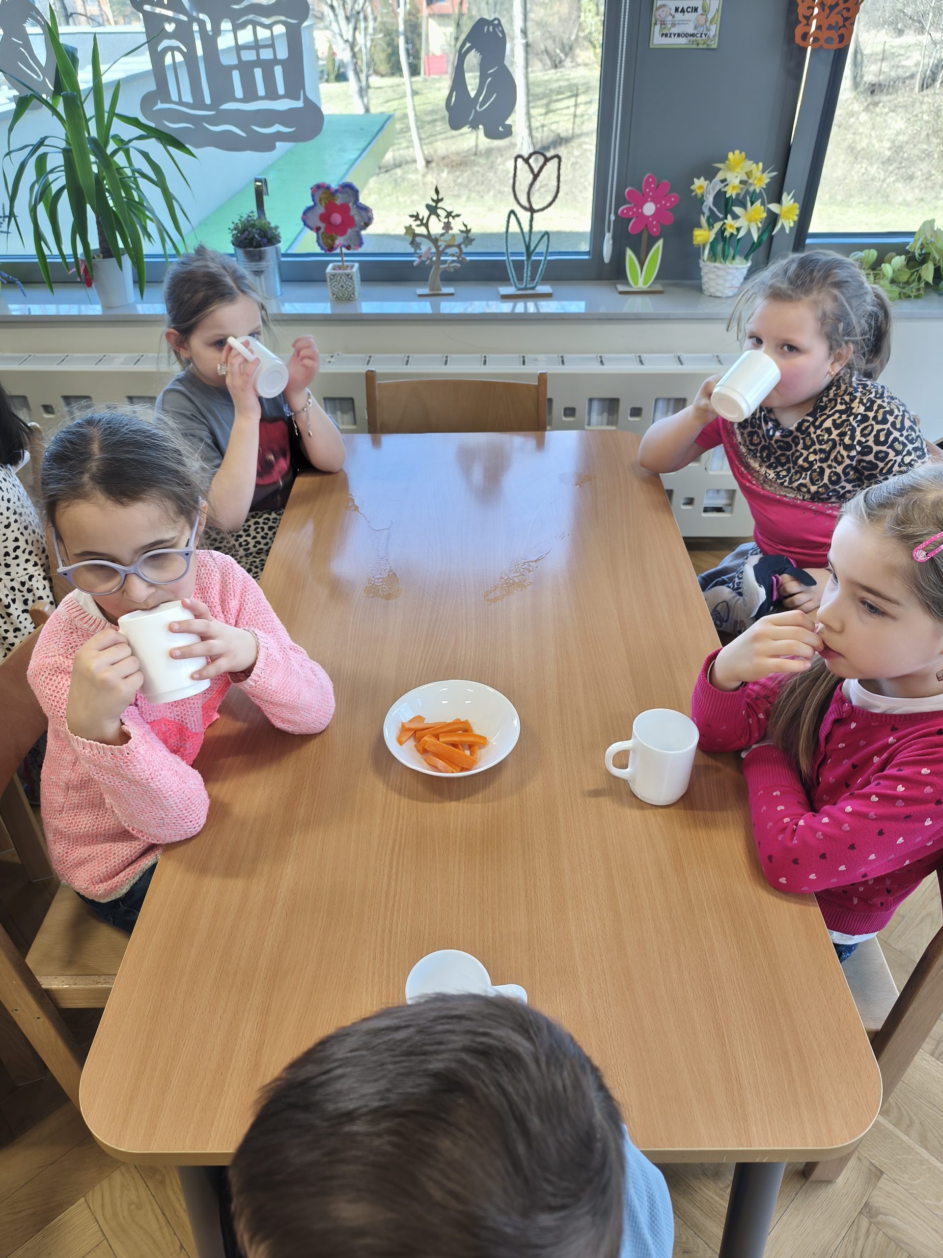W naszym przedszkolu dużą wagę przykładamy do tego, aby dzieci spędzały czas aktywnie i w sposób sprzyjający ich zdrowiu oraz prawidłowemu rozwojowi. Organizujemy różnorodne zabawy ruchowe, ćwiczenia gimnastyczne oraz aktywności na świeżym powietrzu, które rozwijają sprawność fizyczną, koordynację ruchową i wzmacniają odporność. Przedszkolaki również uczą się, jak ważne jest jedzenie warzyw i owoców, picie wody. Dlatego dzieci z grupy Sowy korzystając z pięknego ciepłego dnia wykorzystały go do zabaw na dworze, dopisywały uśmiechu i radości ze zbliżającej się wiosny a po powrocie mogły pożywić się pyszną marchewką i zdrową wodą.