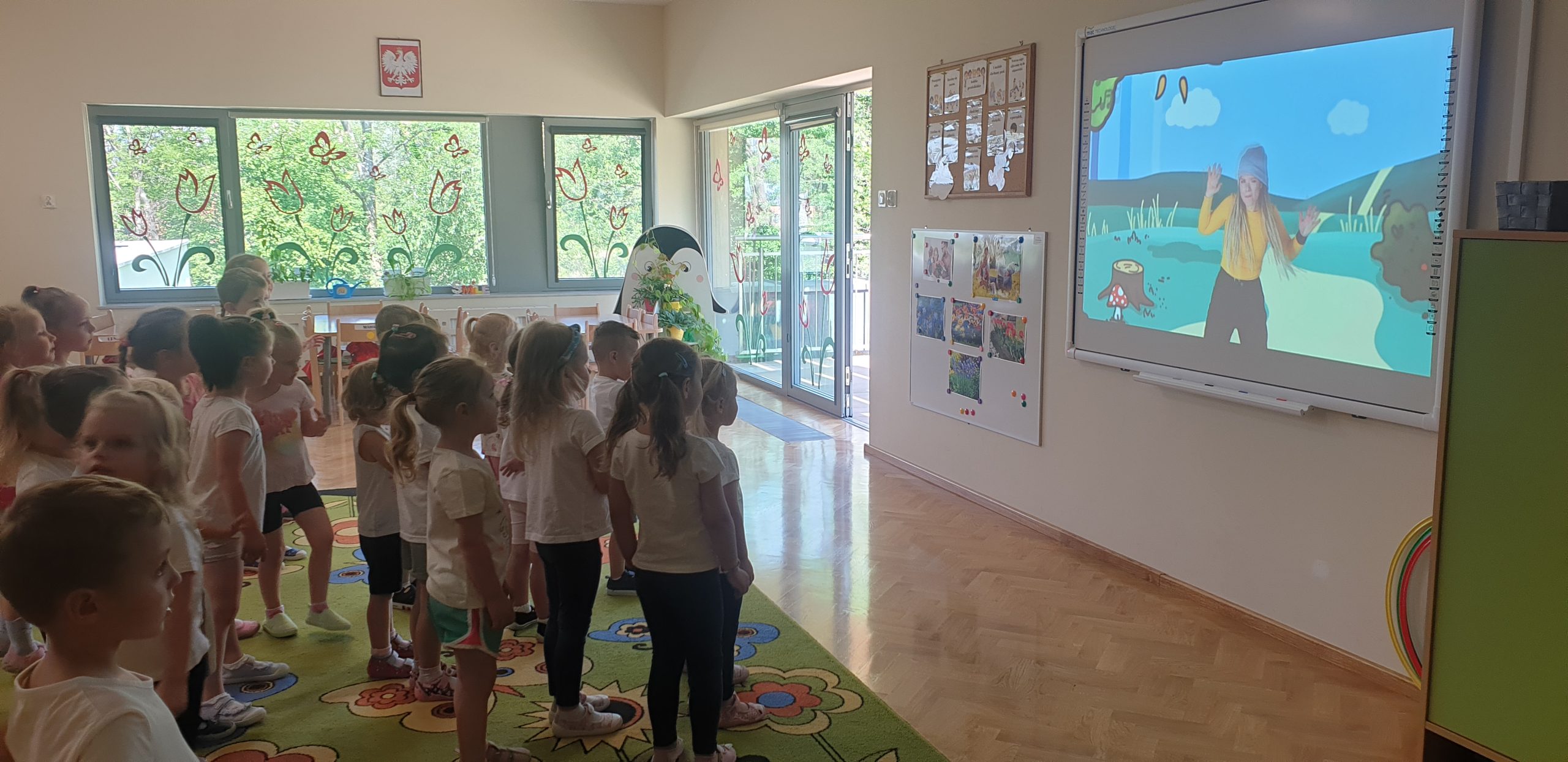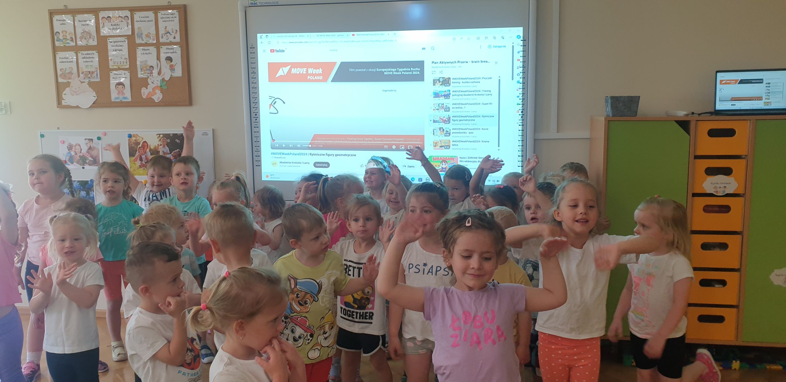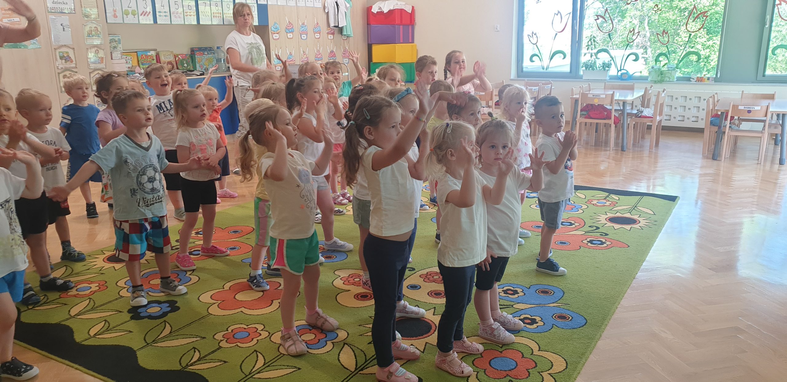 W ramach akcji oprócz ćwiczeń porannych oraz zabaw ruchowych w sali gimnastycznej, grupa „Jeżyków” i „Misiów” spotkały się 28 maja na wspólnych ćwiczeniach przed ekranem multimedialnym.