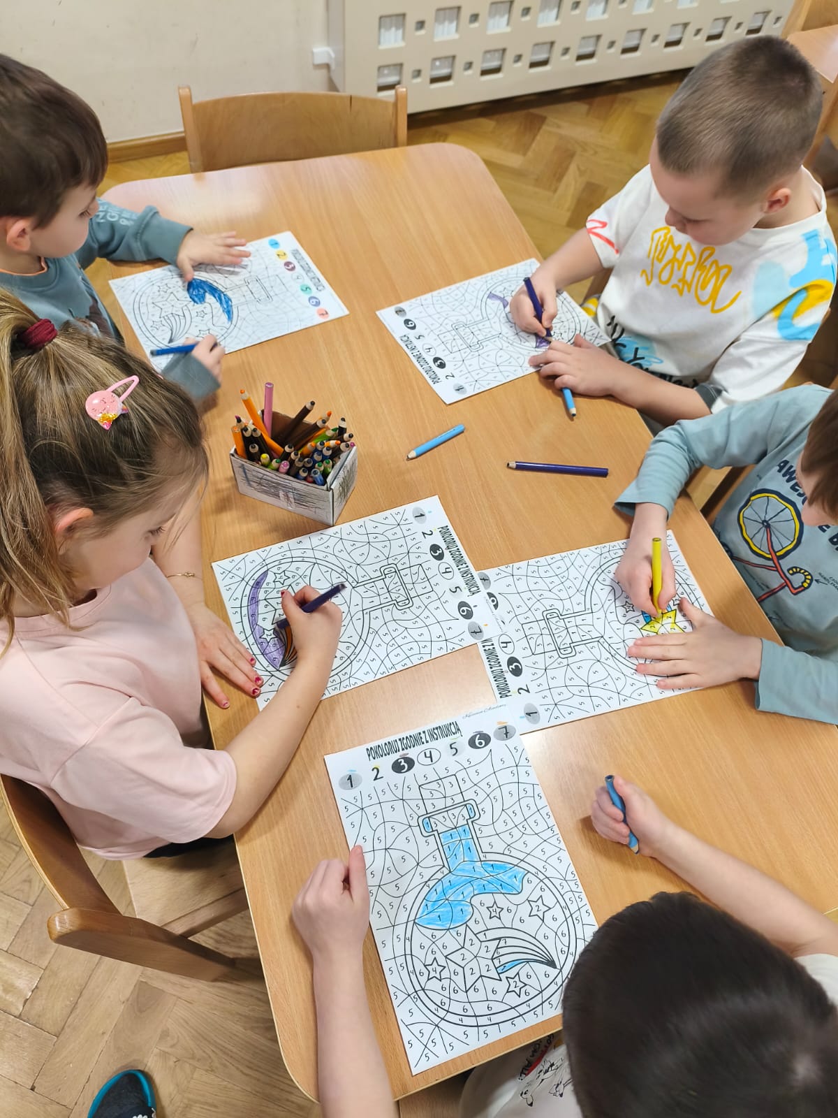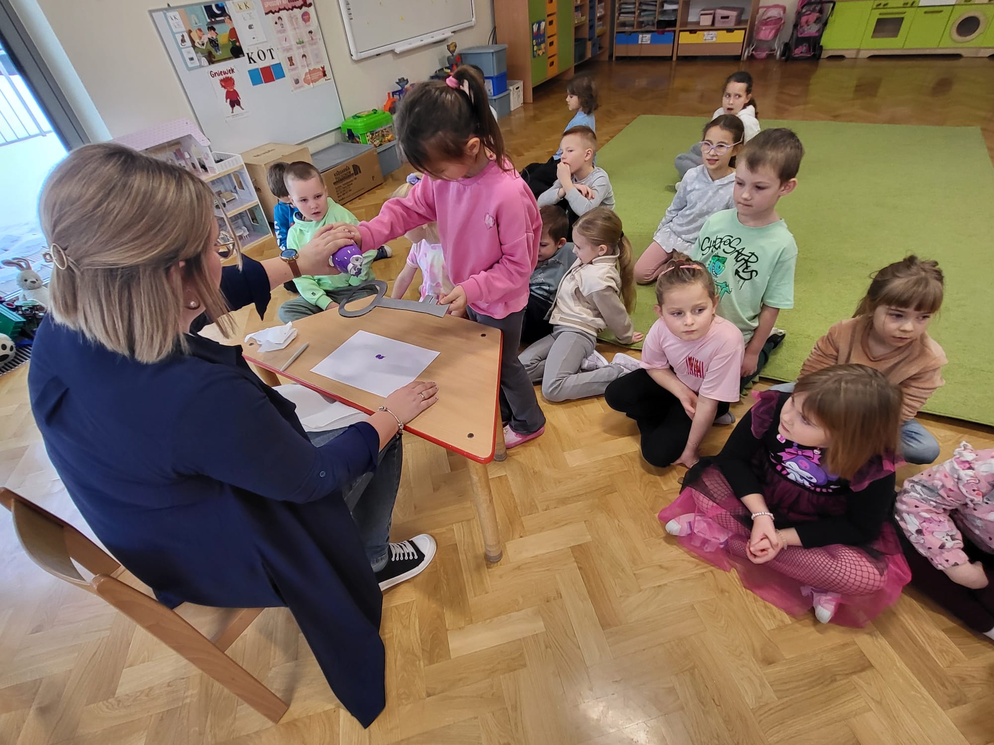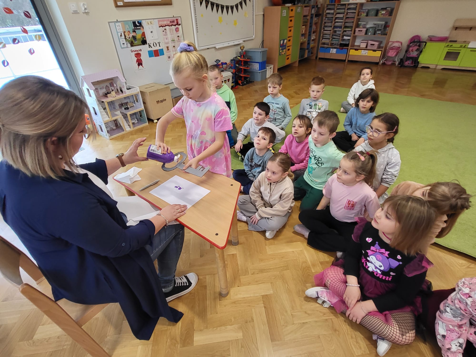 Nie mogło zabraknąć tradycyjnych wróżb! Przedszkolaki ustawiały swoje buty, aby sprawdzić, kto pierwszy “wyjdzie” dziś z przedszkola – ta zabawa wywołała mnóstwo emocji i śmiechu. Dzieci losowały także przyszłe zawody, dowiadując się, czy w przyszłości zostaną np. lekarzem, strażakiem, kucharzem czy artystą. Ogromnym zainteresowaniem cieszyło się również lanie farby przez klucz, które pobudzało wyobraźnię i zamieniało zwykłe kształty w tajemnicze andrzejkowe wróżby.