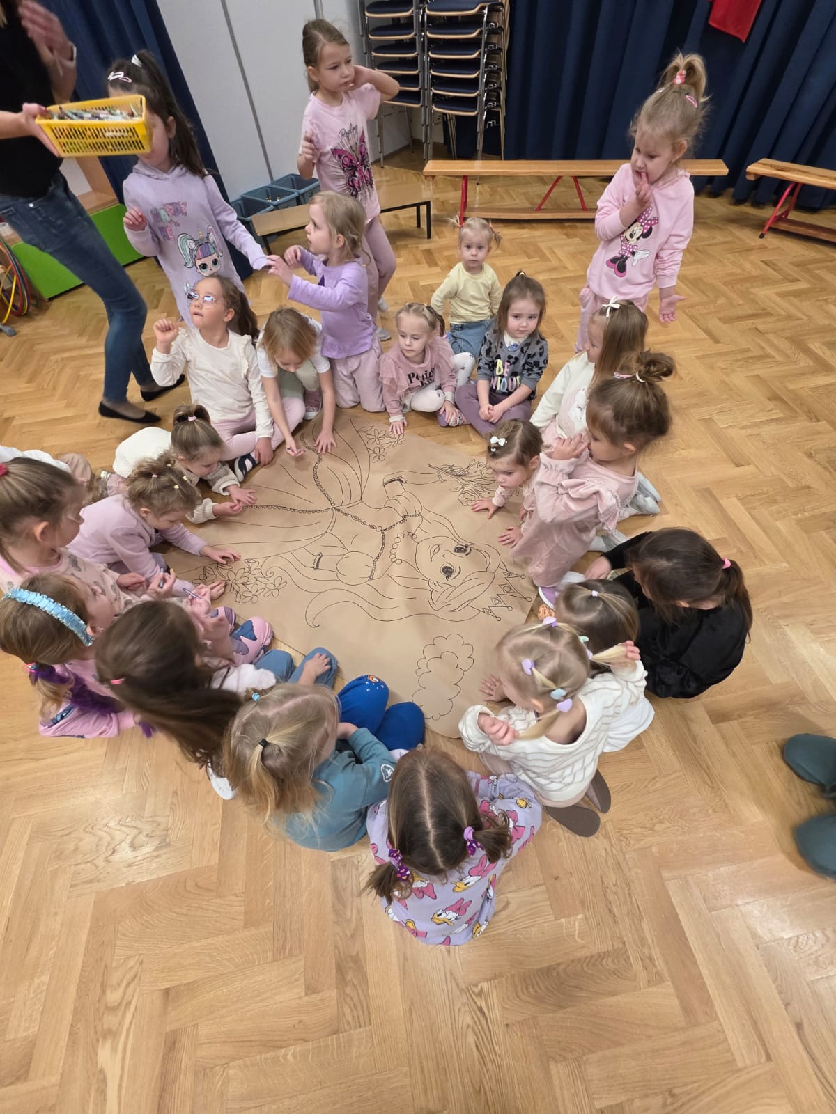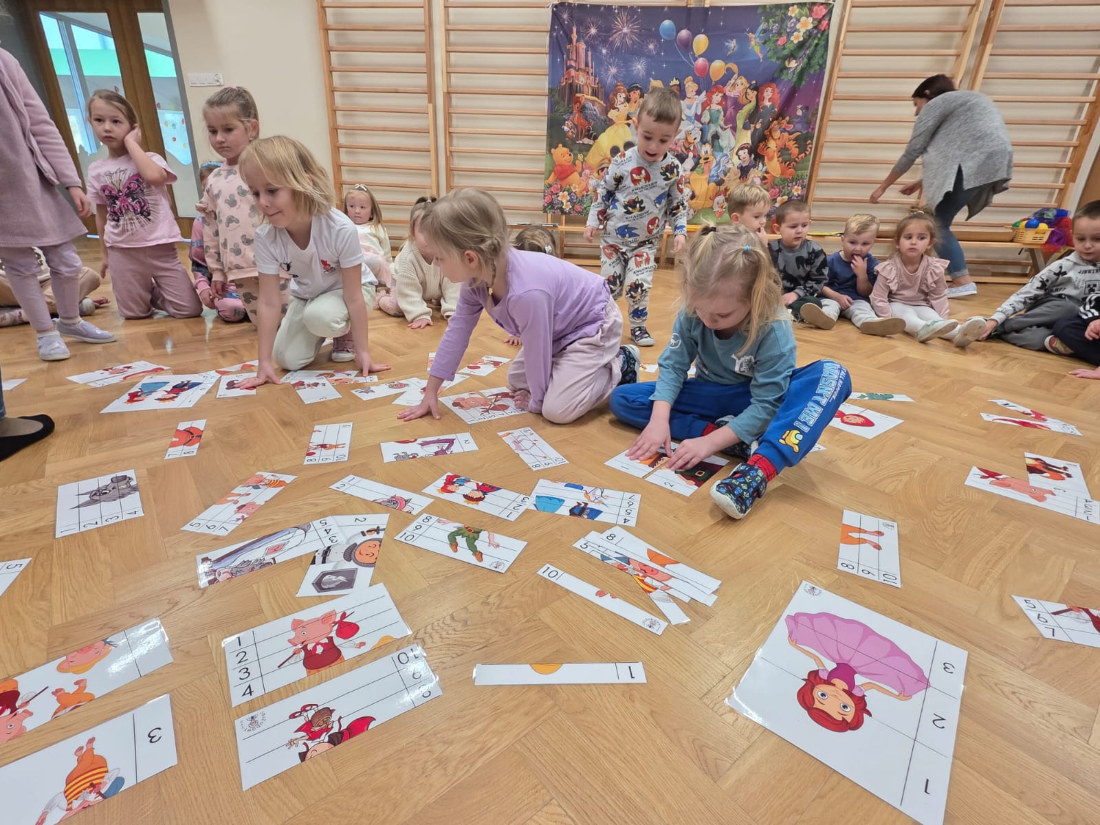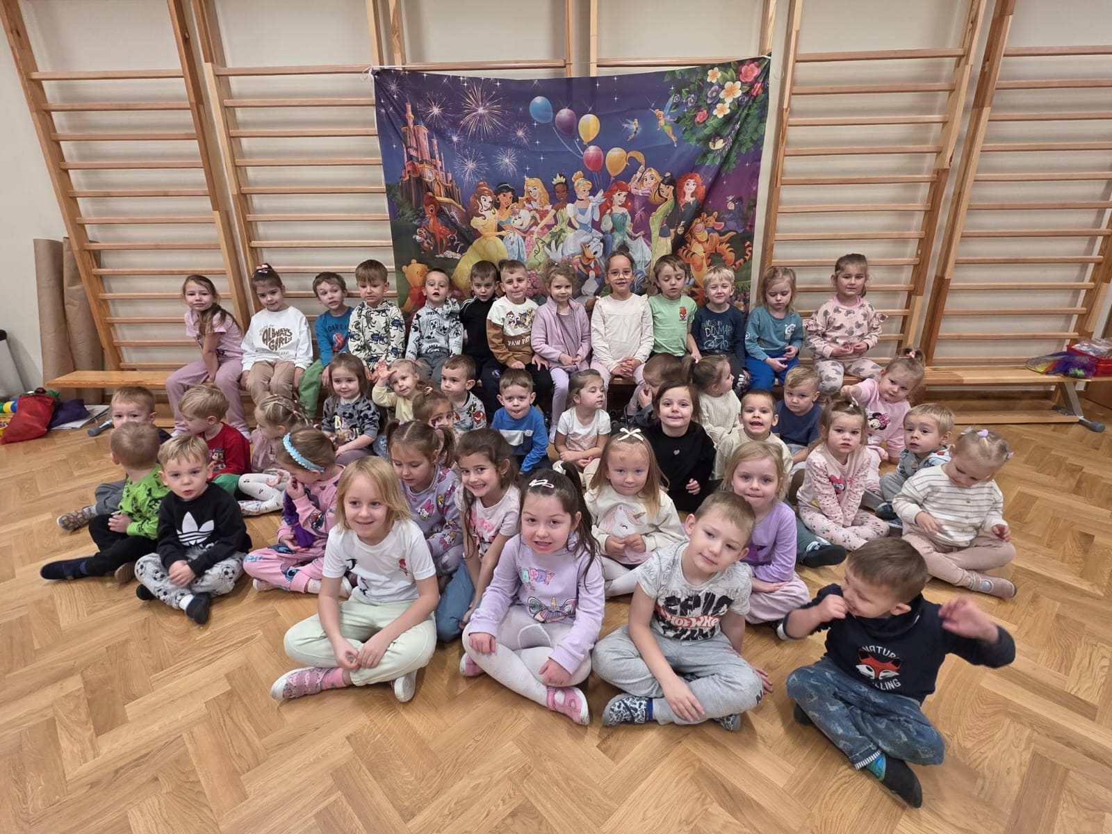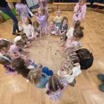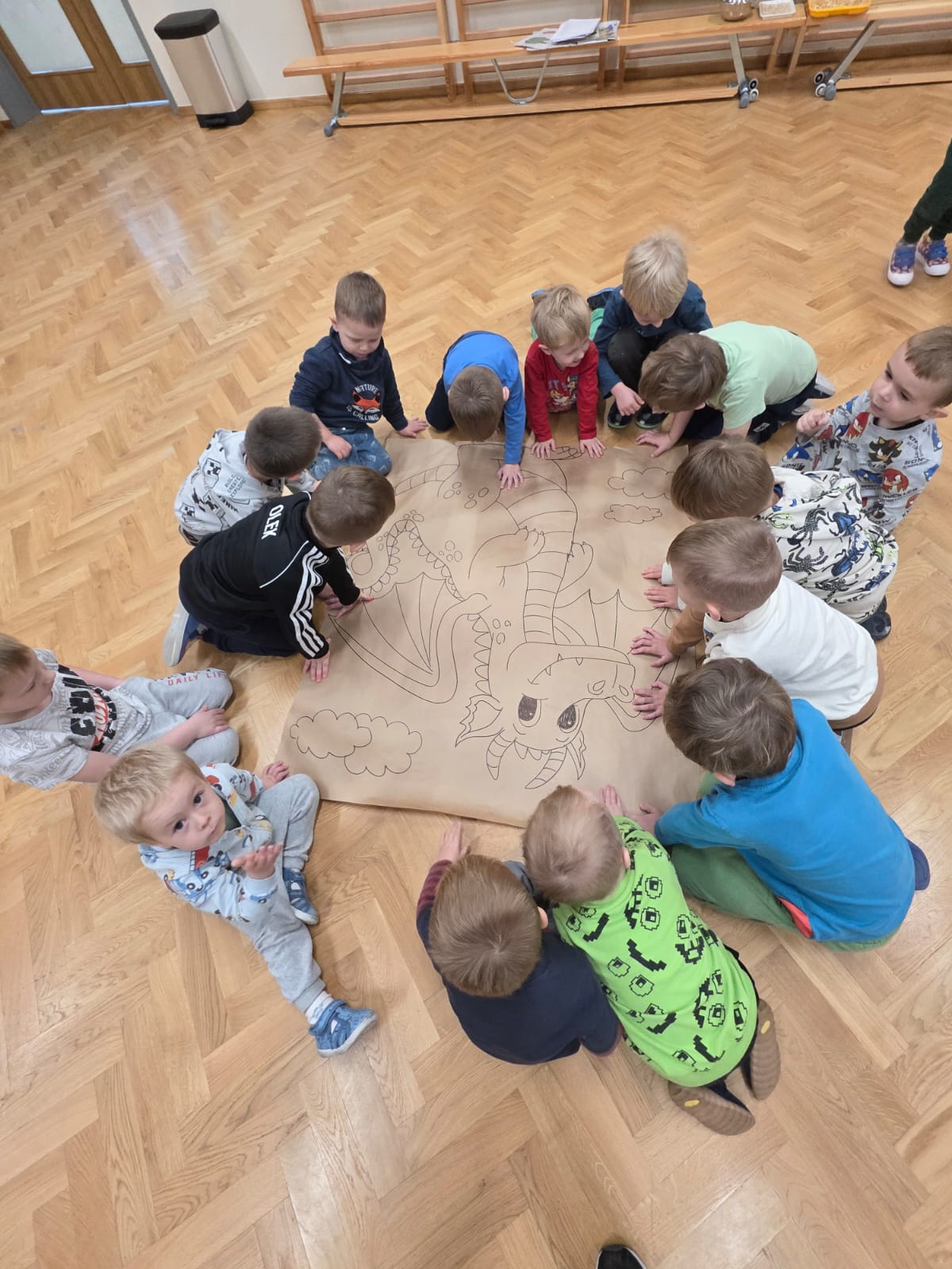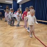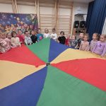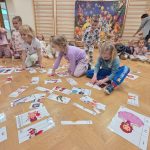 Z tej okazji dzieci z grup: „Jeżyków” i „Wiewiórek” wyruszyły w podróż do krainy bajek. Był to dzień pełen kolorów, uśmiechu i wspaniałej zabawy! Przedszkolaki uczestniczyły w licznych konkursach, zabawach ruchowych, quizach oraz tańcach przy muzyce. Dzieci rozpoznawały bajki po przeczytanym fragmencie, rozwiązywały zagadki dotyczące postaci z ulubionych książek, trafnie segregowały bajkowe rekwizyty oraz układały cienie i puzzle z bohaterami znanych opowieści. Utożsamiając się z bajkowymi bohaterami, dzieci przeżywały ich przygody, smutki i radości. Na koniec przedszkolaki z zapałem kolorowały wielkie ilustracje bajkowych postaci – piękną księżniczkę i groźnego smoka, rozwijając przy tym swoją kreatywność i zdolności plastyczne.