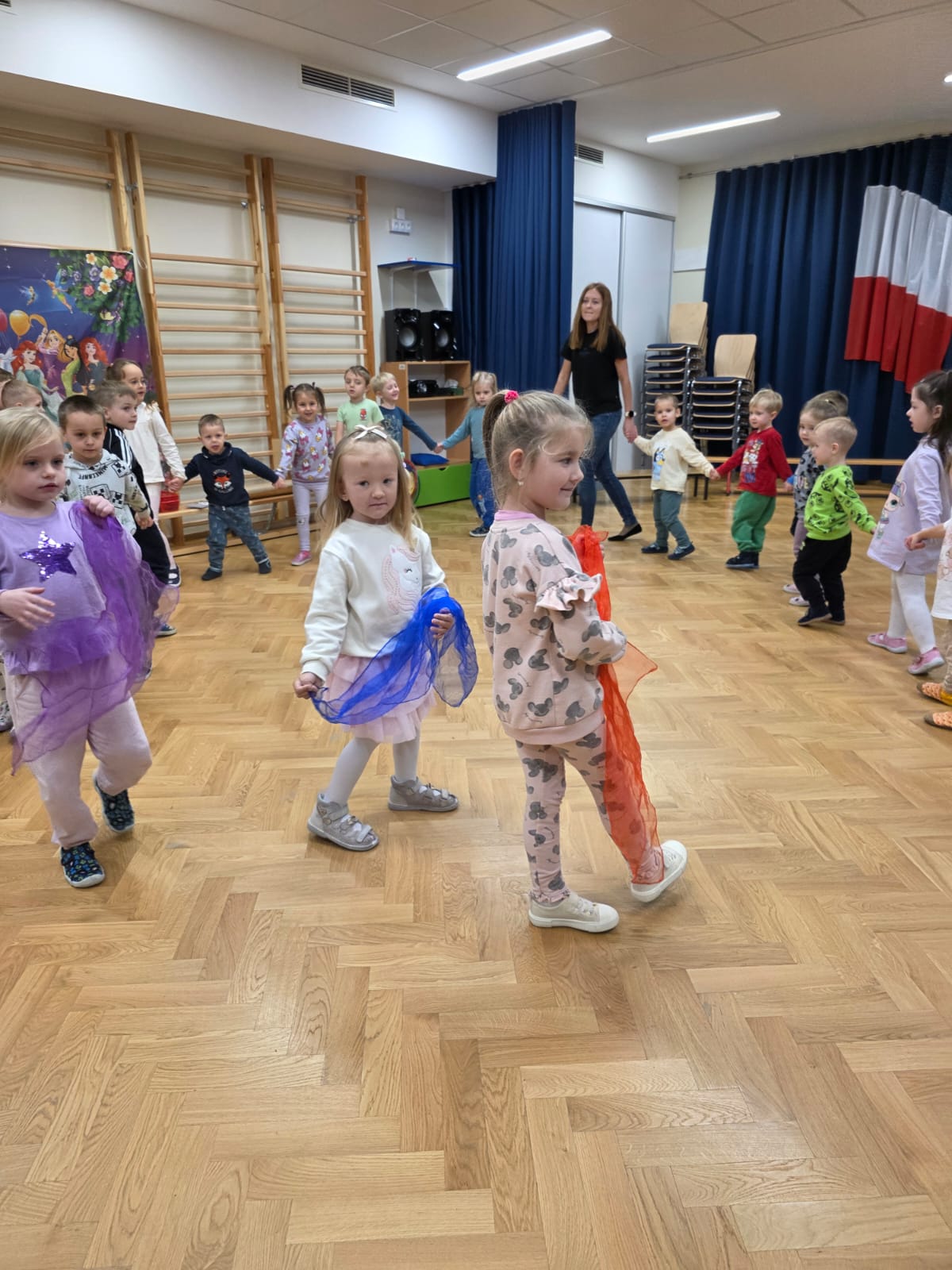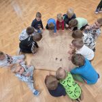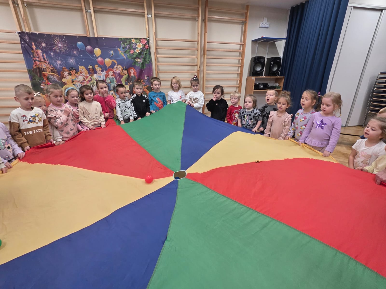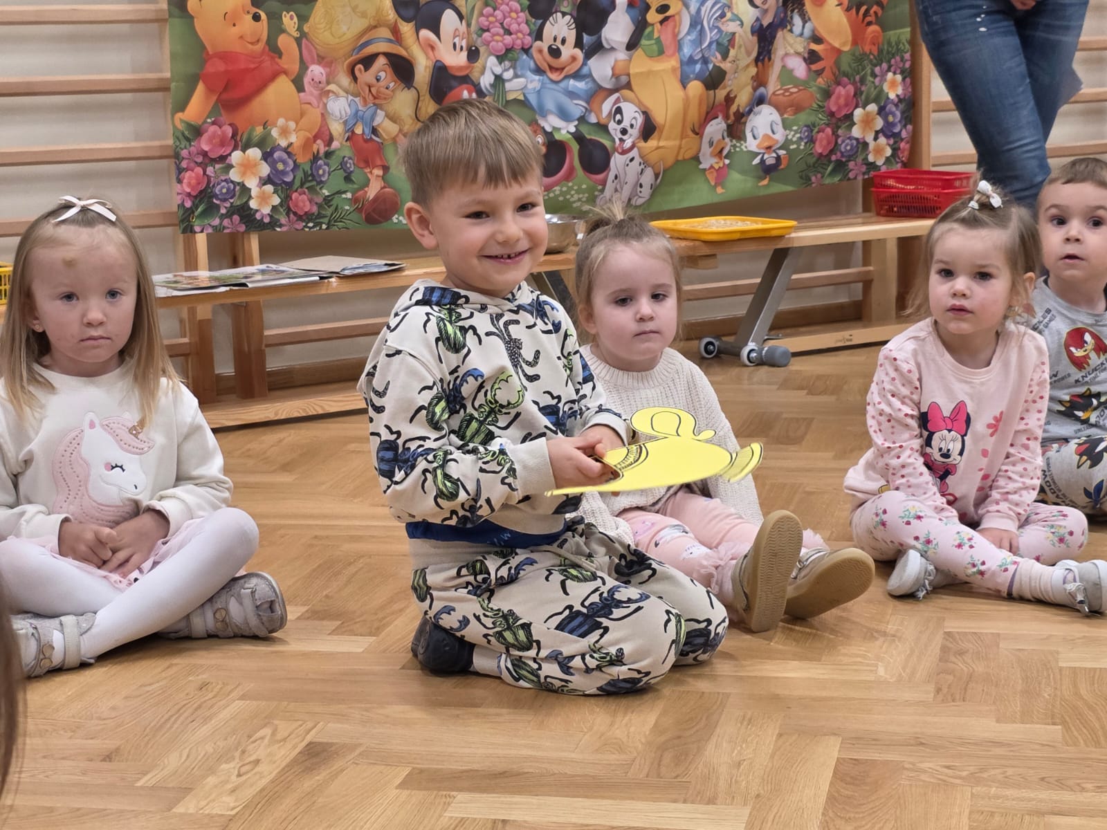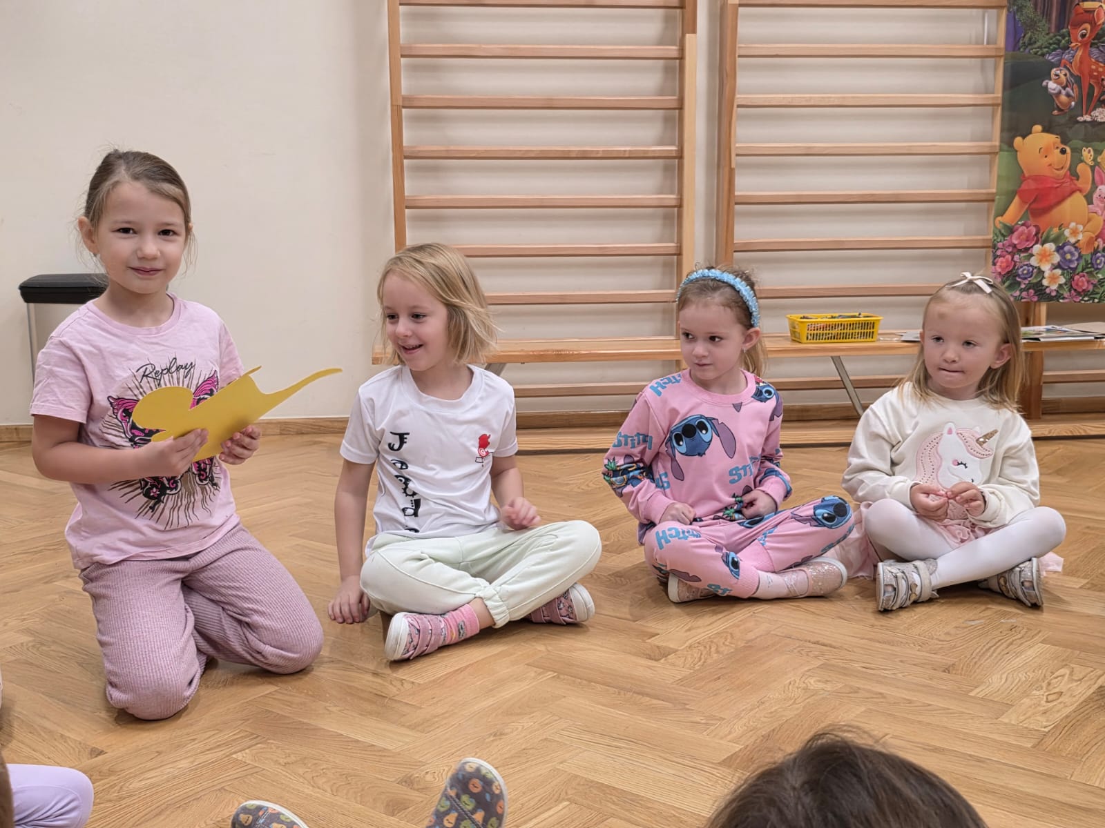 Z tej okazji dzieci z grup: „Jeżyków” i „Wiewiórek” wyruszyły w podróż do krainy bajek. Był to dzień pełen kolorów, uśmiechu i wspaniałej zabawy! Przedszkolaki uczestniczyły w licznych konkursach, zabawach ruchowych, quizach oraz tańcach przy muzyce. Dzieci rozpoznawały bajki po przeczytanym fragmencie, rozwiązywały zagadki dotyczące postaci z ulubionych książek, trafnie segregowały bajkowe rekwizyty oraz układały cienie i puzzle z bohaterami znanych opowieści. Utożsamiając się z bajkowymi bohaterami, dzieci przeżywały ich przygody, smutki i radości. Na koniec przedszkolaki z zapałem kolorowały wielkie ilustracje bajkowych postaci – piękną księżniczkę i groźnego smoka, rozwijając przy tym swoją kreatywność i zdolności plastyczne.