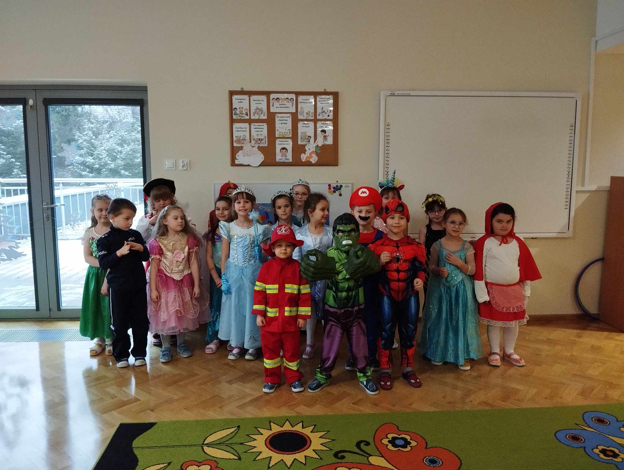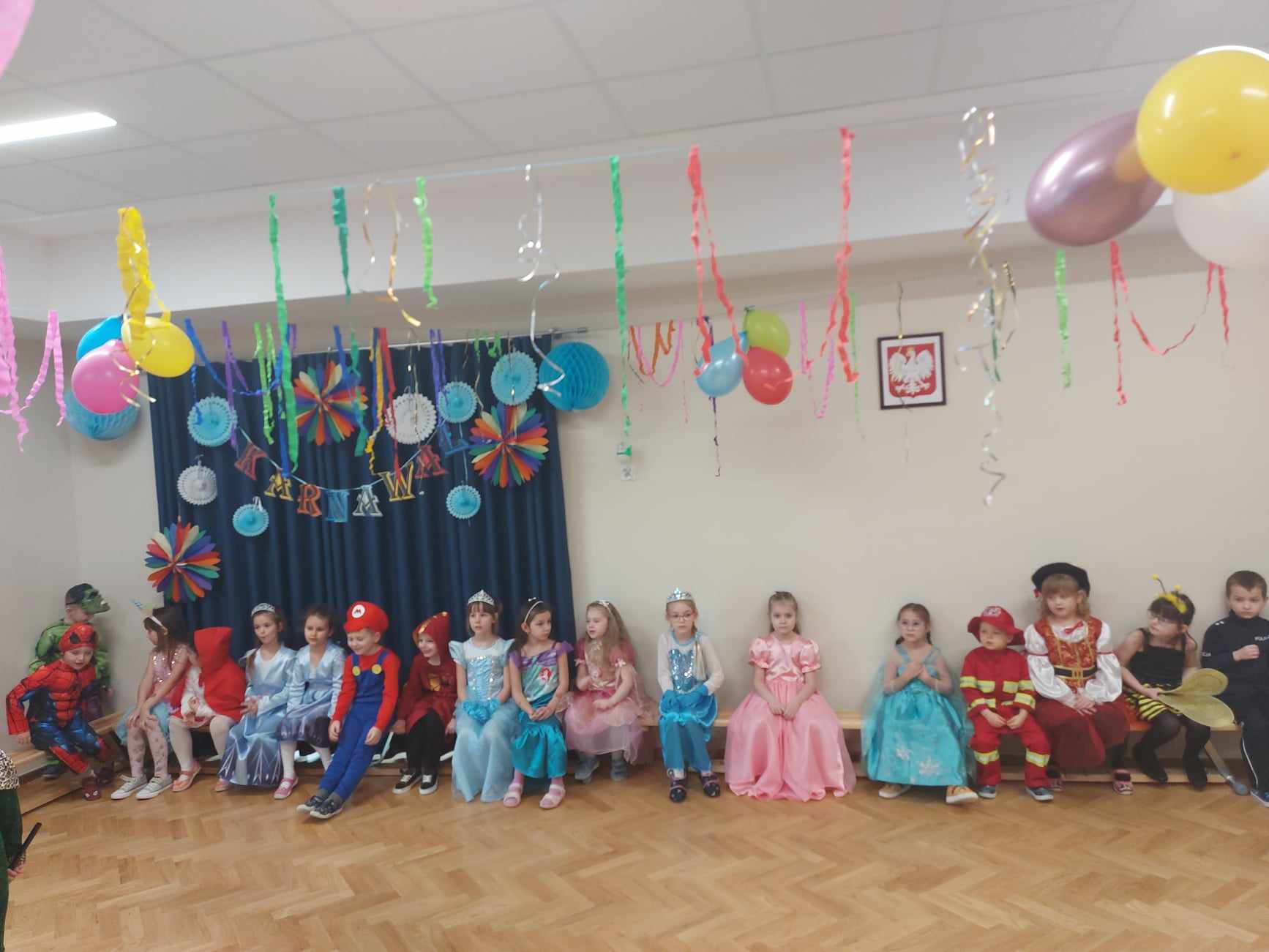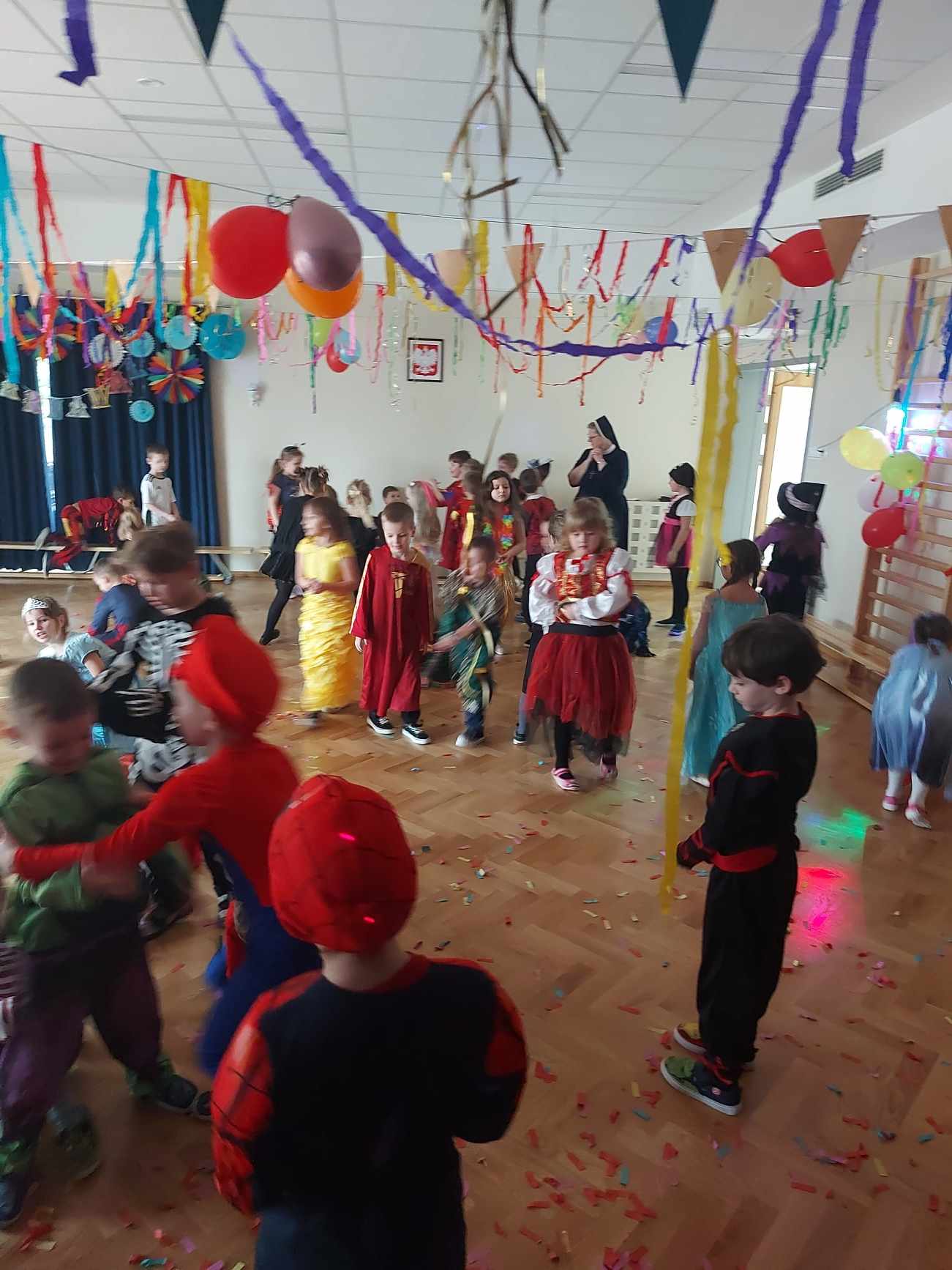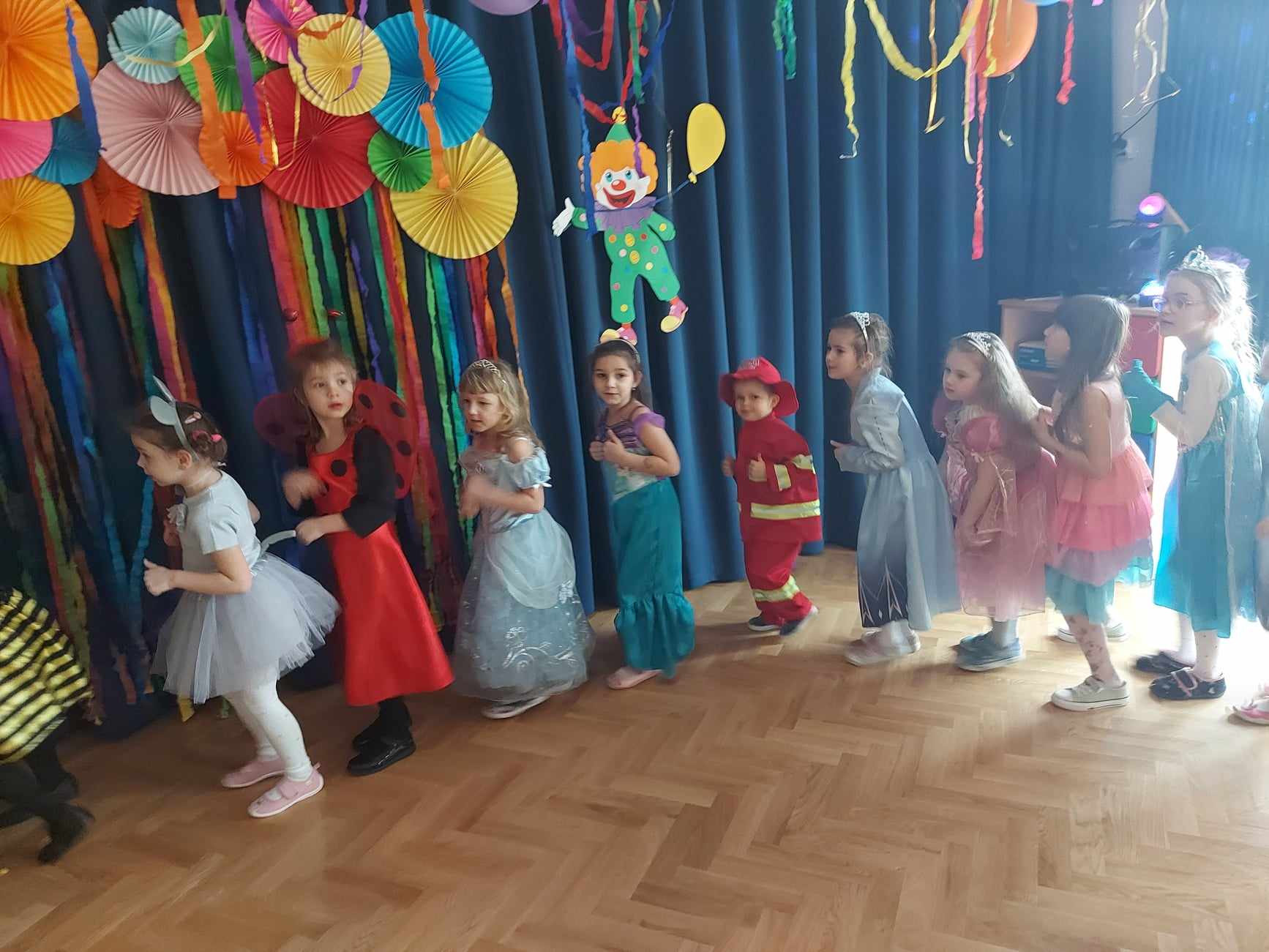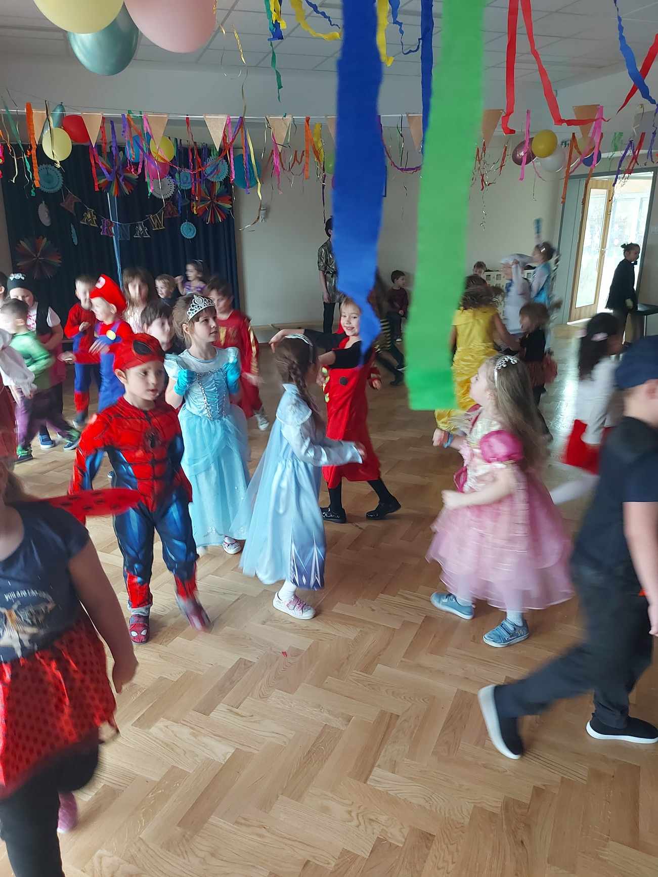 Bal karnawałowy dla przedszkolaków to dzień niezwykły, wyczekiwany. Jest atrakcją bardzo lubianą przez dzieci, dostarczającą im wielu przeżyć i radości. Tak też było u nas. W czwartek 08 lutego w naszym Przedszkolu odbył się wielki bal karnawałowy nasz grupa wzięła w nim udział razem z grupą IV i VI. Tego dnia już od rana w przedszkolu pojawiały się kolorowe postacie. Dzieci przebrane były za bohaterów znanych bajek, w salach przedszkolnych można było spotkać wróżki, królewny, strażaka, czarodziejów, Spider-Mana, pszczółkę ,… nie sposób zliczyć. Wystrój sali wprowadził w radosny nastrój oraz zachęcał wszystkich do wesołej zabawy. Kiedy pojawiły się pierwsze rytmy wesołej muzyki, to wszystkie przedszkolaki z wielką ochotą rozpoczęły pląsy i tańce. Wszyscy bawili się znakomicie. Były „tańce – łamańce”, „pociąg”, „kaczuchy” i ” Krasnoludek”. Jednym słowem zabawa na 102!!!.