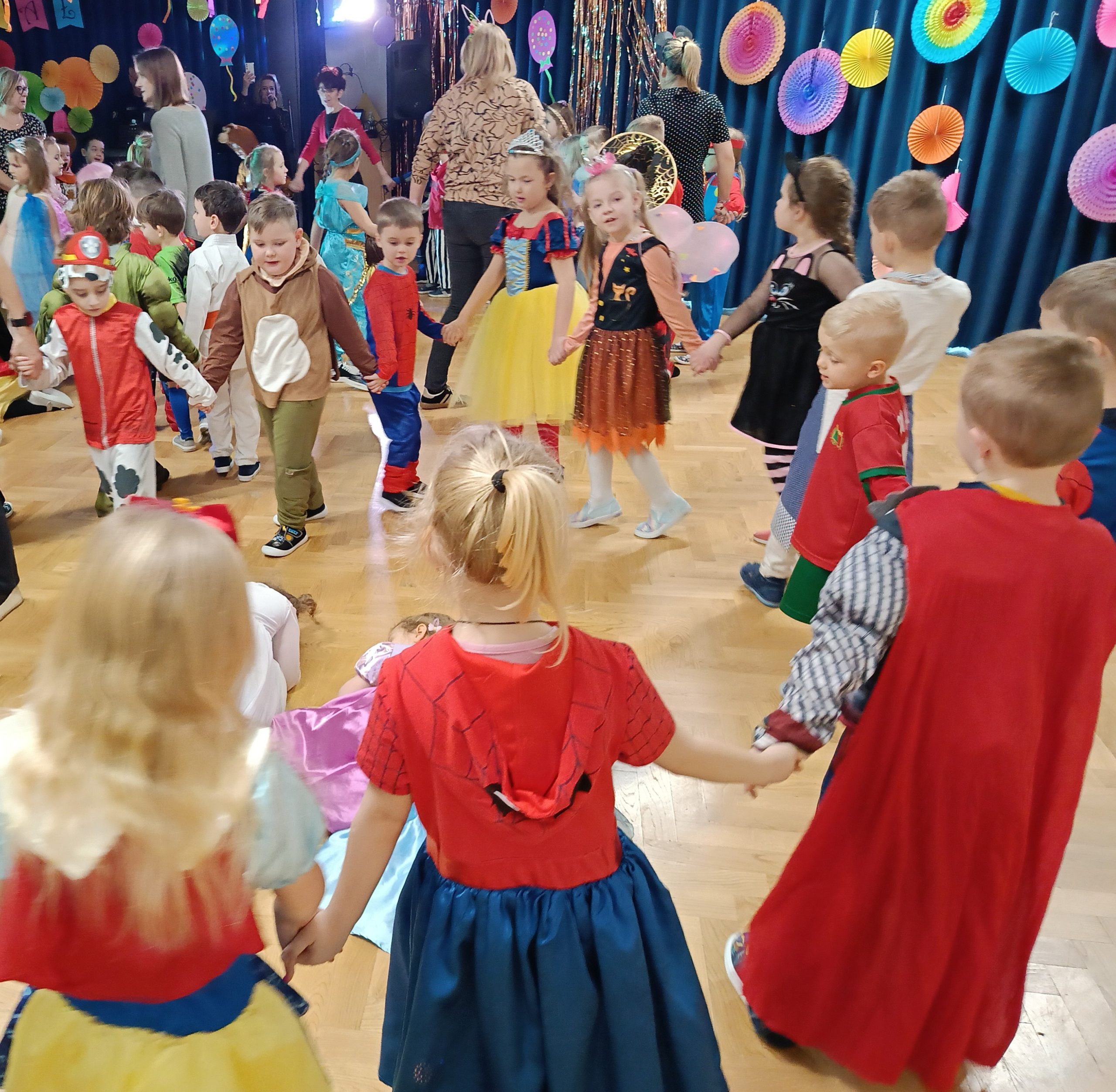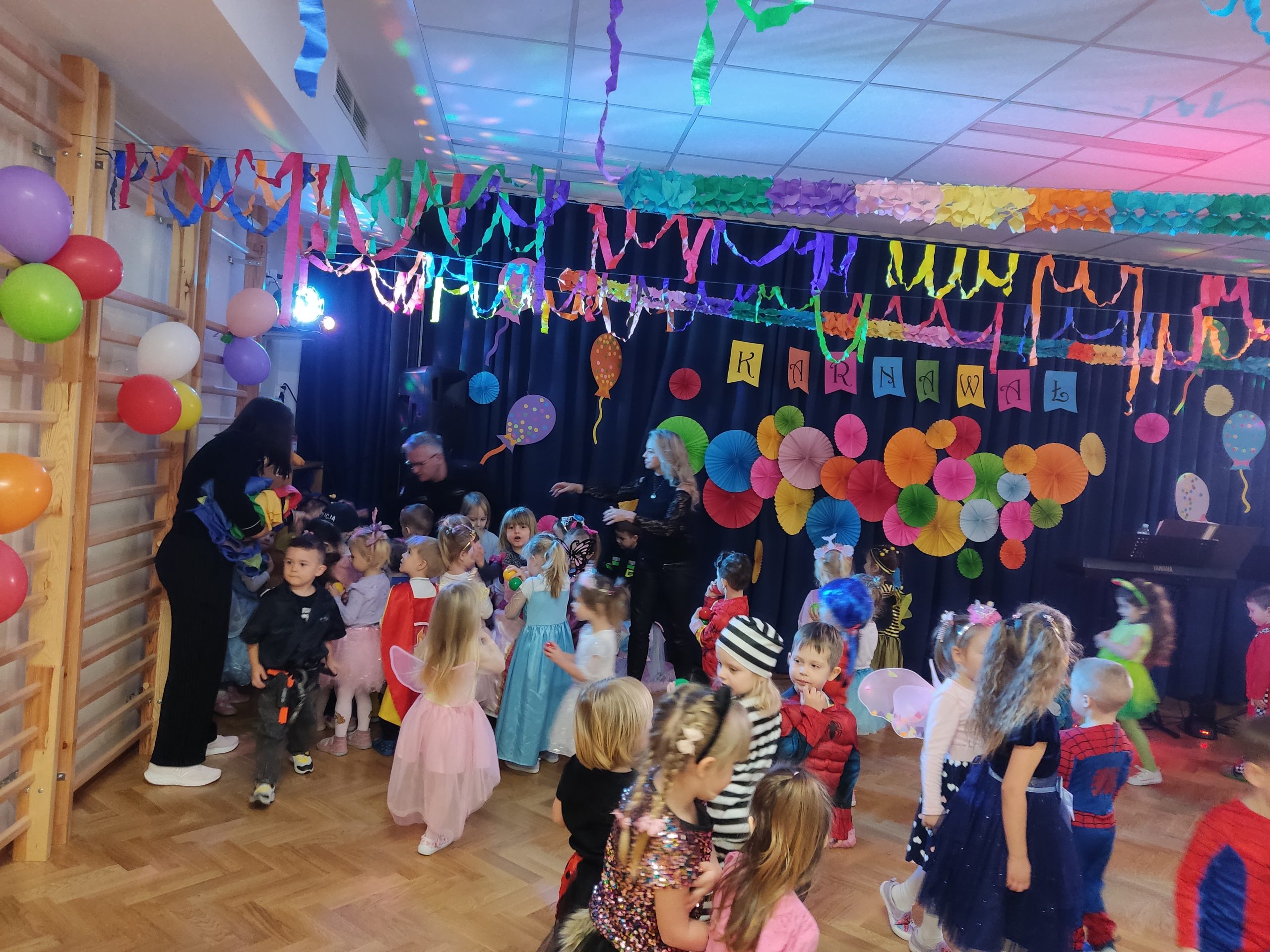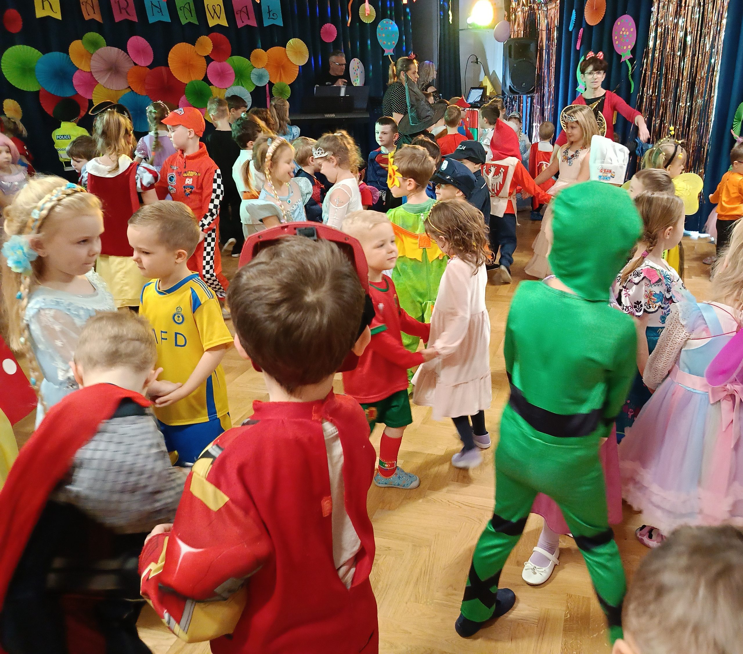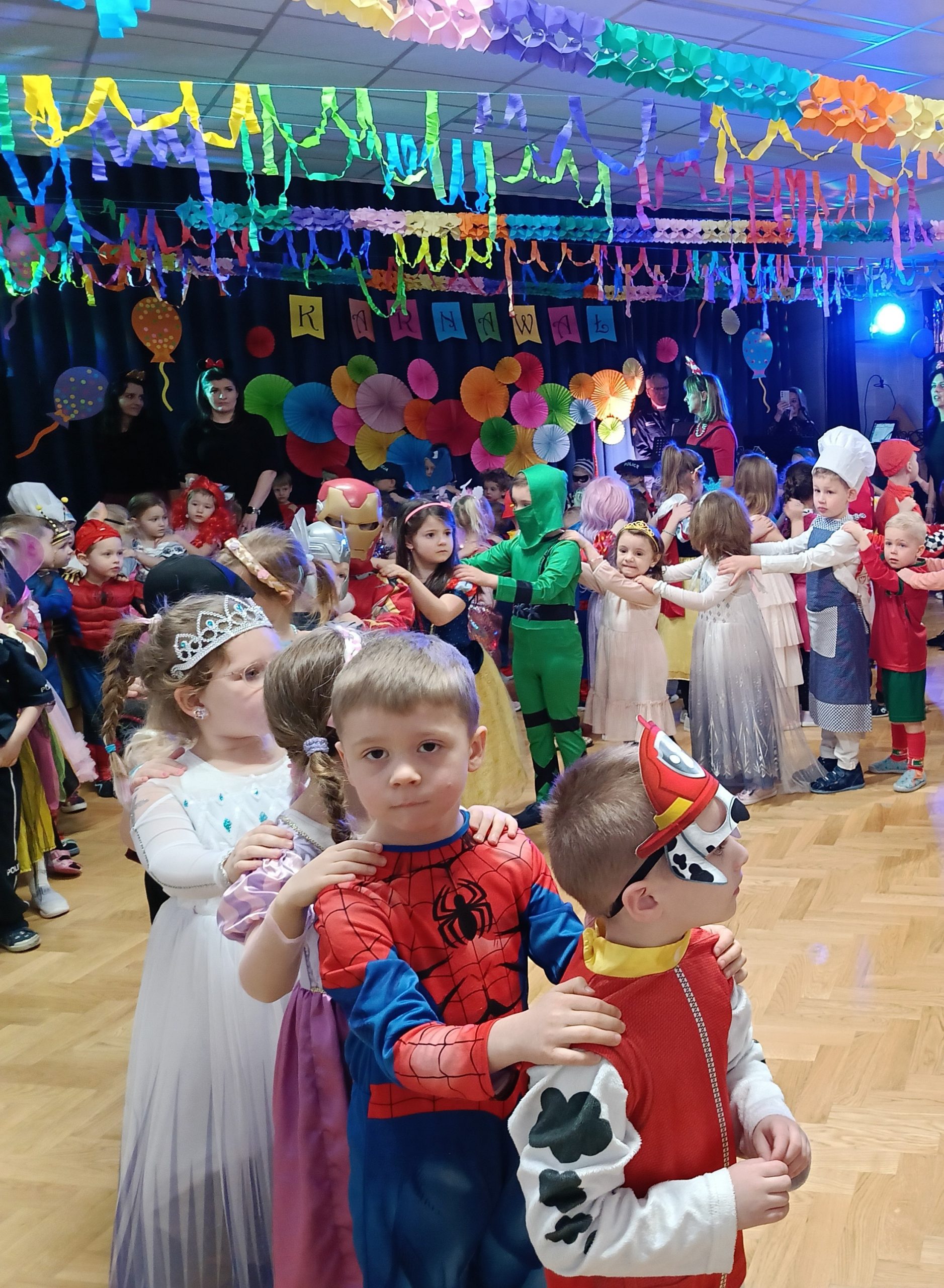 Ależ to był piękny bal! W naszym przedszkolu 24 lutego odbył się prawdziwy bal karnawałowy. Tego dnia sala widowiskowa zamieniła się w salę balową. Na tę wyjątkową okazję zaprosiliśmy do prowadzenia balu – Panią Anetkę i Pana Krzysztofa Krawczyków, którzy zachęcali wszystkich do wspaniałej zabawy i tańca. W tym dniu przenieśliśmy się do „Wielkiej krainy bajek”. Na balu, więc obok księżniczek, motylków, żabek, myszek, wróżek, rycerzy, policjantów, czy piratów, pojawiły się postacie z ulubionych bajek: Pszczółka Maja, Królewna Śnieżka, Syrenka, Spiderman, Super Mario, Biedronka i Czarny Kot, Psi Patrol, Elza. Po pięknej prezentacji strojów rozpoczęły się tańce przy rytmach wesołej muzyki, które były przeplatane zabawami, korowodami i konkursami. Po intensywnej zabawie przyszedł czas na chwilę odpoczynku i słodki poczęstunek, za który serdecznie dziękujemy Rodzicom. Na stołach czekały pyszne przekąski, owoce oraz soki, które dodały energii na kolejne taneczne szaleństwa. Przy gorących rytmach muzyki wszyscy bawili się wyśmienicie, a uśmiech nie znikał z twarzy przedszkolaków. Do domu dzieci wracały we wspaniałych humorach, dzieląc się z rodzicami swoimi przeżyciami. Bal zakończył się pamiątkowymi zdjęciami, które będą piękną pamiątką tego radosnego dnia. To był dzień pełen muzyki i wspaniałej zabawy!