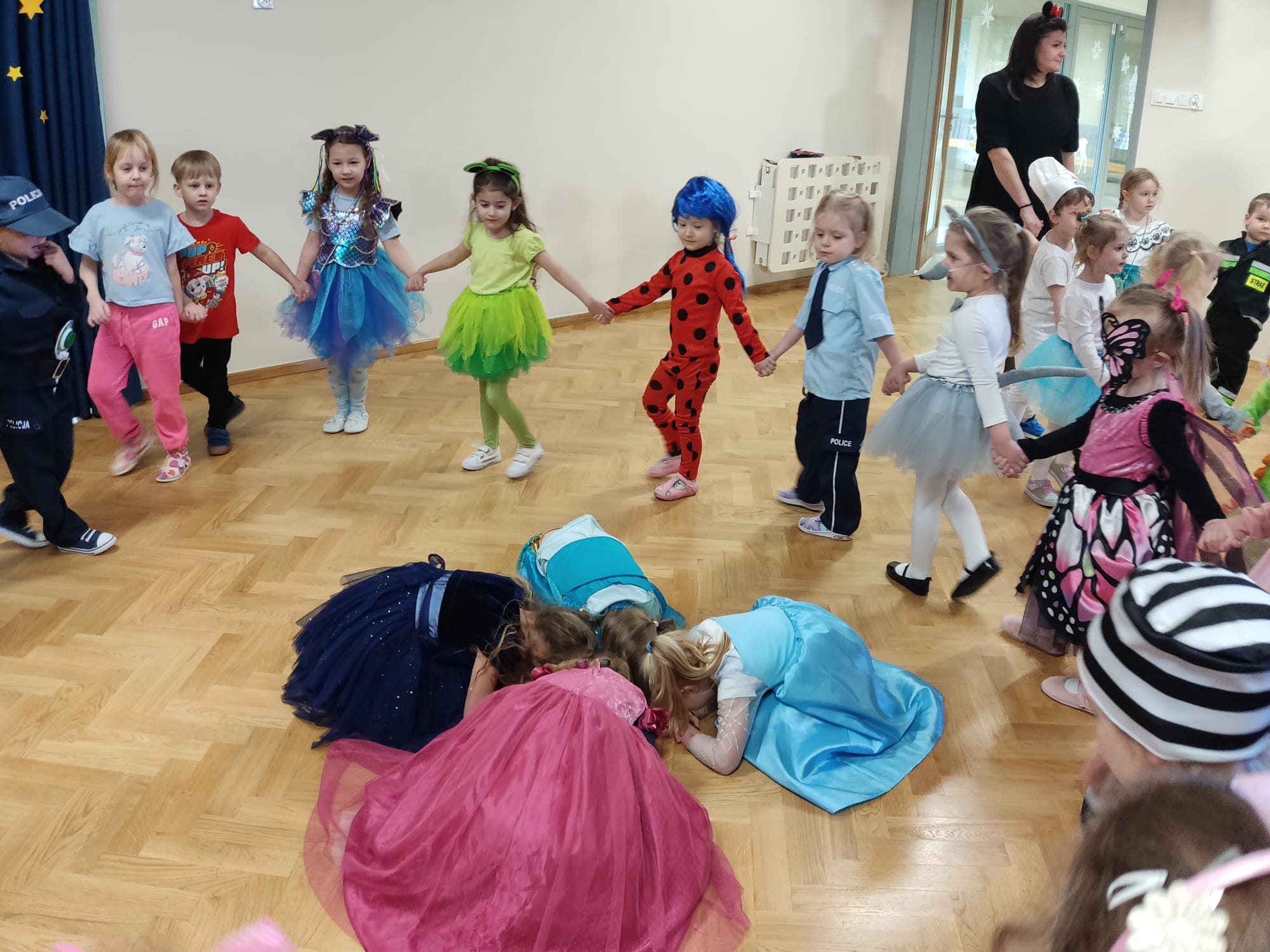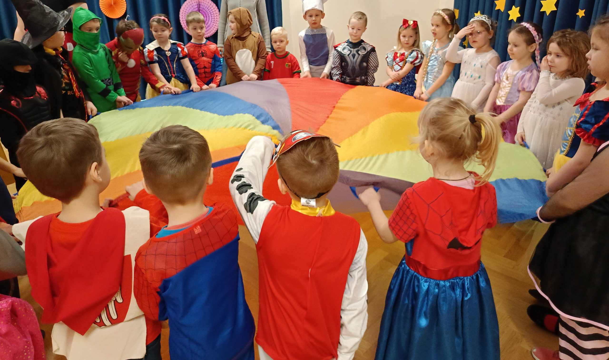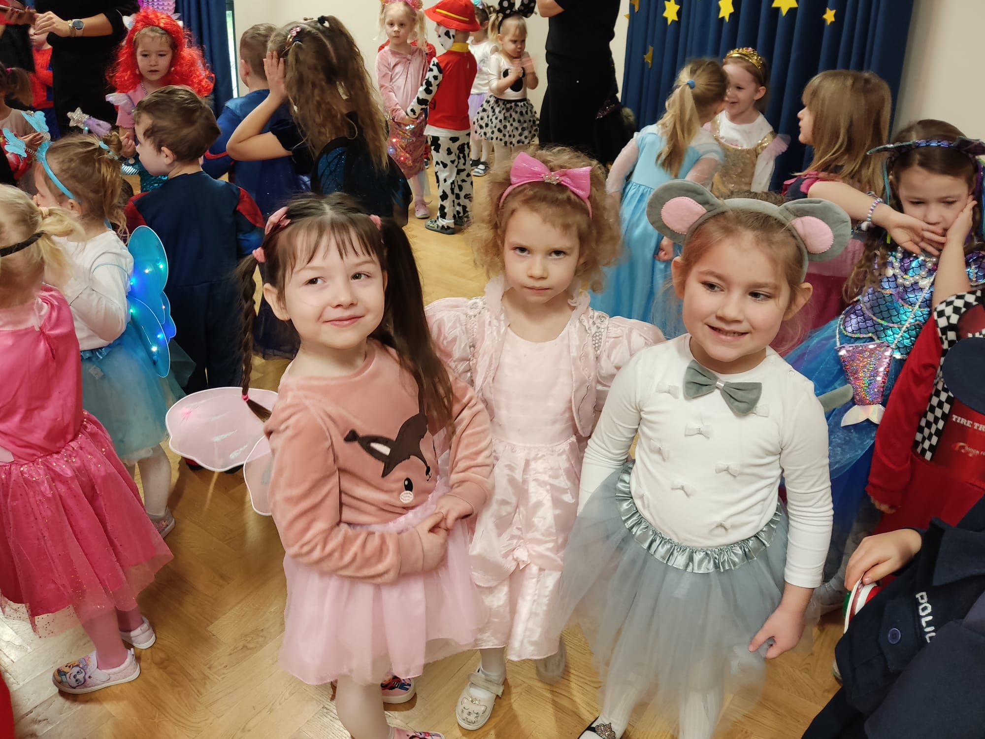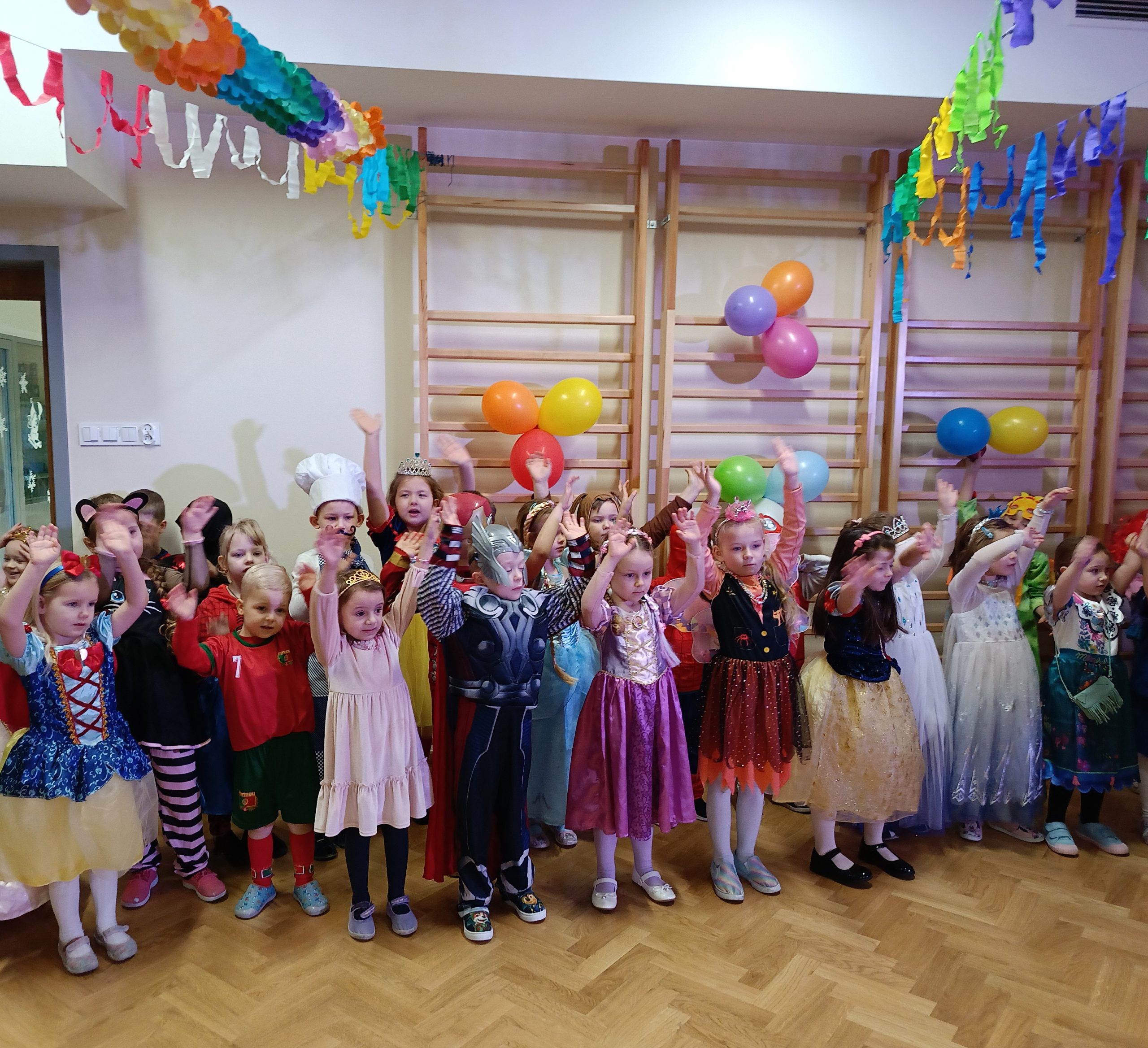 Ależ to był piękny bal! W naszym przedszkolu 24 lutego odbył się prawdziwy bal karnawałowy. Tego dnia sala widowiskowa zamieniła się w salę balową. Na tę wyjątkową okazję zaprosiliśmy do prowadzenia balu – Panią Anetkę i Pana Krzysztofa Krawczyków, którzy zachęcali wszystkich do wspaniałej zabawy i tańca. W tym dniu przenieśliśmy się do „Wielkiej krainy bajek”. Na balu, więc obok księżniczek, motylków, żabek, myszek, wróżek, rycerzy, policjantów, czy piratów, pojawiły się postacie z ulubionych bajek: Pszczółka Maja, Królewna Śnieżka, Syrenka, Spiderman, Super Mario, Biedronka i Czarny Kot, Psi Patrol, Elza. Po pięknej prezentacji strojów rozpoczęły się tańce przy rytmach wesołej muzyki, które były przeplatane zabawami, korowodami i konkursami. Po intensywnej zabawie przyszedł czas na chwilę odpoczynku i słodki poczęstunek, za który serdecznie dziękujemy Rodzicom. Na stołach czekały pyszne przekąski, owoce oraz soki, które dodały energii na kolejne taneczne szaleństwa. Przy gorących rytmach muzyki wszyscy bawili się wyśmienicie, a uśmiech nie znikał z twarzy przedszkolaków. Do domu dzieci wracały we wspaniałych humorach, dzieląc się z rodzicami swoimi przeżyciami. Bal zakończył się pamiątkowymi zdjęciami, które będą piękną pamiątką tego radosnego dnia. To był dzień pełen muzyki i wspaniałej zabawy!