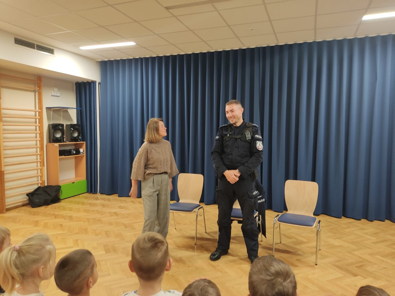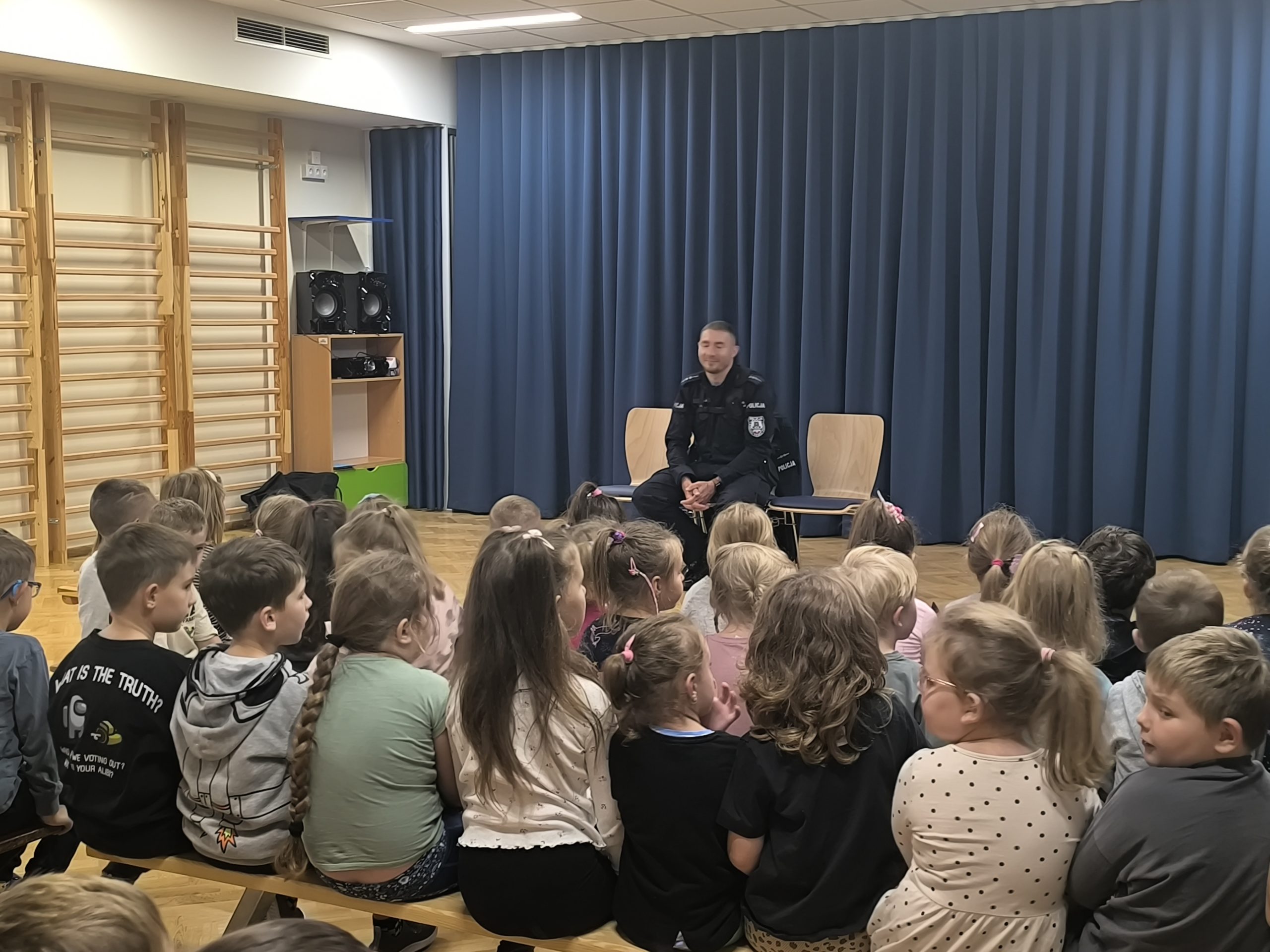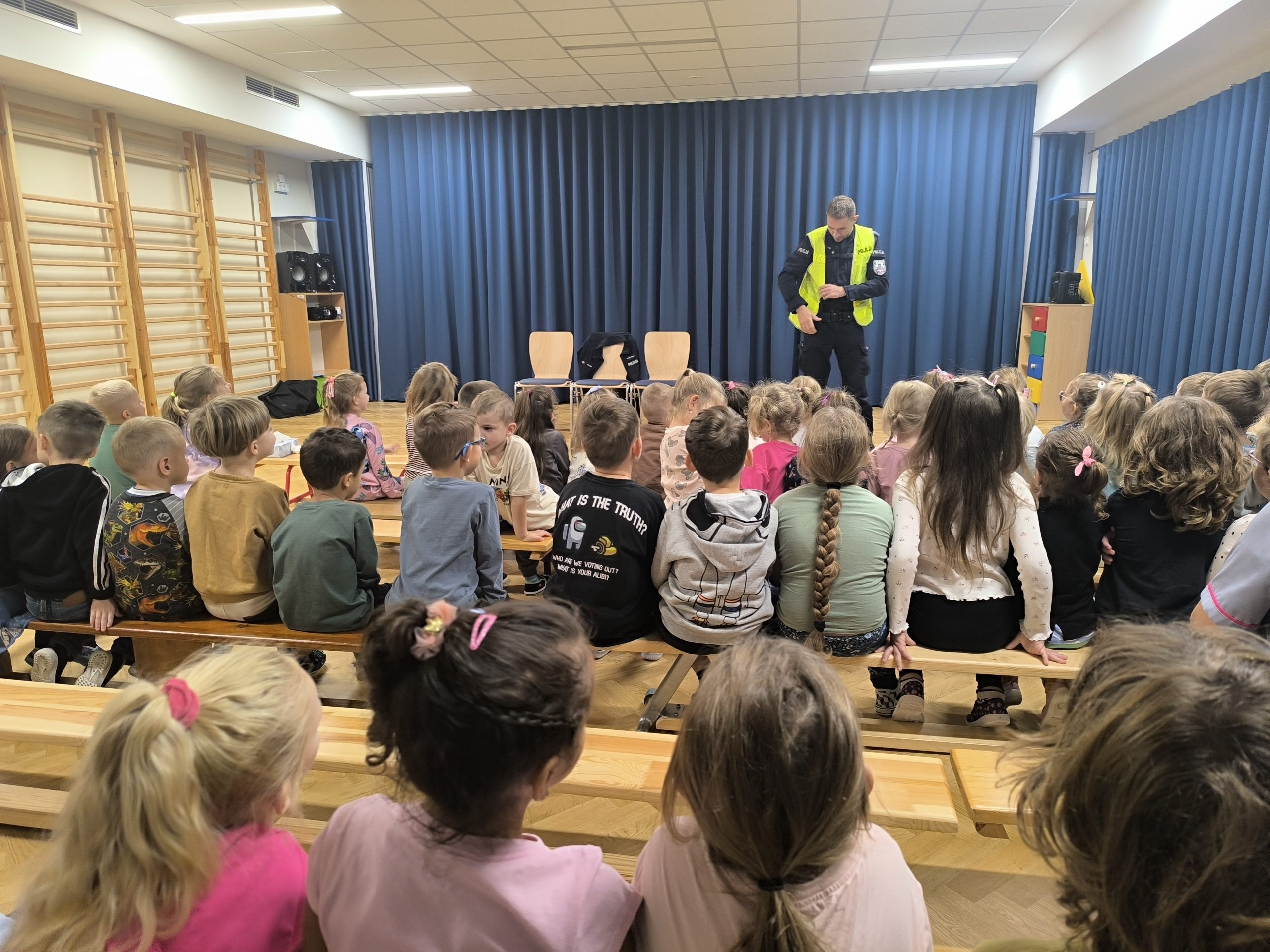 W naszym przedszkolu odbyło się wyjątkowe spotkanie z funkcjonariuszem Komisariatu Policji Tarnów-Centrum – asp. Pawłem Jędrysem. Podczas wizyty policjant w przystępny i interesujący sposób przybliżył dzieciom podstawowe zasady bezpiecznego poruszania się po drogach. Przedszkolaki dowiedziały się, jak prawidłowo przechodzić przez jezdnię – zarówno na przejściach z sygnalizacją świetlną, jak i bez niej. Funkcjonariusz zwrócił uwagę na zasady bezpiecznego podróżowania samochodem, podkreślając, jak ważne jest zapinanie pasów bezpieczeństwa oraz jazda w foteliku dostosowanym do ich wieku i wzrostu. Dzieci usłyszały również o konieczności noszenia ubrań i obuwia z elementami odblaskowymi, szczególnie w okresie jesienno-zimowym. Spotkanie było także okazją do poznania specyfiki pracy policjanta