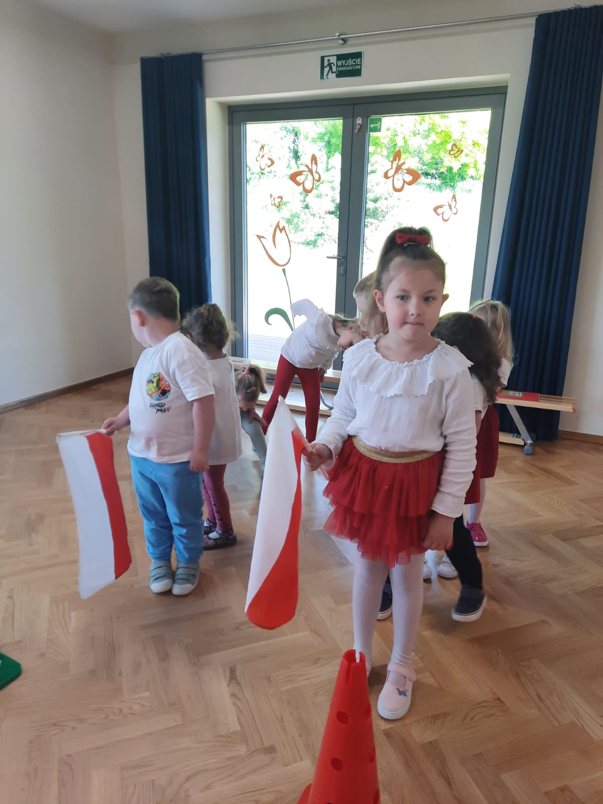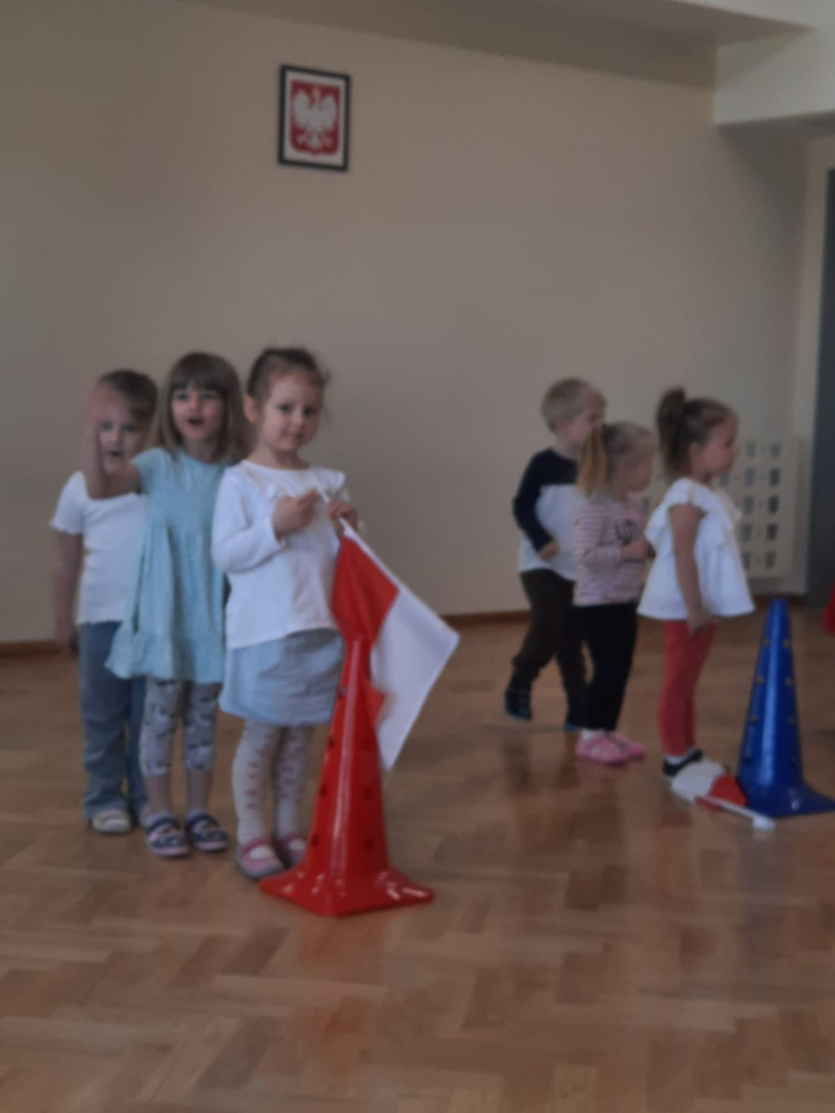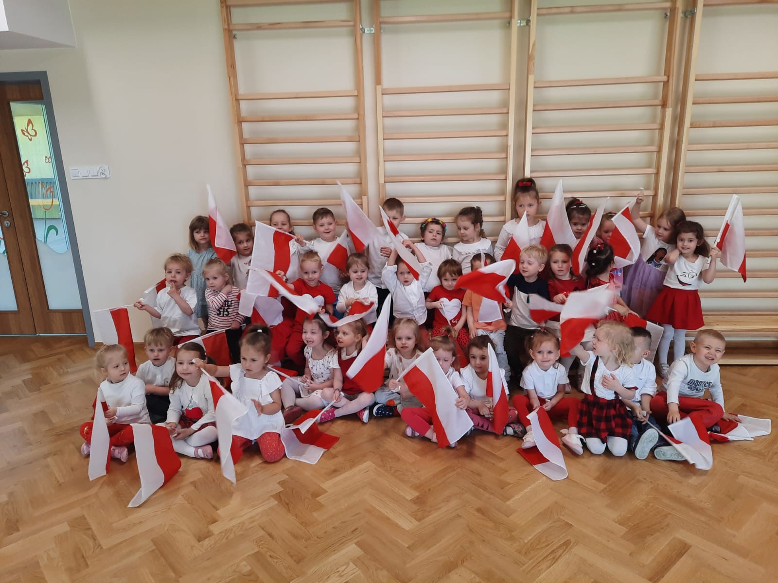 W grupie dzieci młodszych I i II prowadzone były zajęcia o tematyce patriotycznej, polskim godle, barwach narodowych oraz hymnie Polski. Przedszkolaki w uroczysty sposób recytowały wiersz „Barwy ojczyste” Czesława Janczarskiego oraz zaśpiewały wspólnie hymn Polski. Zajęcia te były doskonałą okazją, aby zaszczepić w dzieciach miłość do naszej Ojczyzny i dumę z bycia Polką i Polakiem. Misie i Jeżyki uczciły Dzień Flagi zawodami sportowymi na sali gimnastycznej. Ich celem było nie tylko rozwijanie sprawności fizycznej dzieci, ale także nauka współdziałania oraz zdrowej rywalizacji. Na początku wszystkie dzieci zrobiły rozgrzewkę, a następnie przystąpiły do wesołej rywalizacji z chorągiewkami. Na koniec przedszkolaki utworzyły flagę Polski z białych i czerwonych kartek.