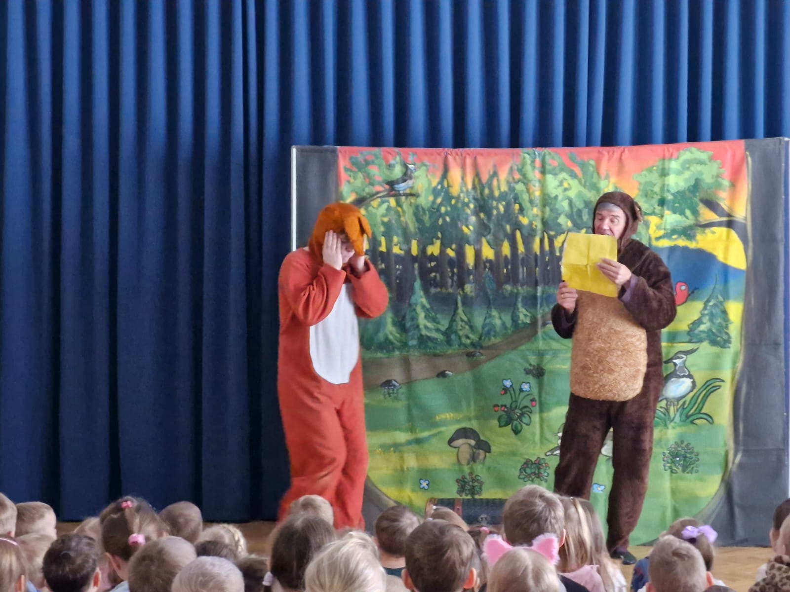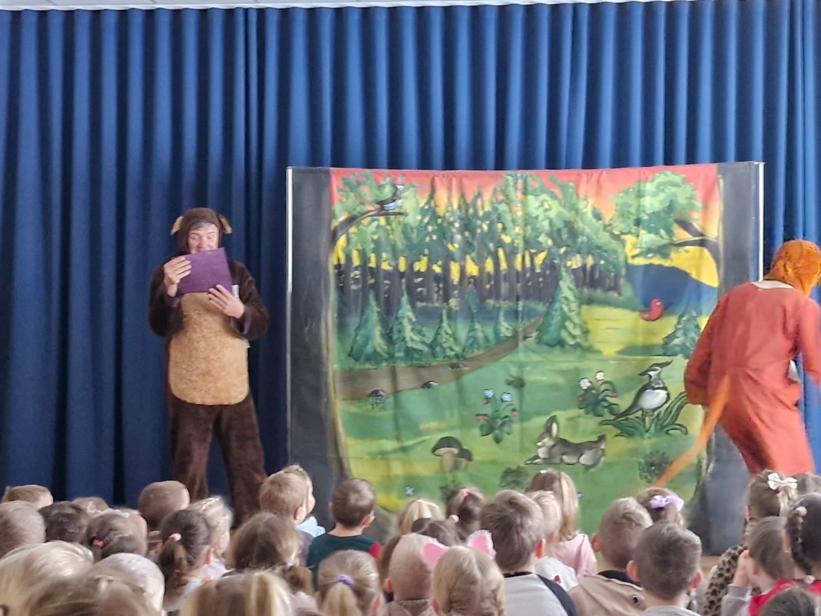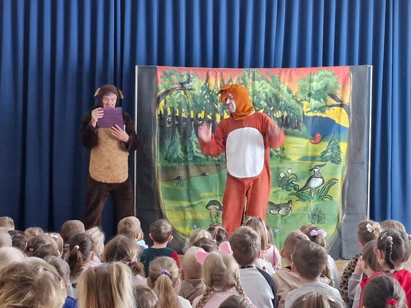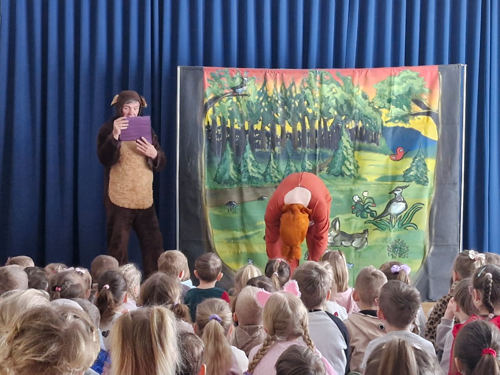 16 lutego 2025 r. nasze przedszkole odwiedzili aktorzy z Teatru „Horyzont” z Krakowa, prezentując dzieciom wyjątkowy spektakl pt.: „Brzydal. O Misiu Brzuszatku”.Na leśnej polanie sympatyczny miś Brzuszatek opowiadał dzieciom o swojej pasji do czytania książek oraz o tym, jak wiele można się z nich nauczyć. Całą rozmowę podsłuchiwał lis Gagatek, który początkowo wyśmiewał misiowy brzuszek oraz jego chęć poznawania świata i zdobywania wiedzy. Wspólna przygoda bohaterów odmieniła liska, który poznał wartość prawdziwej przyjaźni i obiecał się poprawić. Dzieci aktywnie uczestniczyły w przedstawieniu i z dużym