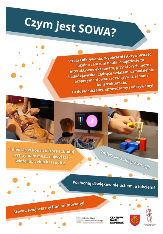 SOWA – Strefa Odkrywania, Wyobraźni i Aktywności – to lokalne centrum nauki, gdzie dzieci mogą eksperymentować i odkrywać świat poprzez zabawę. Znajdują się tu interaktywne eksponaty pozwalające m.in. badać zjawiska fizyczne, budować konstrukcje, mierzyć siłę grawitacji, tworzyć animacje i poznawać dźwięki w niezwykły sposób.