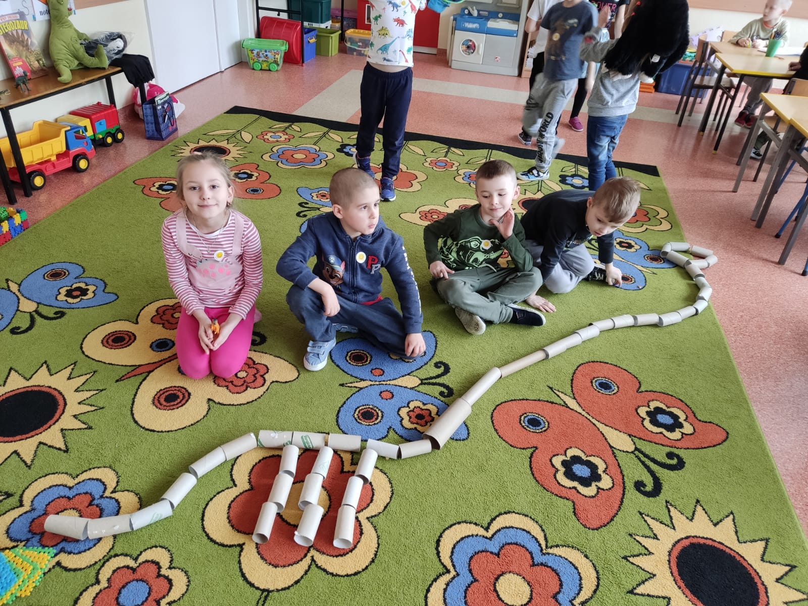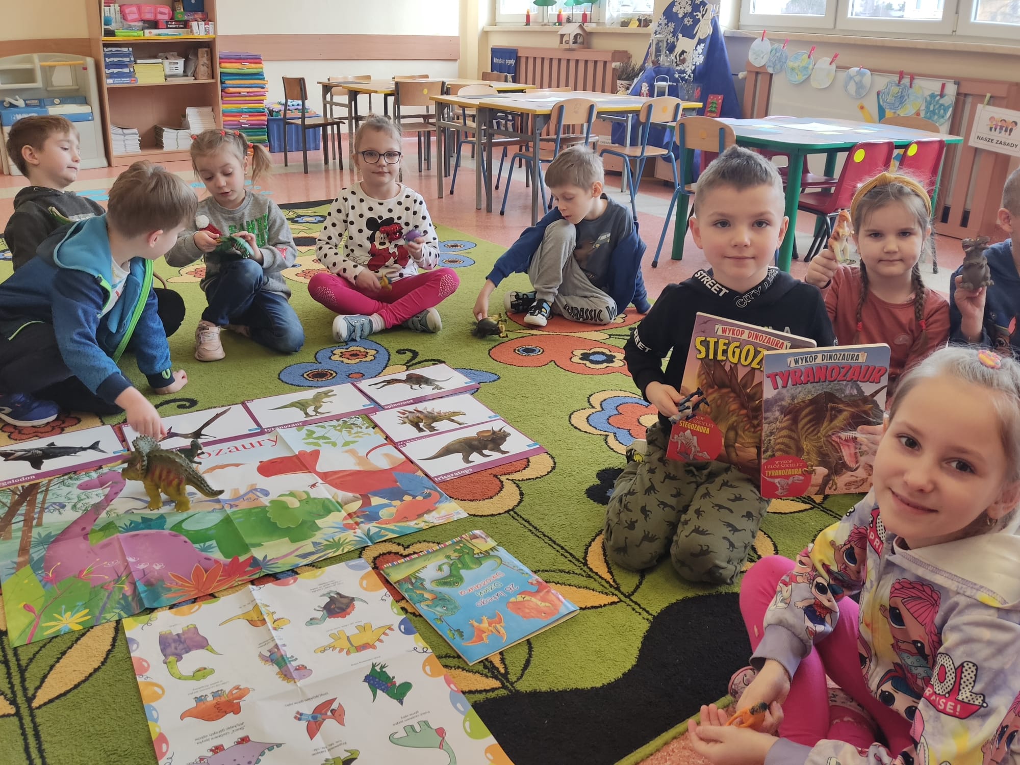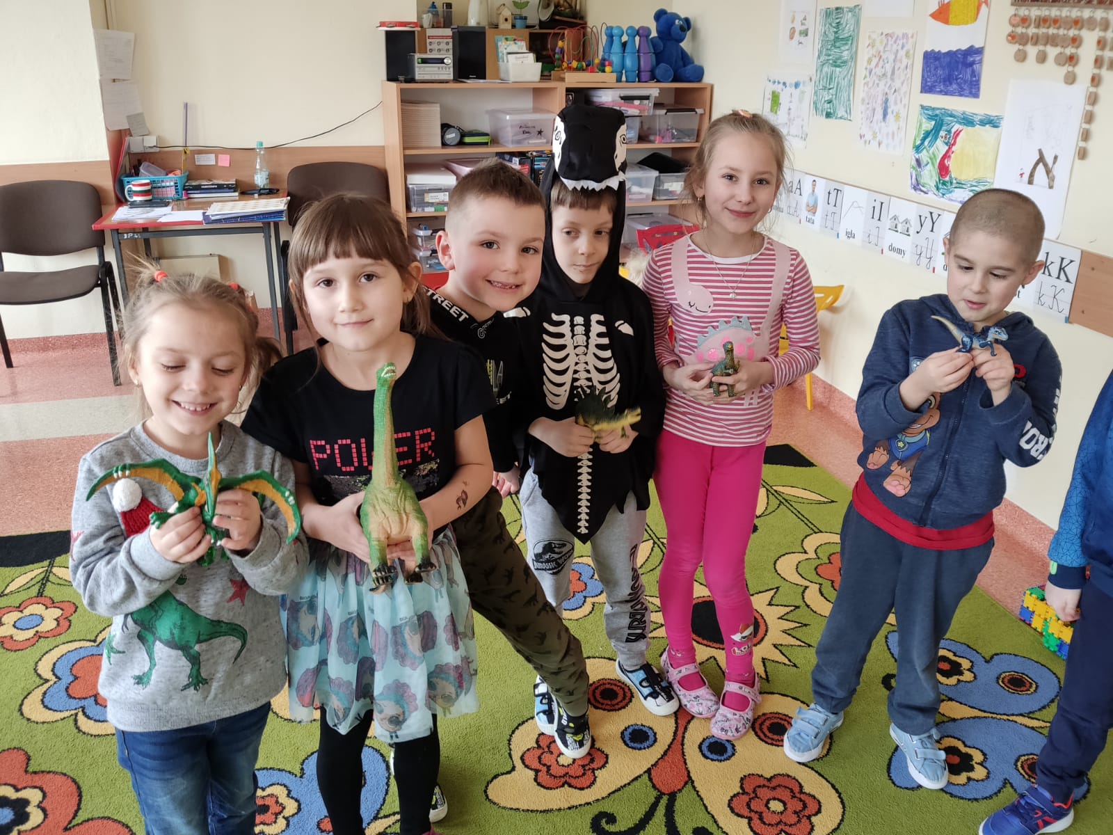 Na koniec miesiąca przypada dość nietypowe święto. Wszystkich dzieci fascynują dinozaury, dlatego postanowiono wykorzystać ich zainteresowania i w poniedziałek – 27 lutego obchodzić Światowy Dzień Dinozaura. Z tej okazji zorganizowano zajęcia, które wprowadziły dzieci w prehistoryczny świat i przybliżyły im życie tych wyjątkowych gadów. Dzieci wykazały olbrzymie zainteresowanie tematem. Zajączki wymieniały charakterystyczne cechy dinozaurów, chodziły po dużych i małych śladach pozostawionych przez te wielkie stwory. W skupieniu słuchały odgłosów „Jurajskiego parku” – dźwięków z prehistorycznego lasu. Przedszkolaki odgadywały zagadki, brały udział w zabawach matematycznych oraz ruchowo-naśladowczych. Podczas zajęć utrwaliły pojęcia z orientacji przestrzennej. Ponadto starszaki miały możliwość odszukania poprawnych nazw przyniesionych z domu eksponatów w encyklopedii oraz czasopismach. Z łatwością rozpoznawały nazwy przyniesionych z domu dinozaurów, dzieląc się swoją wiedzą. Nie zabrakło również ciekawych zabaw ruchowych oraz plastycznych związanych z tematyką zajęć. Na koniec zajęć dzieci obejrzały krótką animację o dinozaurach. Zajęcia w tym dniu z pewnością pogłębiły wiedzę przedszkolaków, a w niektórych rozbudziły nową pasję.