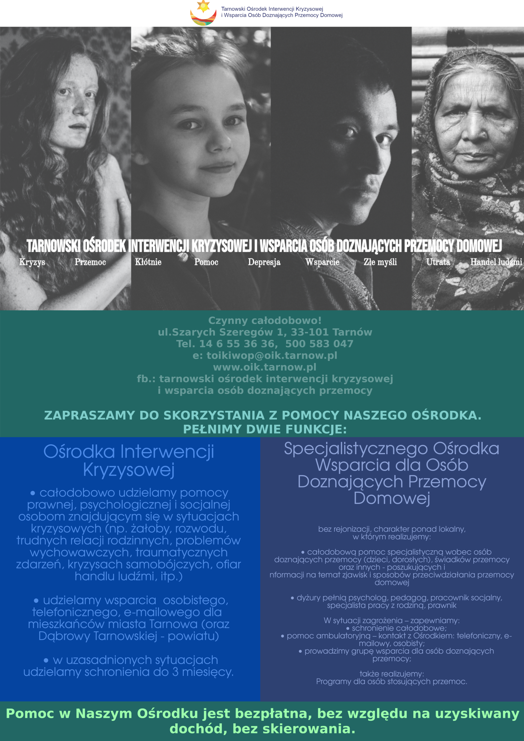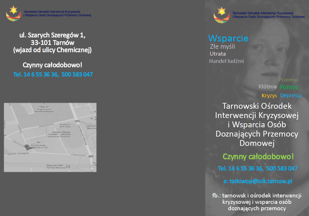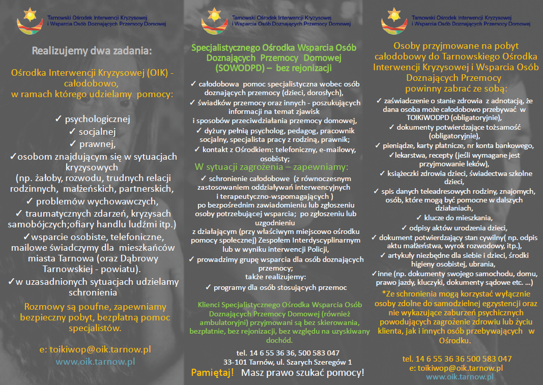 Tarnowski Ośrodek Interwencji Kryzysowej i Wsparcia Osób Doznających Przemocy Domowej oferuje bezpłatną, całodobową pomoc dla osób znajdujących się w trudnej sytuacji życiowej – m.in. po stracie bliskiej osoby, w kryzysach rodzinnych, wychowawczych, małżeńskich, w sytuacjach przemocy domowej czy handlu ludźmi.