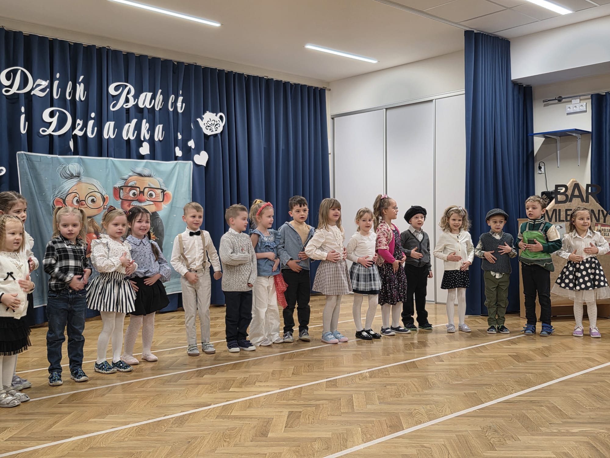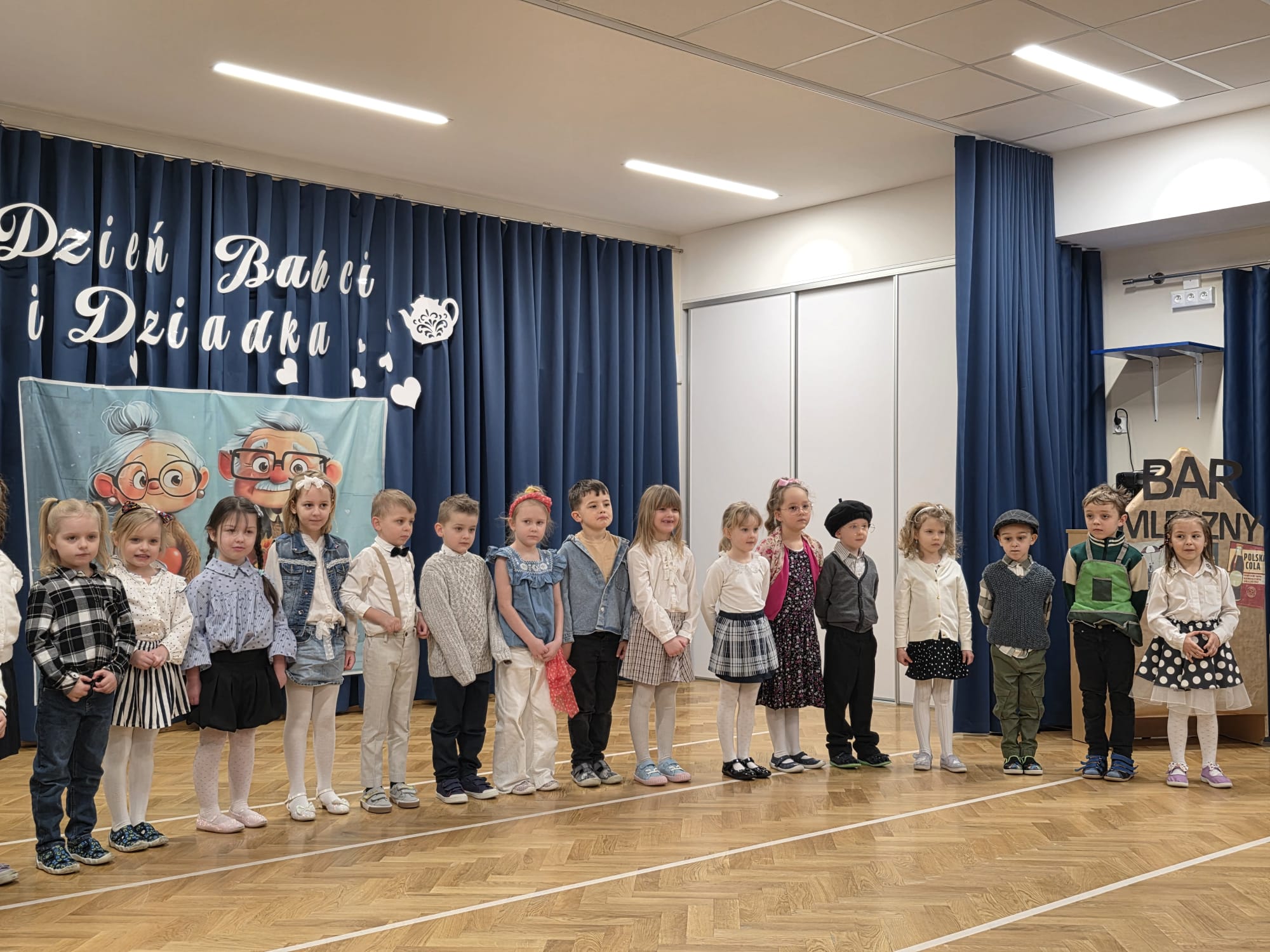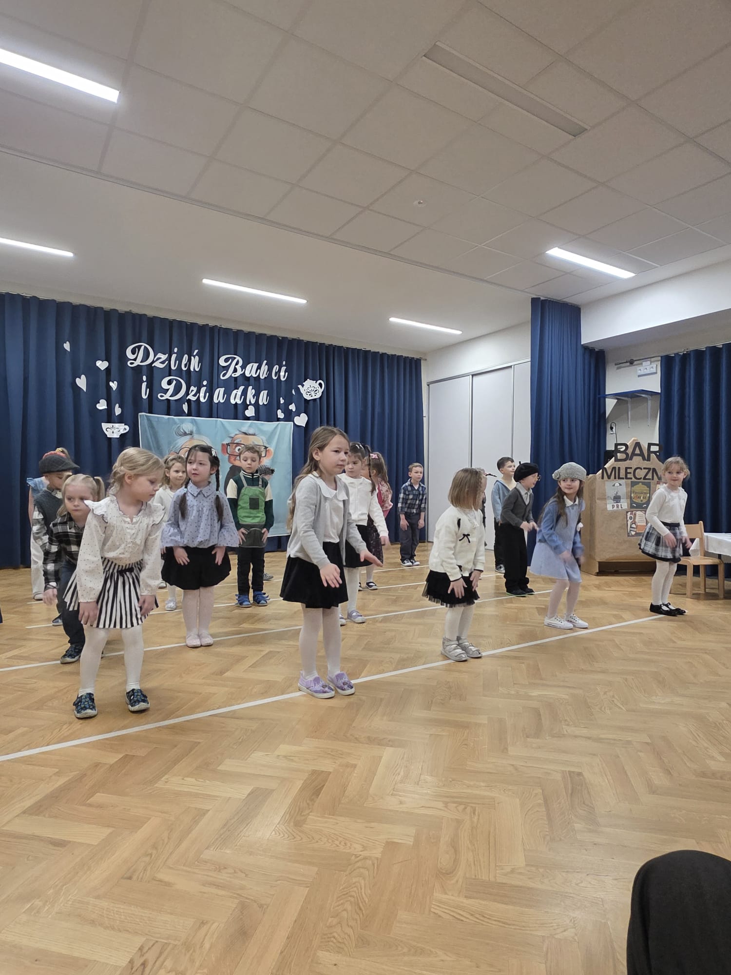 i Dziadka, na którą zaprosiły swoich najbliższych. Przedszkolaki zaprezentowały inscenizację pt. „Historia Babci i Dziadka z czasów PRL”, przenosząc gości w czasy ich młodości. Występ pełen był emocji, uśmiechu i wzruszeń. Dzieci z dużą radością odgrywały swoje role, śpiewały piosenki oraz pokazywały swoje zdolności taneczne. Po części artystycznej dzieci złożyły serdeczne życzenia i wręczyły przygotowane przez siebie upominki, będące wyrazem ich miłości i wdzięczności.
