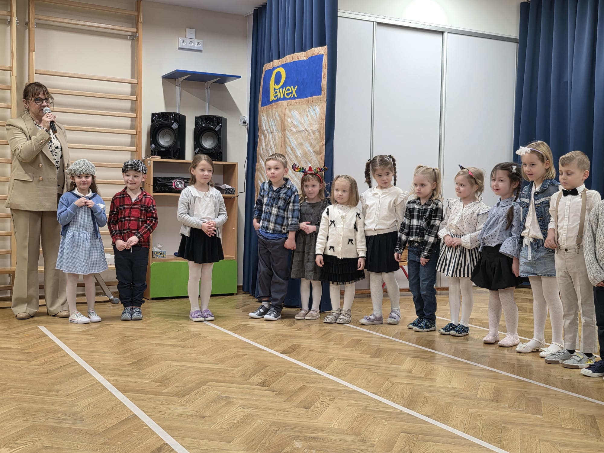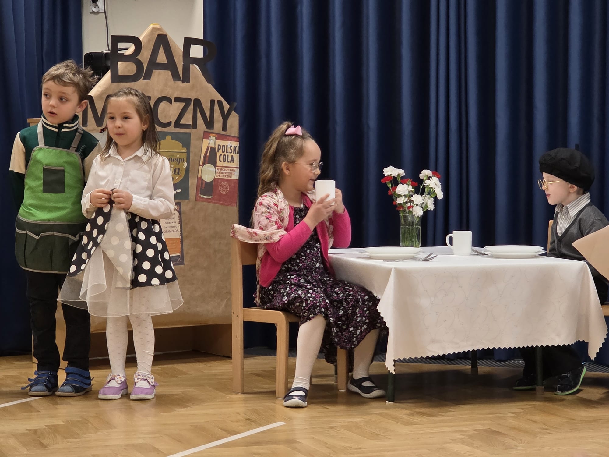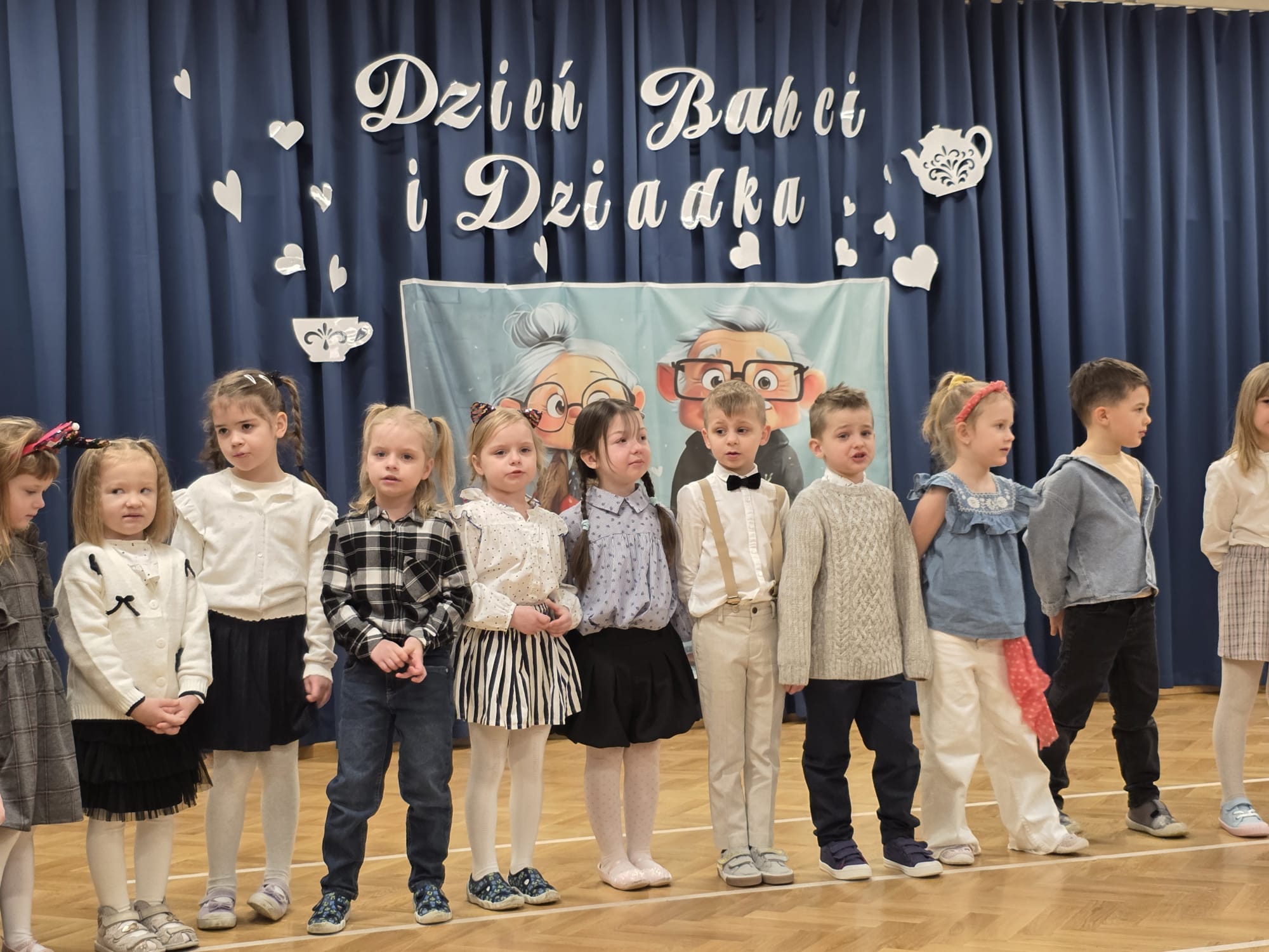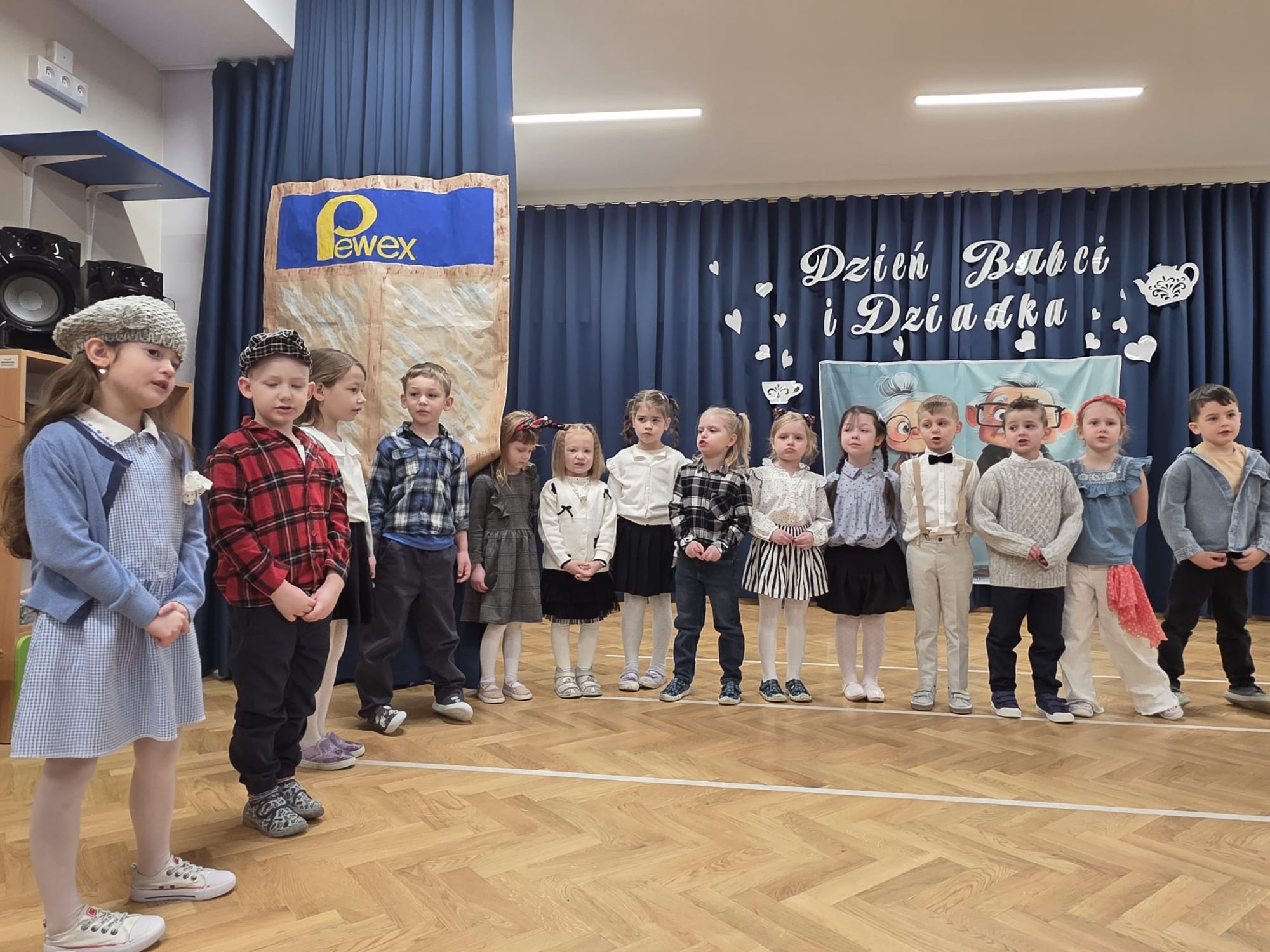 i Dziadka, na którą zaprosiły swoich najbliższych. Przedszkolaki zaprezentowały inscenizację pt. „Historia Babci i Dziadka z czasów PRL”, przenosząc gości w czasy ich młodości. Występ pełen był emocji, uśmiechu i wzruszeń. Dzieci z dużą radością odgrywały swoje role, śpiewały piosenki oraz pokazywały swoje zdolności taneczne. Po części artystycznej dzieci złożyły serdeczne życzenia i wręczyły przygotowane przez siebie upominki, będące wyrazem ich miłości i wdzięczności.
