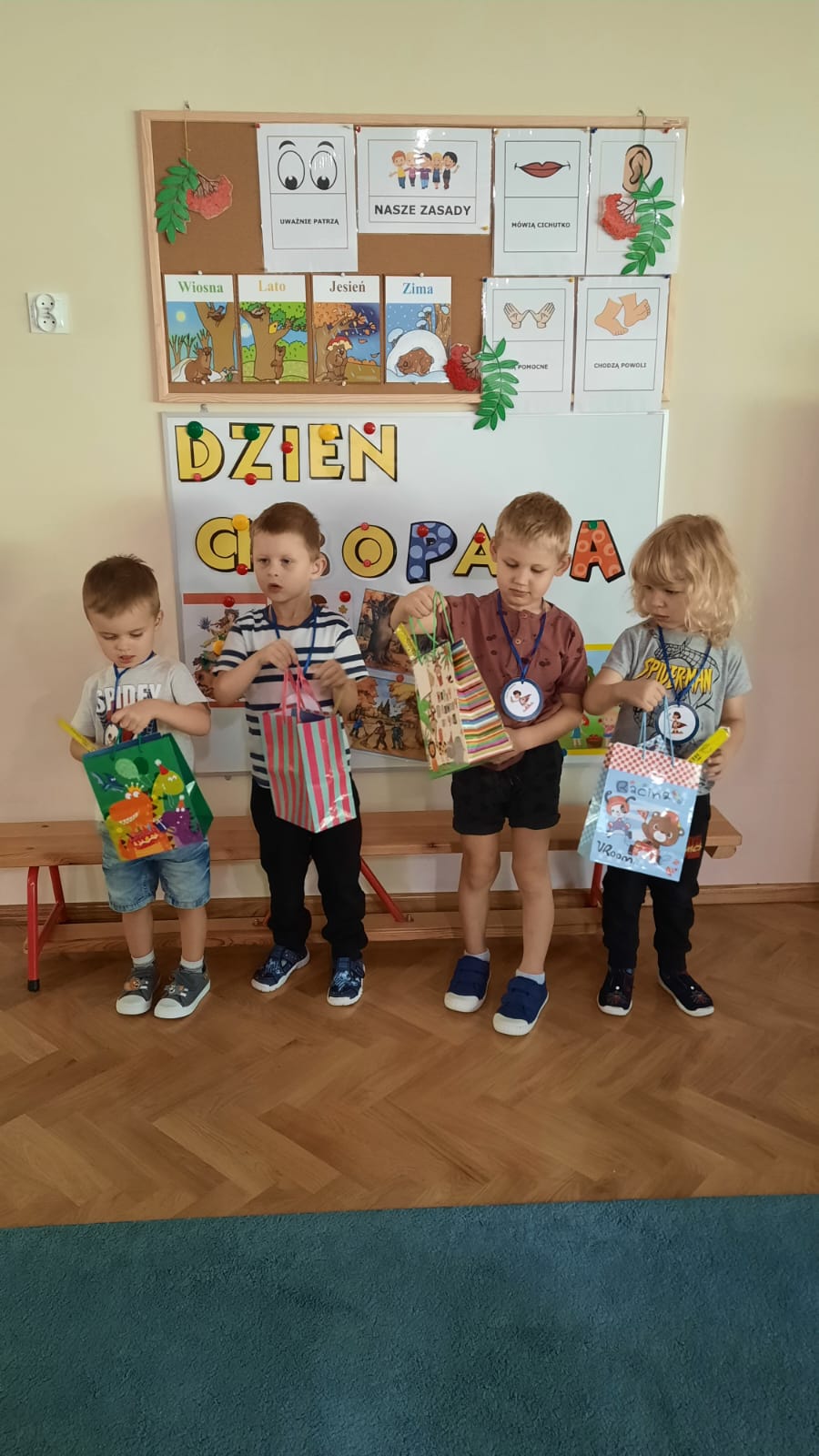 Kolejne święto w naszej grupie – Dzień wszystkich SUPER CHŁOPCÓW. Była to okazja do złożenia im życzeń przez koleżanki i panie z grupy oraz wręczenia prezentów. Na szyjach chłopaków zawisły także okolicznościowe medale i krawaty. Dzień umiliła owocowa uczta podczas której dzieci chętnie zajadały się witaminkami w naturalnej postaci.