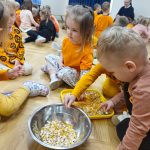 Nie zabrakło również zabaw sensorycznych rozwijających zmysły i ciekawość świata. W jednej z nich dzieci wyszukiwały pestek dyni wśród mieszanki grochu, soczewicy, ziaren słonecznika i płatków kukurydzianych. Zabawa ta sprawiła im ogromną frajdę, a przy okazji uczyła cierpliwości, skupienia i odwagi w poznawaniu nowych faktur.