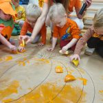 Na zakończenie dnia przedszkolaki zamieniły się w małych artystów. Każda grupa stworzyła ogromną, pomarańczową dynię, którą dzieci z zapałem stemplowały pieczątkami zrobionymi z prawdziwych kawałków dyni.