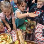 i wspólnym śpiewaniu. Przedszkolaki dowiedziały się, skąd biorą się jabłka i co można z nich przygotować. Poznały wartości odżywcze tego owocu- dowiedziały się, że zawierają one wiele witamin i minerałów, które wzmacniają odporność i wpływają na dobre samopoczucie. Rozmawialiśmy także o tym jak ważne jest codzienne spożywanie owoców i warzyw, by być zdrowym i pełnym energii. Największą atrakcją była obserwacja wyciskania soku w wyciskarce wolnoobrotowej oraz degustacja pysznego, świeżo wyciśniętego soku jabłkowego. To był dzień pełen wiedzy i zdrowych smaków.