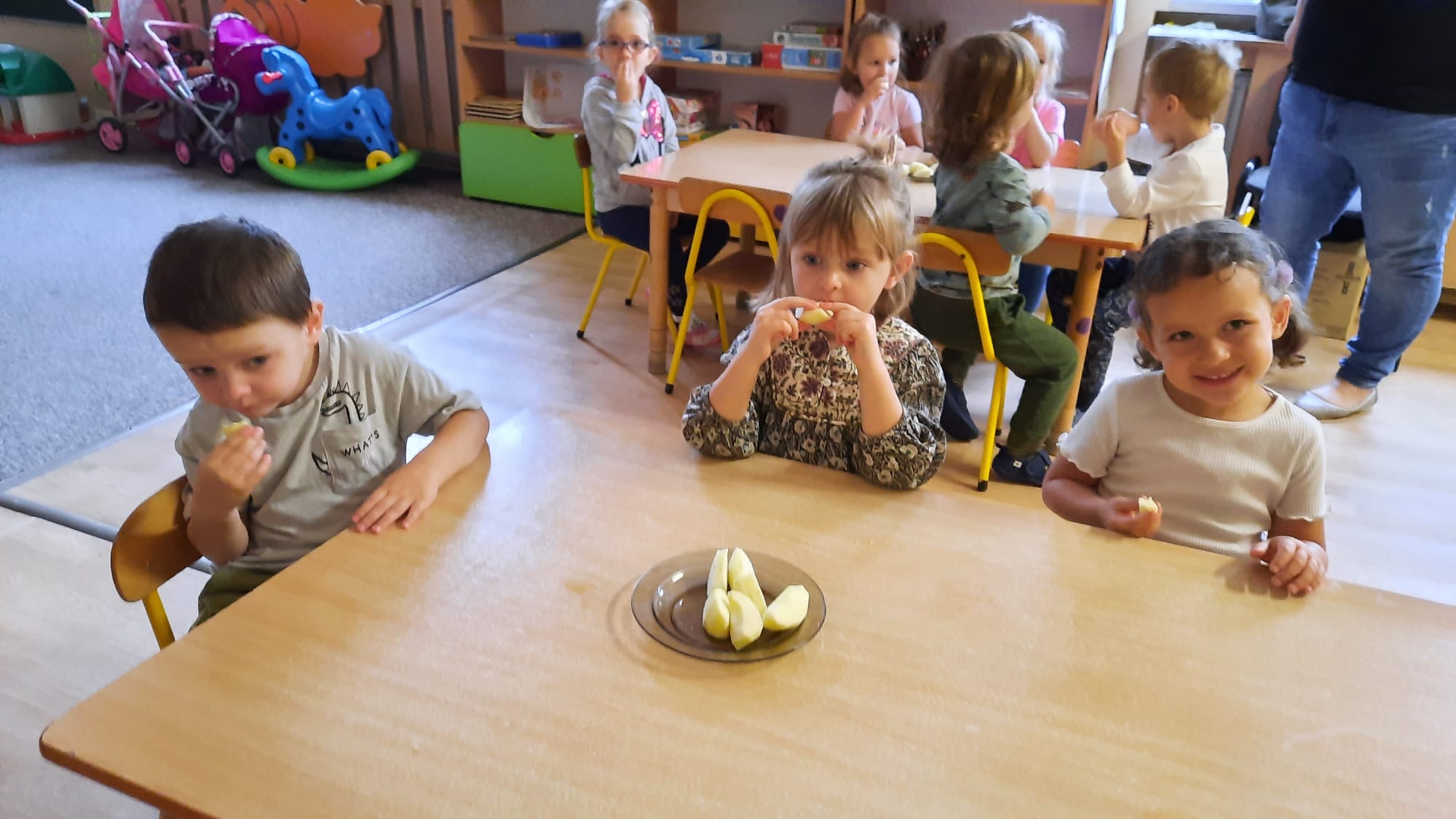 28 września wspólnie z grupą ,,Wiewiórki” obchodziliśmy Światowy Dzień Jabłka. Dzieci poznały wiele ciekawostek na temat jabłek. Słuchały pięknego opowiadania o jabłkach, wykonały zadanie a także wzięły udział w zabawach tańcach i konkurencjach z jabłkami. Milusińscy na koniec wykonali piękne prace plastyczne oraz zajadali się pysznym jabłkami. Ten dzień minął jabłkowo.