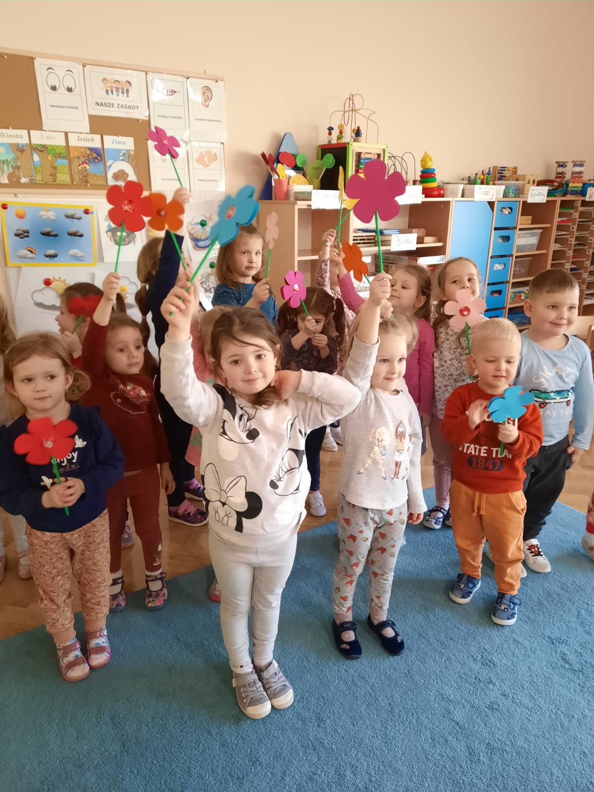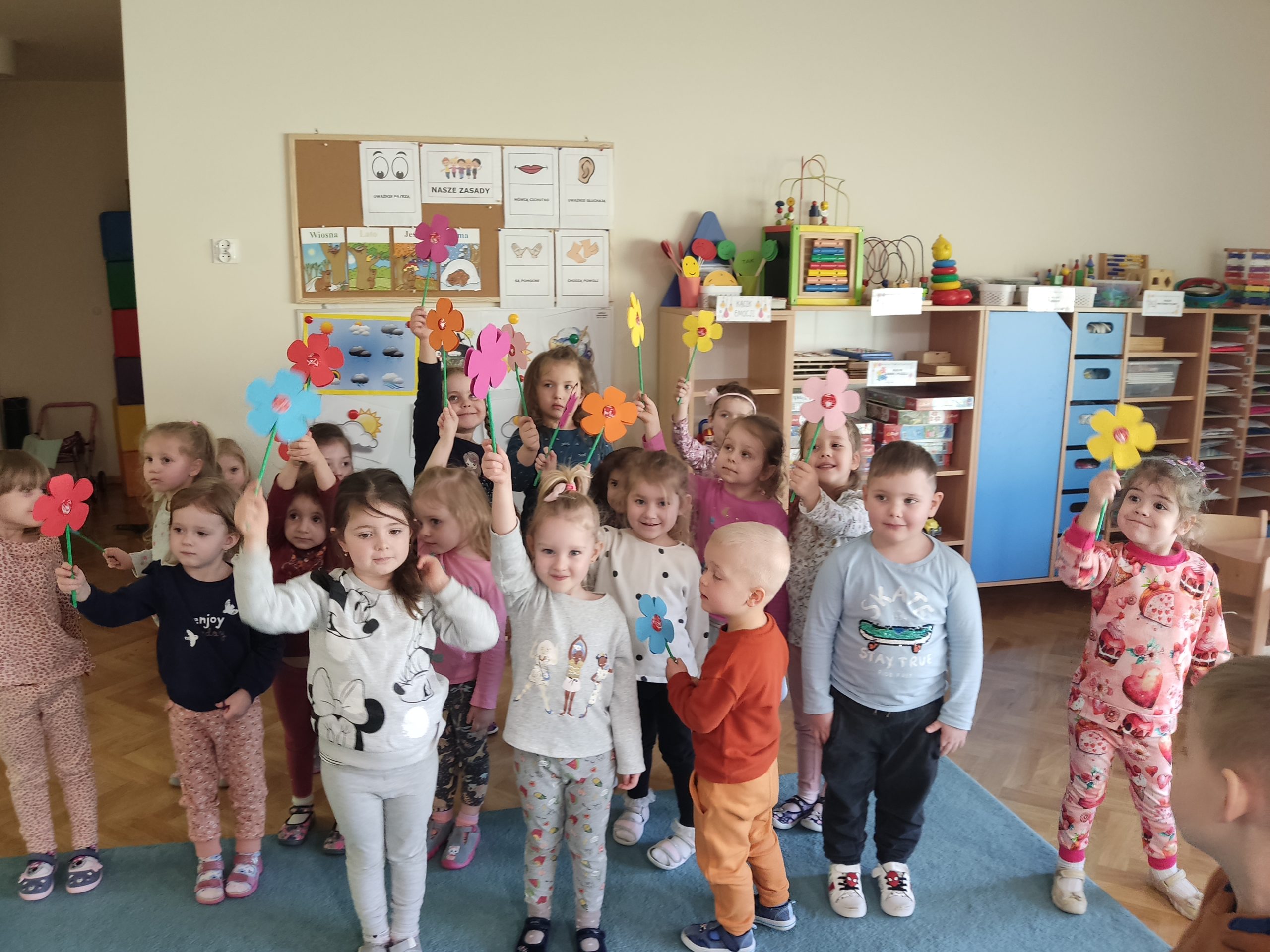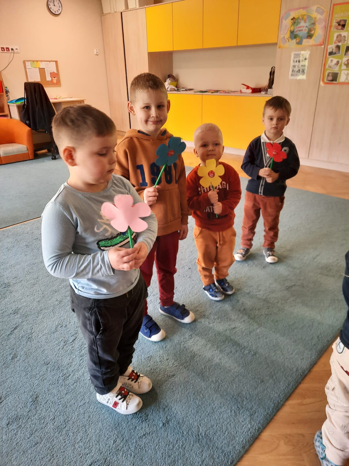 8 marca to wyjątkowy dzień w roku, ważny dla wszystkich kobiet, zarówno tych dużych, jak i małych. W grupie „Misiów” nie mogło zabraknąć chwil świętowania tego pięknego dnia. Były zabawy, miłe słowa, pyszne ciasteczka i kwiaty. Radosna atmosfera panowała już od samego rana. Chłopcy ze szczególnym zaangażowaniem starali się, aby ten dzień uczynić wyjątkowo miłym. Jako mali dżentelmeni wyręczali dziewczynki w codziennych obowiązkach między innymi w porządkowaniu sali po zabawie. Z pomocą swoich pań przygotowali dla dziewczynek kwiatuszki, „medale wspaniałej dziewczynki” oraz słodkie niespodzianki. Chłopcy wręczając kwiaty składali życzenia koleżankom i paniom, następnie zaprosili dziewczynki na małe przyjęcie. Na dziewczęcych buziach uśmiech gościł przez cały dzień, a chłopcy zachowywali się wyjątkowo, byli mili i uczynni.