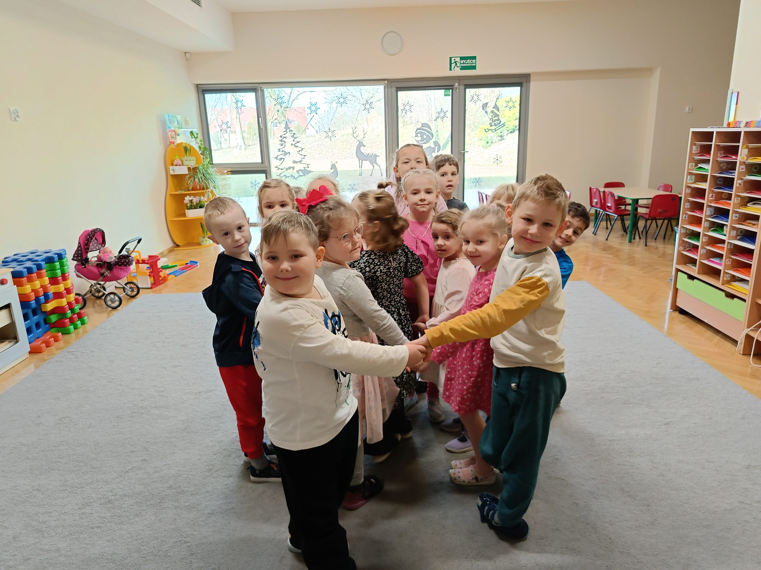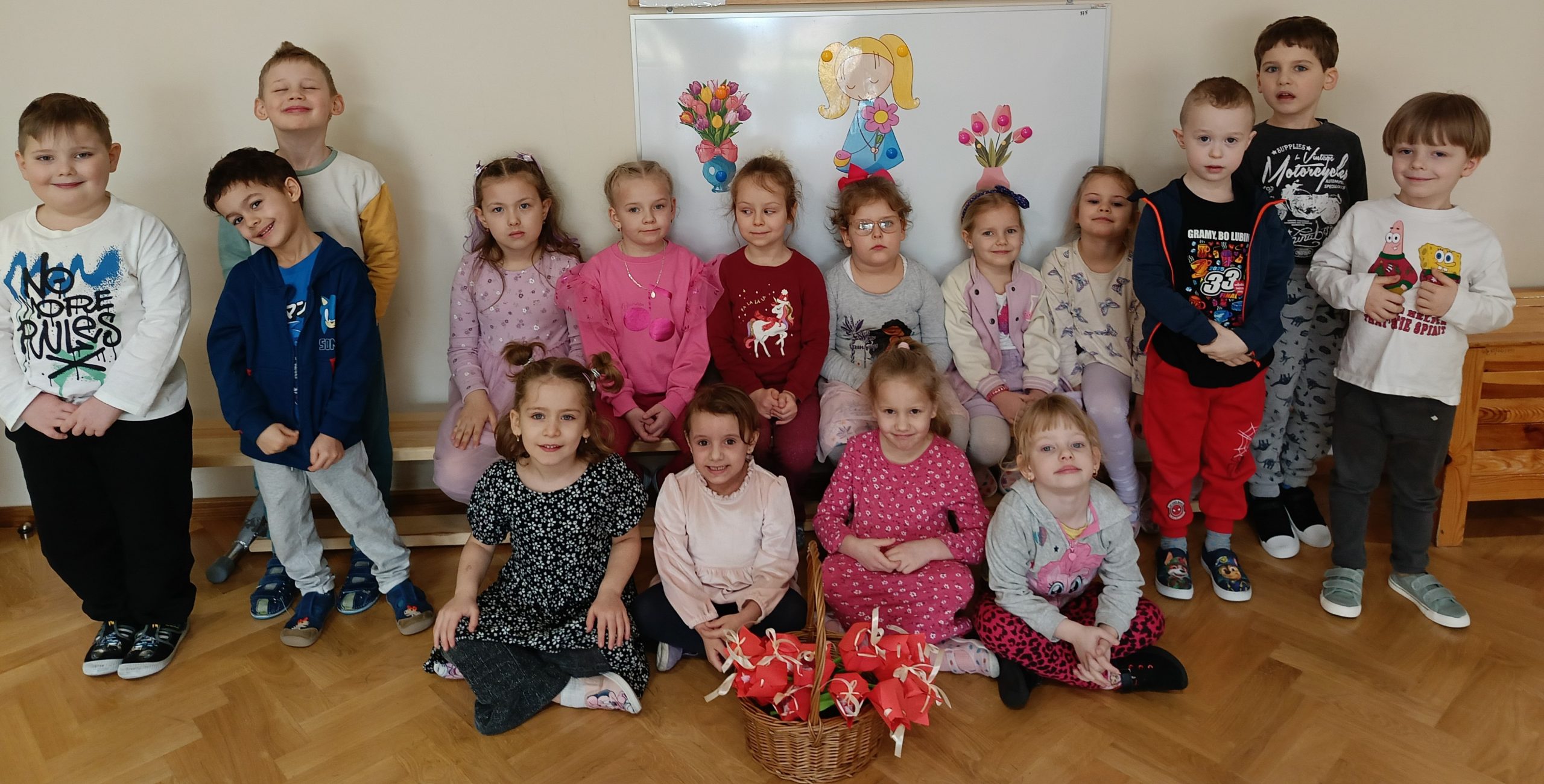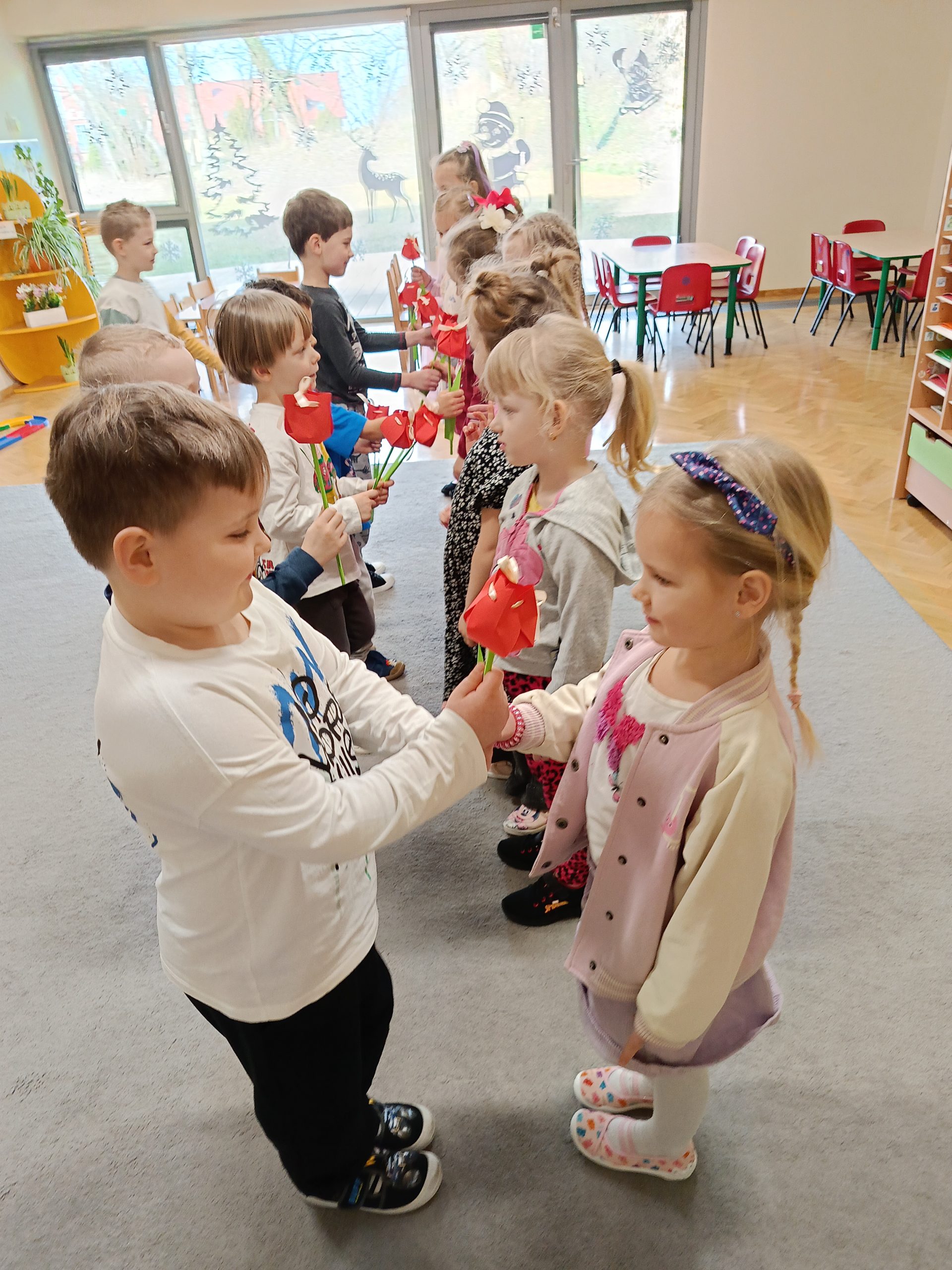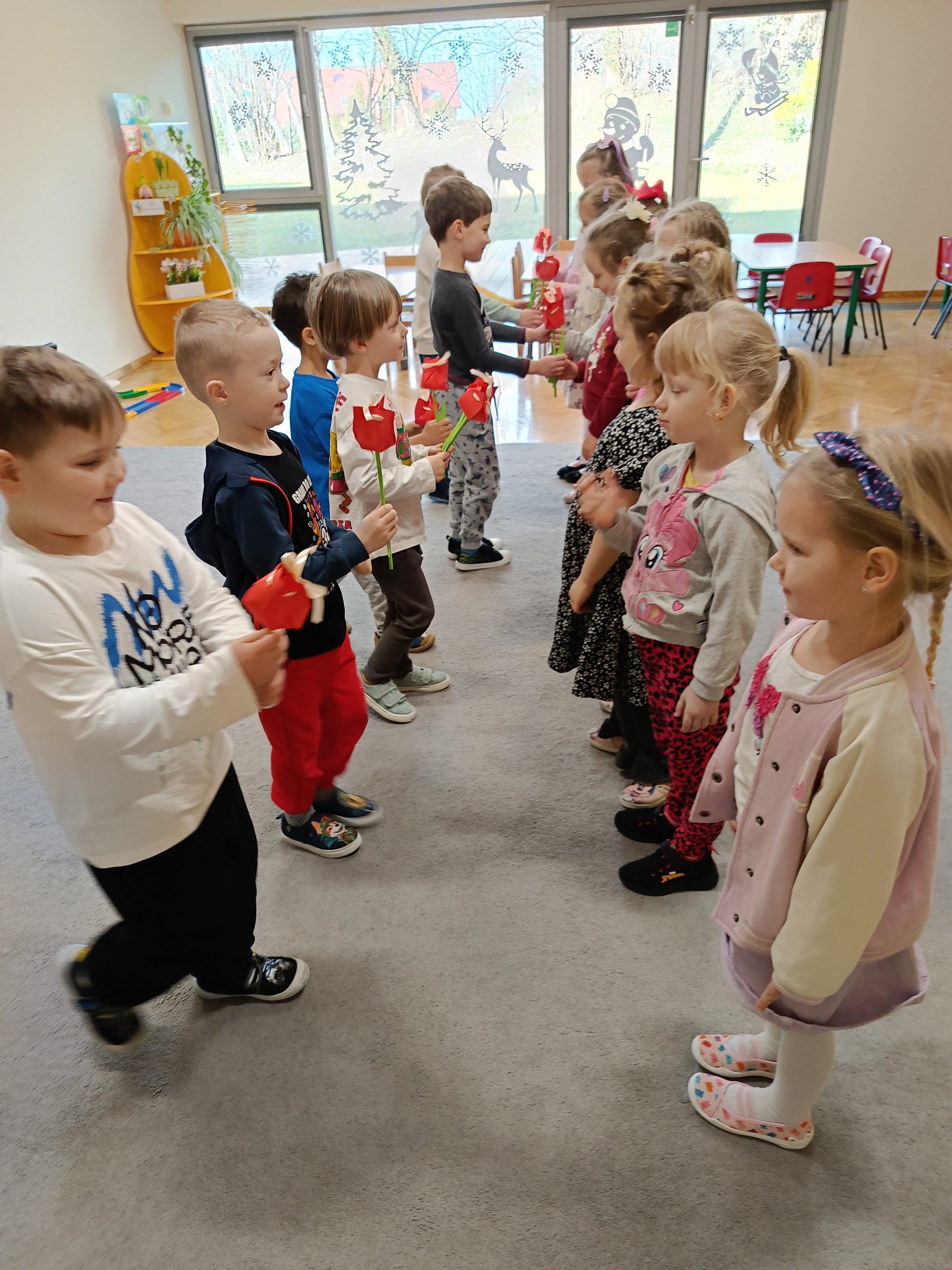 Chłopcy z wielkim zaangażowaniem złożyli swoim koleżankom piękne życzenia, a także wręczyli im  tulipany. W sali panowała ciepła i radosna atmosfera, a na twarzach wszystkich dzieci gościły uśmiechy. Nie zabrakło także wspólnych zabaw i niespodzianek, które umiliły ten wyjątkowy dzień.