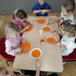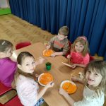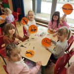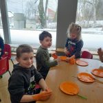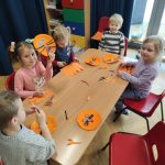 o kotku. Każde dziecko otrzymało papierowy talerzyk, który stanowił głowę kota. W pierwszym etapie pracy dzieciaki malowały talerzyk farbami. W drugim etapie pracy z plasteliny wykonały oczka i nos. Uszy i wąsy dzieci wycinały z kolorowego papieru ćwicząc przy tym sprawność manualną i precyzję ruchów.