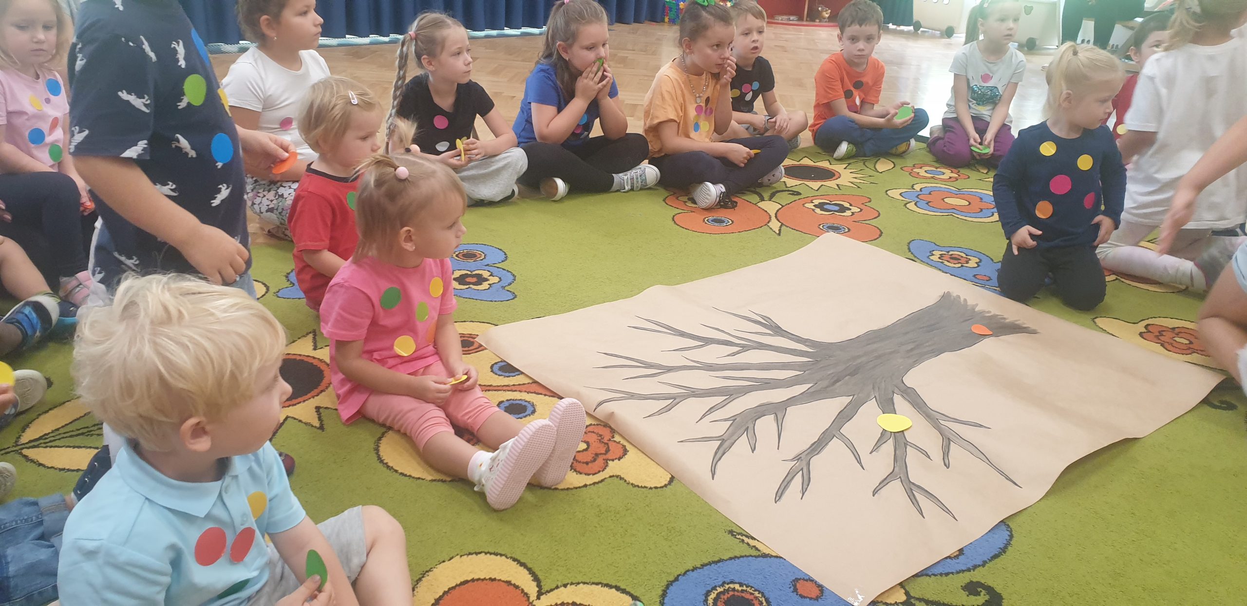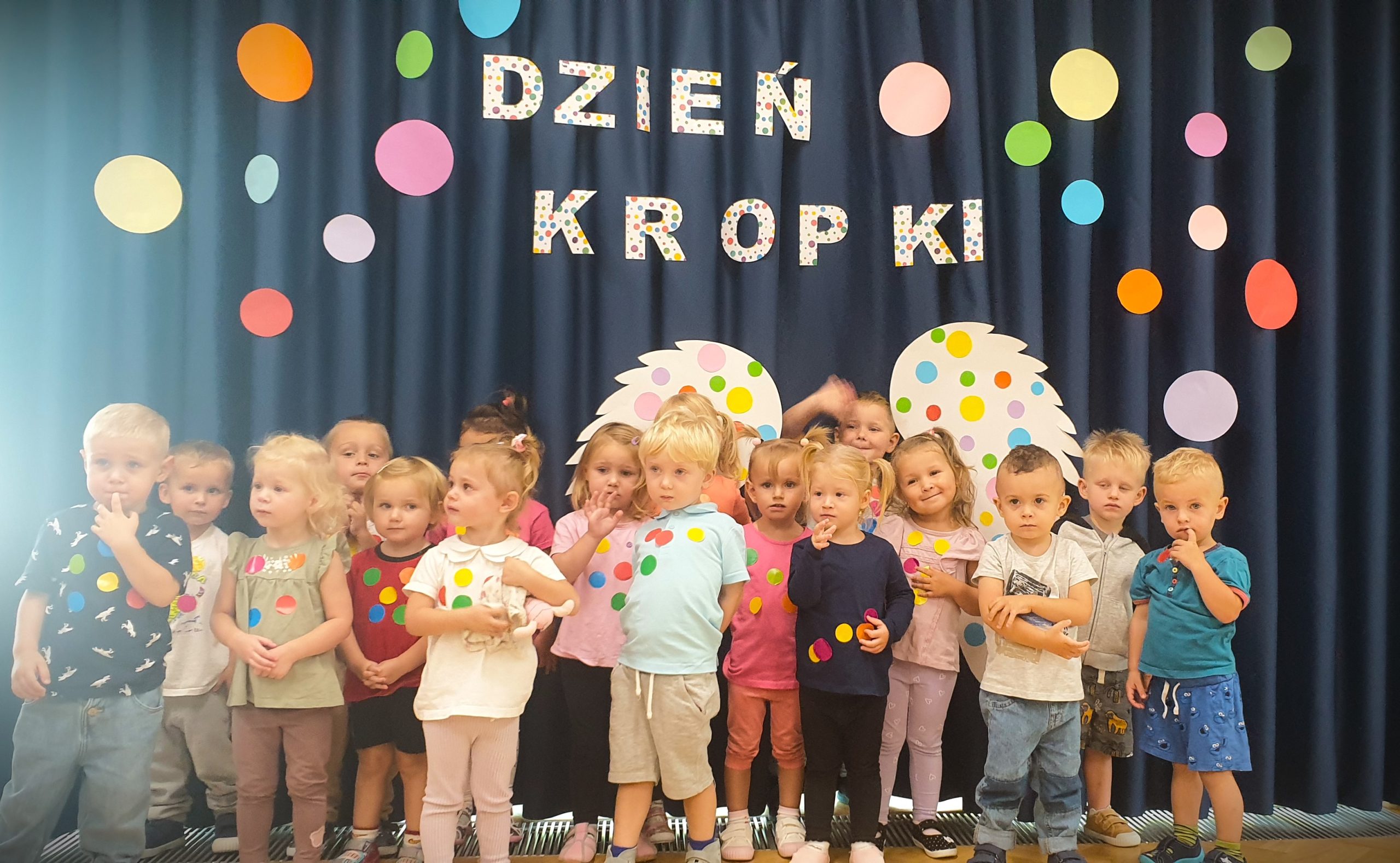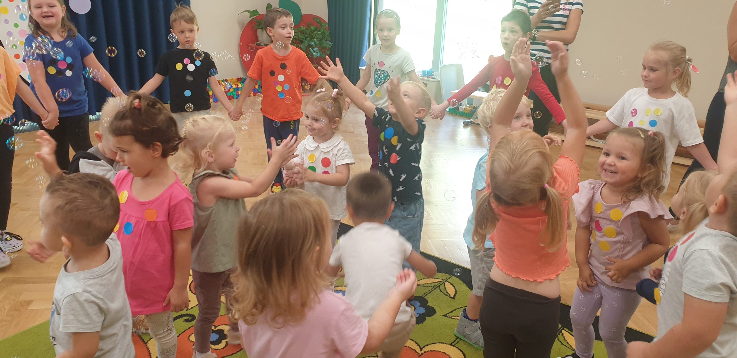 15 września obchodziliśmy w naszej grupie Międzynarodowy Dzień Kropki. Udaliśmy się do grupy VI, aby wspólnie świętować ten dzień. Odnajdywaliśmy dzieci, które mają takie same kropki jak my, uczyliśmy się wierszyka, a także słuchaliśmy bajki o kropce. Na koniec mogliśmy poszaleć wśród baniek mydlanych!