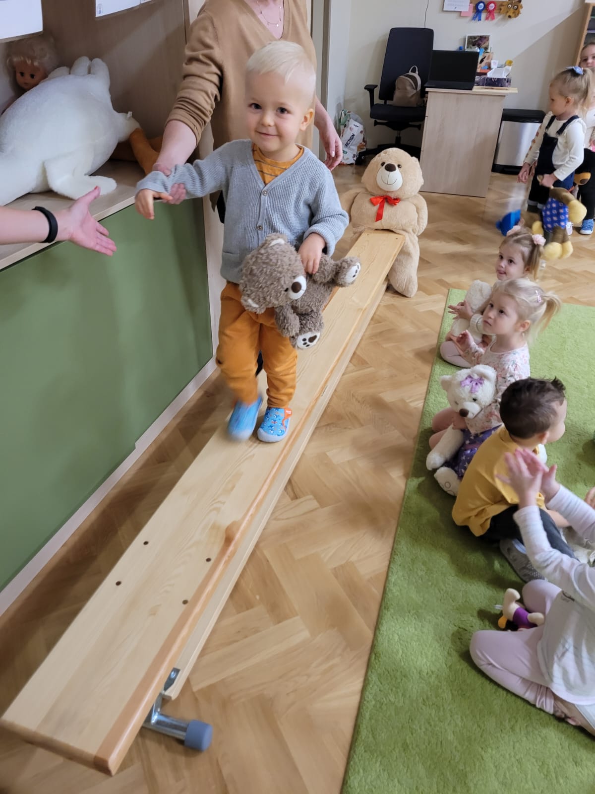 Tego dnia dzieci mogły przejść się po wybiegu niczym prawdziwi modele oraz modelki i zaprezentować wszystkim swoje misie. Brały udział w pogadankach na temat swojego pluszowego misia, bawiły się przy piosenkach: „Jadą misie”, „Stary niedźwiedź mocno śpi”, w zabawach ruchowych z misiem, z chustą animacyjną, składaniu obrazka z części. Na koniec przedszkolaki wykonały wyjątkowe misie, które można podziwiać na wystawie w holu przedszkola. Specjalnie przygotowana fotoramka pozwoliła dzieciom zmienić się na chwilę w swoją ulubioną przytulankę. Na koniec zajęć każde dziecko otrzymało niespodziankę. Dzień upłynął nam na wspólnej zabawie, z której radości było co niemiara.