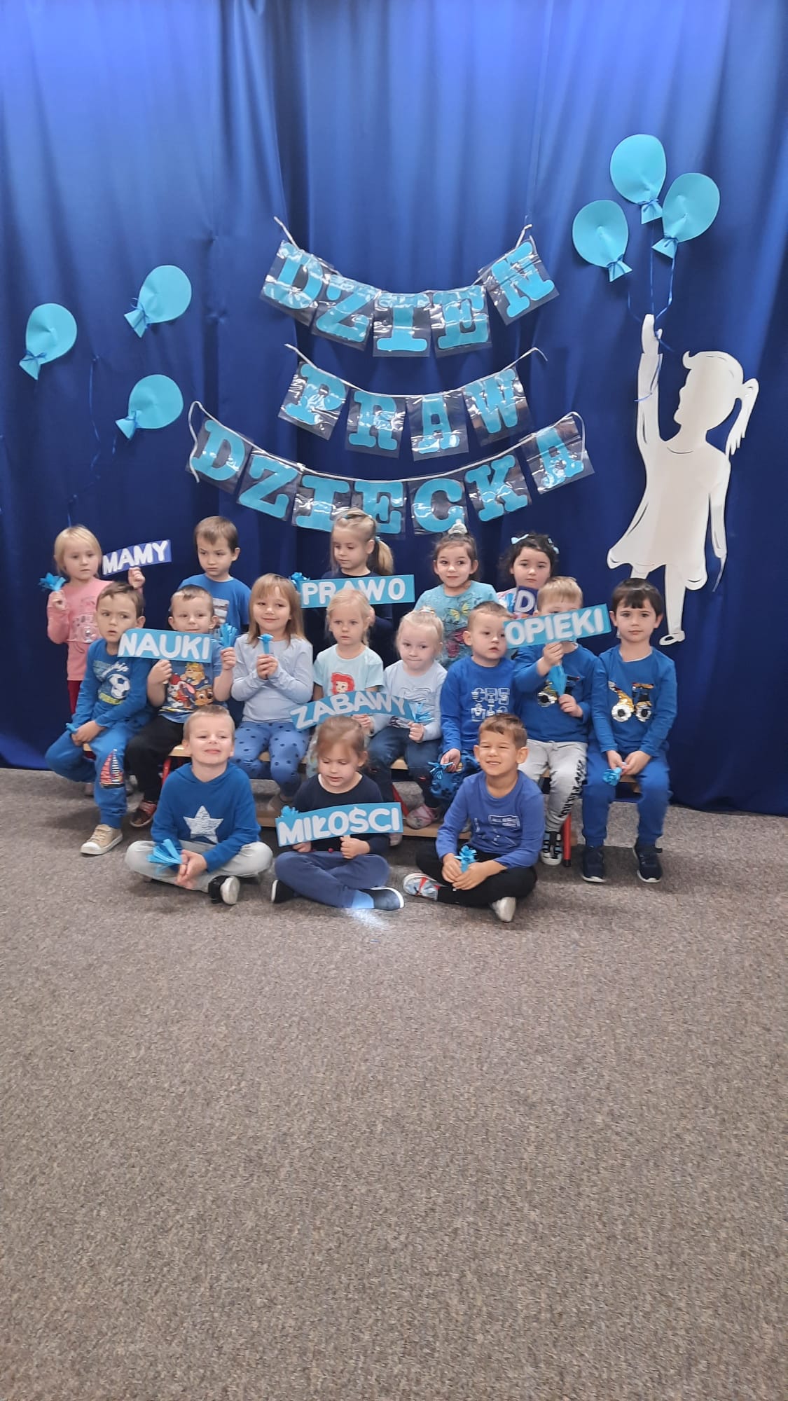 Międzynarodowy Dzień Praw Dziecka w naszym przedszkolu obchodziliśmy wspólnie z wszystkimi grupami: Misie, Wiewiórki i Jeżyki. Łącząc się z dziećmi na całym świecie wszystkie dzieci i wychowawczynie przyszły ubrane na niebiesko. Na podstawie serii obrazków omówiono poszczególne Prawa Dziecka, sylwetkę Janusza Korczaka oraz obecnego Rzecznika Praw Dziecka Mikołaja Pawlaka. Dzień Praw Dziecka świętowaliśmy na sportowo: z pośród dzieci wybrano kapitanów drużyn, którzy dobrali dzieci do swojej drużyny, drużyny rywalizowały pomiędzy sobą w różnorodnych konkurencjach sportowych: „Strzały do bramki”, „ Skok w dal”, „Rzuty woreczkami do celu”, „Slalom”, „Tunel” – toczenie piłki, „Tor przeszkód”. Po zakończonych konkurencjach dzieci otrzymały medale wykonane przez dzieci z najstarszej grupy.