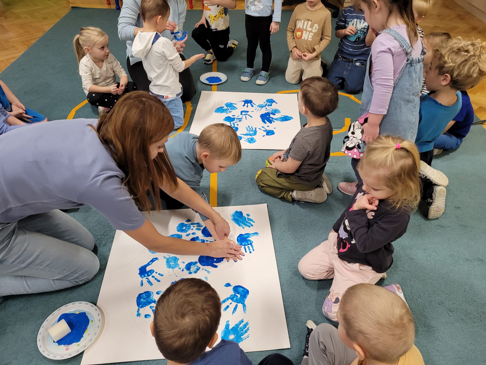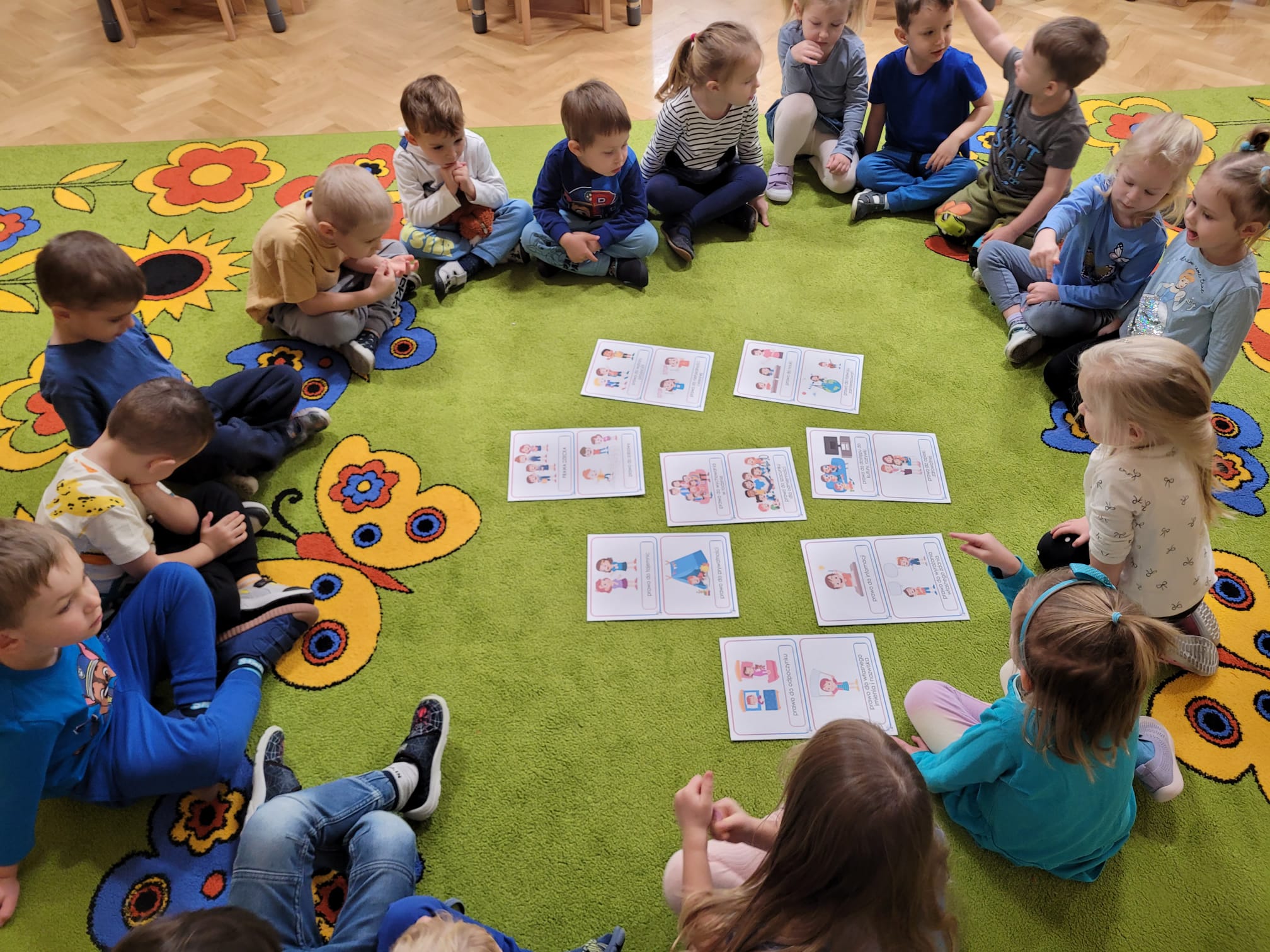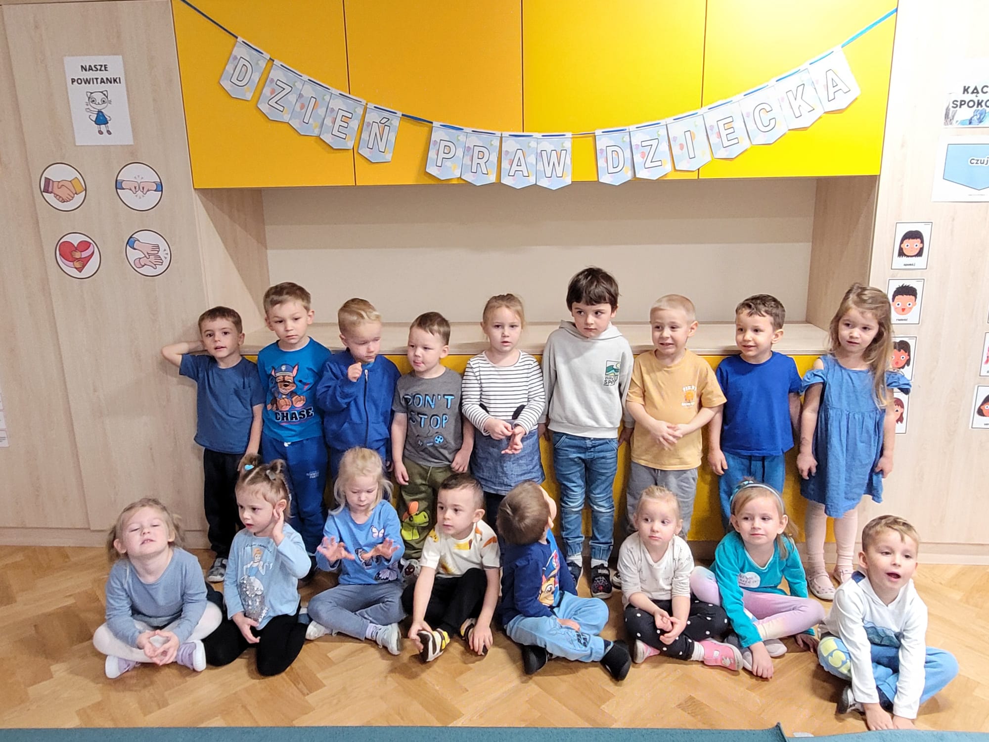 20 listopada obchodziliśmy Dzień Praw Dziecka. Z tej okazji wybraliśmy się do grupy „Misiów”, aby wspólnie rozmawiać o prawach jakie mają dzieci. Oglądnęliśmy bajkę edukacyjną o prawach dziecka, następnie sprawdzaliśmy czy dzieci znają swoje prawa i potrafią ocenić co jest dobre, a co złe. Na koniec wykonaliśmy wspólnie pracę plastyczną – niebieskie serce z dłoni!
