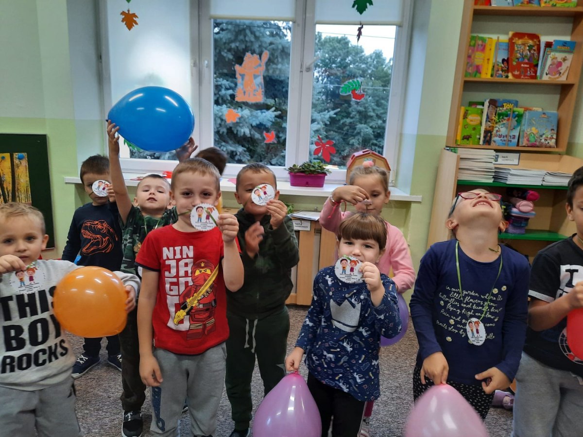 Świętowanie w naszej grupie rozpoczęliśmy w dniu 20 września 2021 r. Już od samego rana panowała wesoła i radosna atmosfera. Zabawom nie było końca. Było wesoło i kolorowo. Największą radość sprawiły zabawy z chustą animacyjną. Dzieci śpiewały ulubione piosenki i brały udział w różnych konkurencjach sportowych, zabawach z balonami, rozwiązywały zagadki, ozdabiały swoje balony. Za wspaniały udział otrzymały odznaki upamiętniające Dzień Przedszkolaka. Dzieci odśpiewały Hymn Przedszkolaka, a następnie wspaniale bawiły się w tańcach integracyjnych przy muzyce.