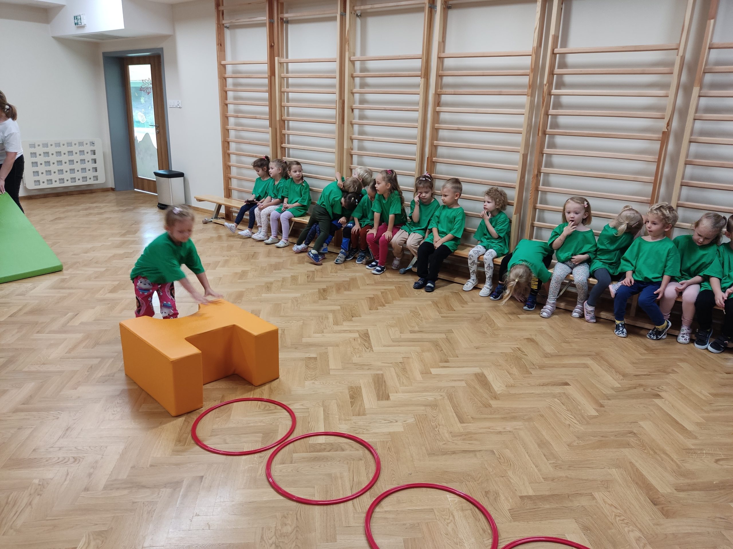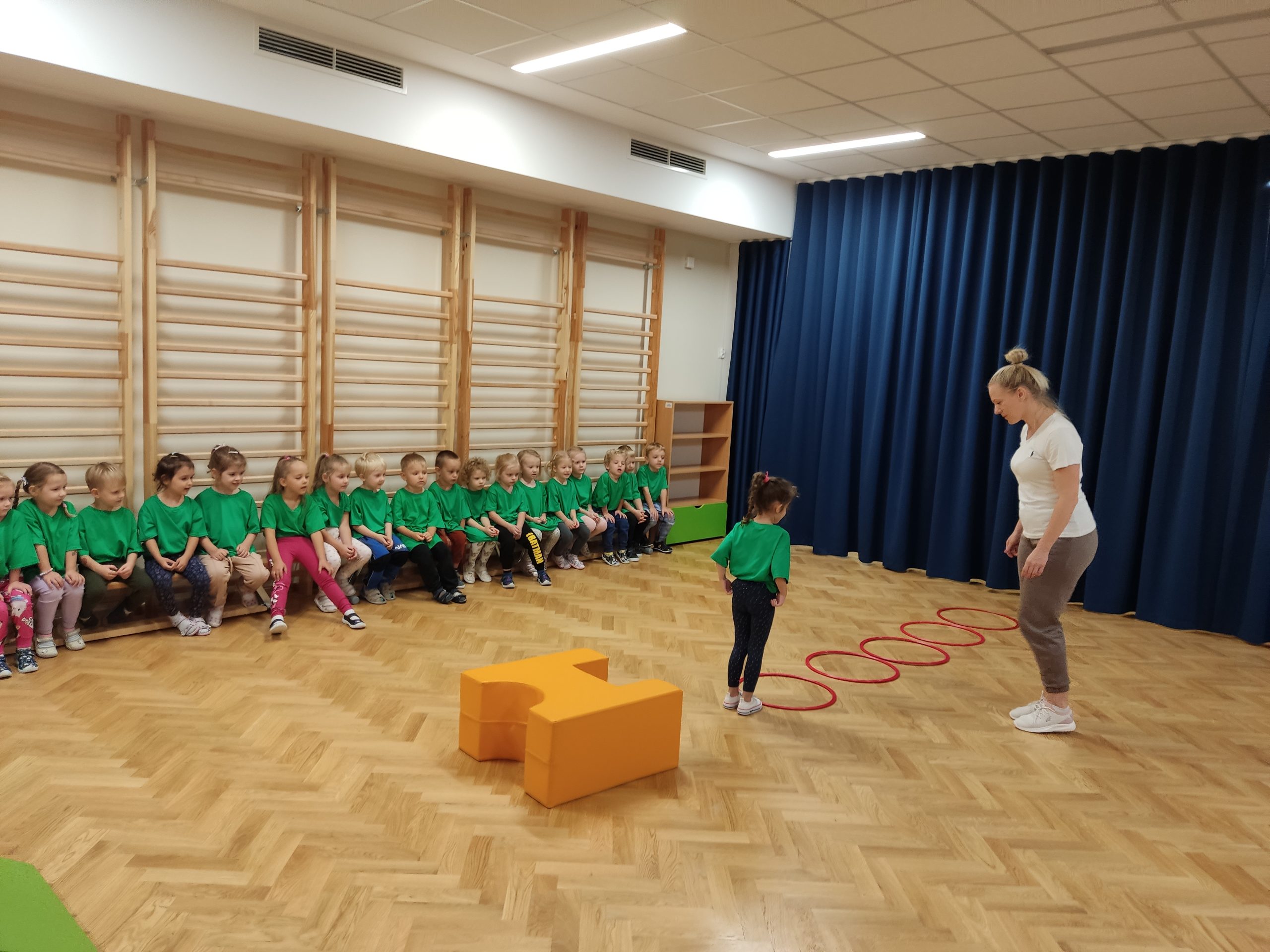 Po śniadaniu Misie i Zajączki spotkały się w sali gimnastycznej, aby uczestniczyć w tak ważnym wydarzeniu, jakim jest Europejski Dzień Sportu Szkolnego. Ideą ESSD – była celebracja i promocja aktywności fizycznej wśród przedszkolaków. Przed rozpoczęciem konkurencji sportowych dzieci wzięły udział w rozgrzewce w formie zabaw muzyczno-ruchowych. Następnie przedszkolaki bardzo sprawnie pokonywały długi tor przeszkód. Głównym celem obchodów tego dnia było zachęcenie dzieci do aktywności ruchowej, integrowanie się grup, kształtowanie zachowań prozdrowotnych, nabywanie wiary we własne siły i możliwości oraz wzbogacanie przeżyć poprzez szlachetne współzawodnictwo. W tym dniu panowała atmosfera zdrowej rywalizacji i wzajemnego dopingu.