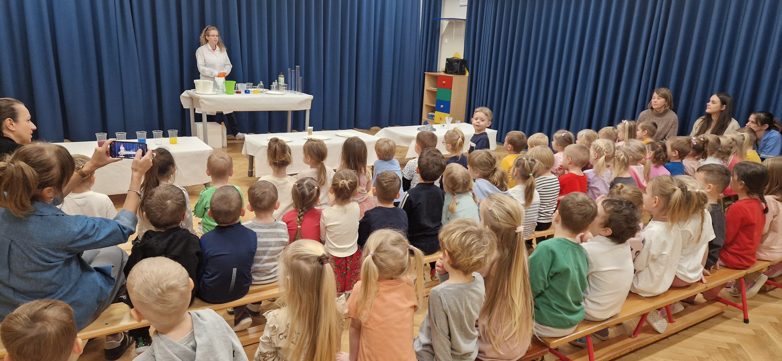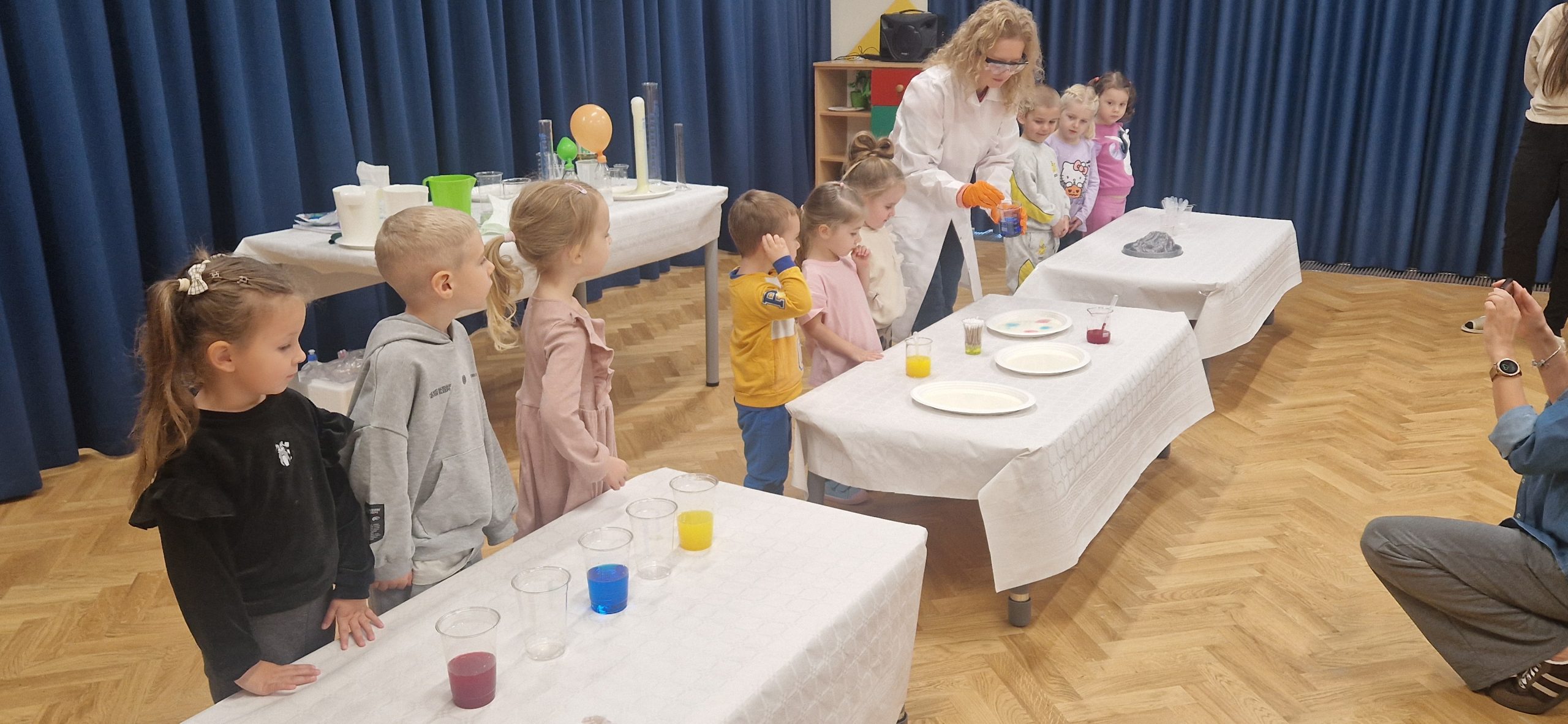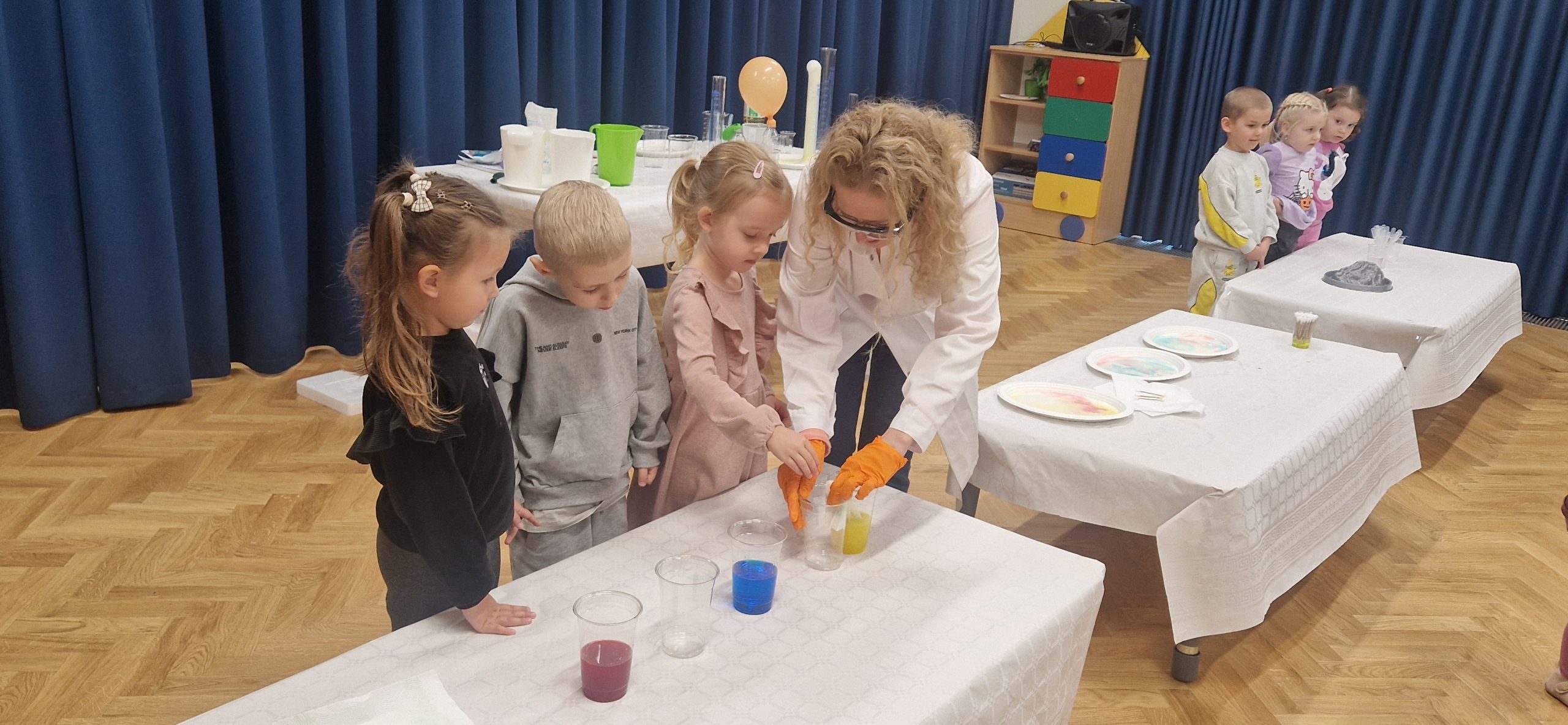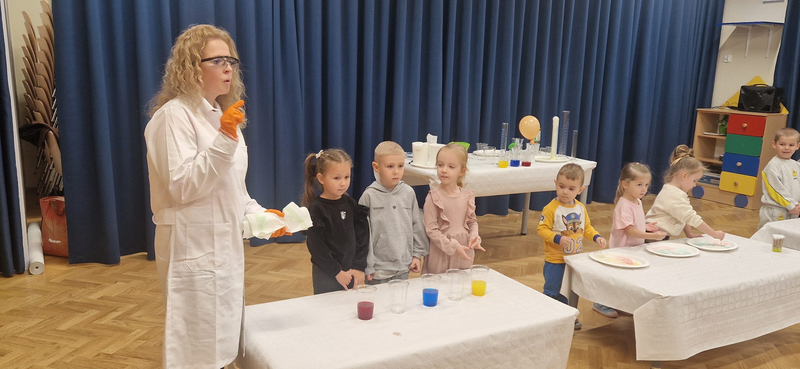 14 listopada grupa III wzięła udział w bardzo ciekawych zajęciach chemicznych, które poprowadziła Pani chemiczka – mama naszych kolegów z przedszkola. Dzieci z dużym zainteresowaniem obserwowały przebieg zajęć oraz brały aktywny udział w przeprowadzanych doświadczeniach. Miały okazję zaobserwować i poznać odpowiedź na kilka pytań: Jak zachowuje się suchy lód, który może poparzyć skórę i czym on się różni od zwykłych kostek lodu. Jak można zrobić wulkan za pomocą sody oczyszczonej? Dlaczego kolory na mleku rozpływają się po powierzchni mleka pod wpływem płynu do naczyń oraz jak łączyć kolory ze sobą za pomocą papierowych pasków. Dowiedziały się, że chemia towarzyszy nam na co dzień i jest związana z różnymi czynnościami wykonywanymi w domu. Poznały znaczenie oznaczeń na produktach chemicznych i uświadomiły sobie, że niektóre z nich mogą być niebezpieczne i nie wolno dopuszczać ich do kontaktu ze skórą. Uczestnictwo w zajęciach wywołało wiele emocji i zachwytu. Dziękujemy!