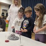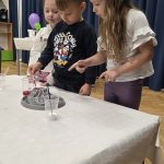 Kolejną atrakcją był eksperyment z wulkanem. Po połączeniu sody, octu i barwnika powstała efektowna, musująca lawa, która wywołała dużo radości i zachwytu. Przedszkolaki mogły zobaczyć również, jak zachowuje się suchy lód i czym różni się od zwykłych kostek lodu.