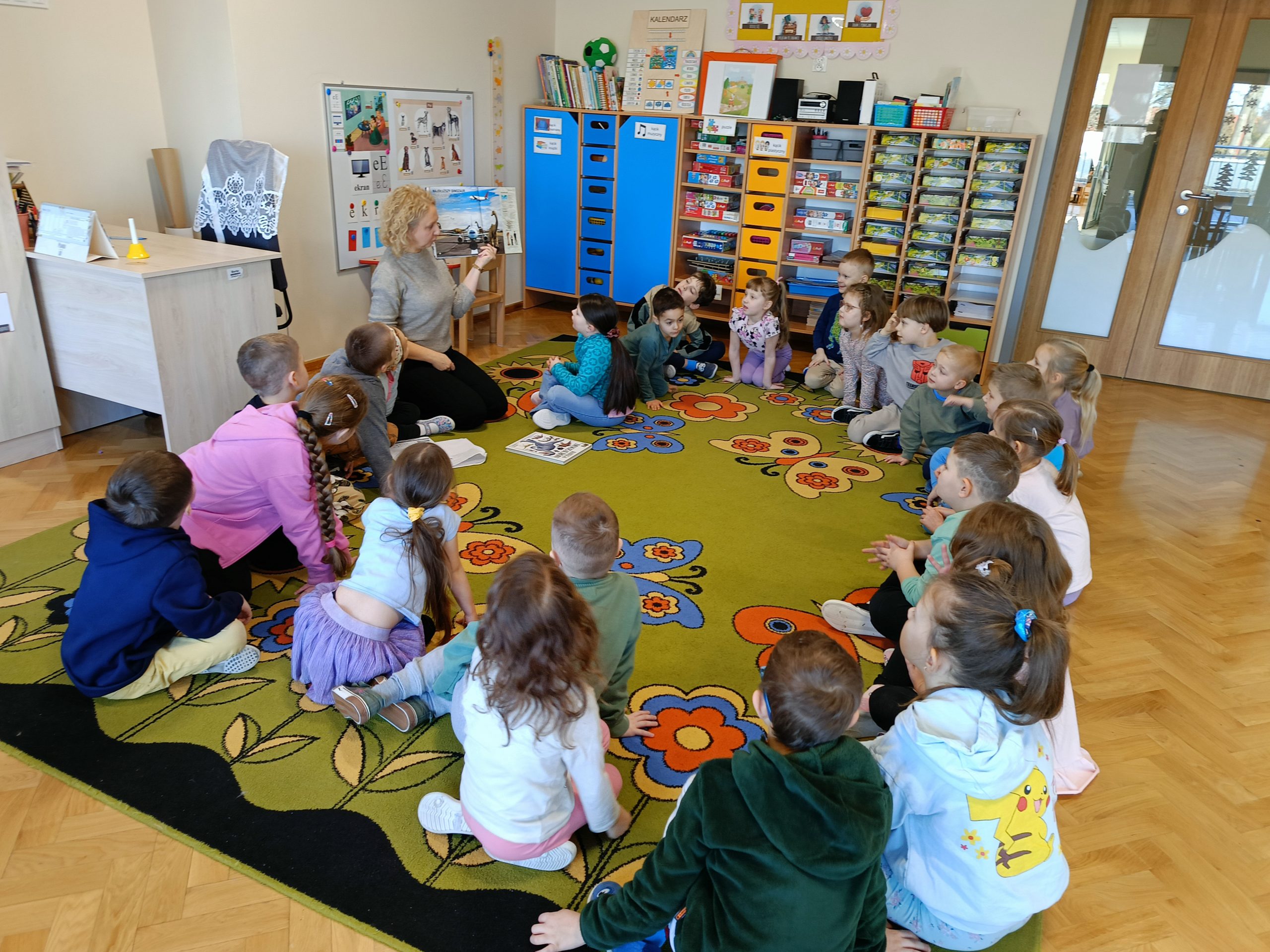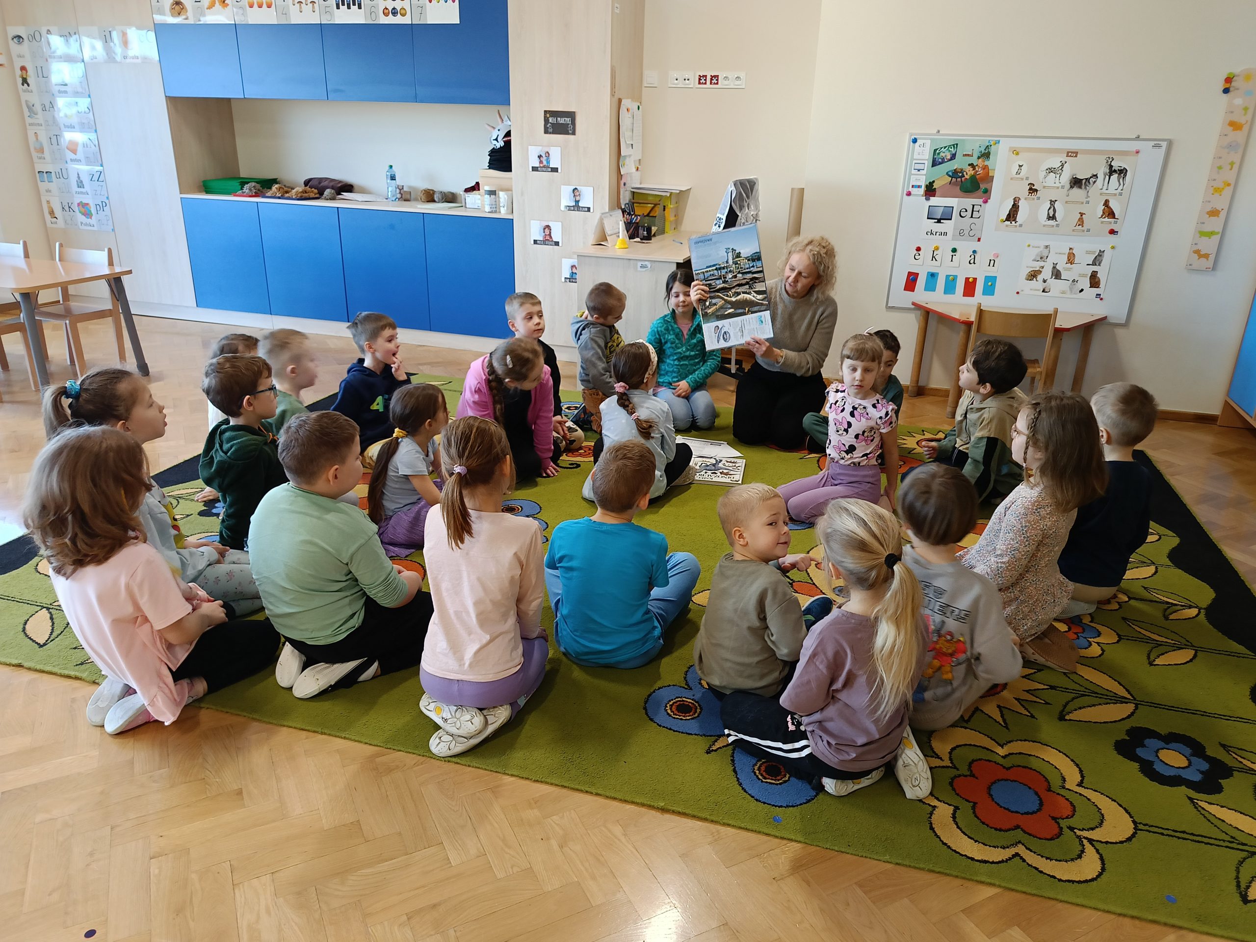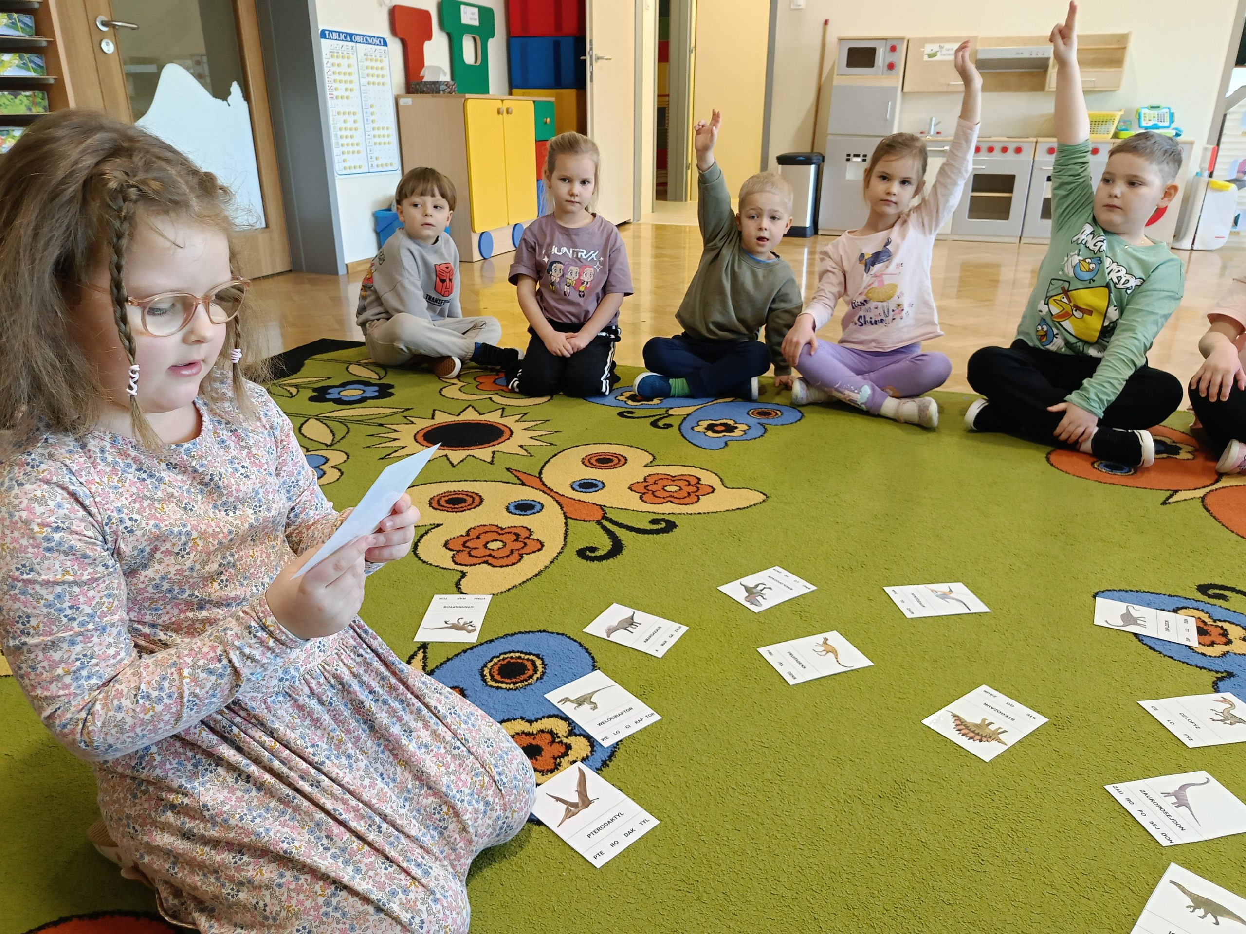 Szczególną uwagę poświęciliśmy wspólnym rozważaniom na temat tego, jak mógłby wyglądać świat, gdyby dinozaury żyły także dzisiaj. Dzieci z dużym zaangażowaniem dzieliły się swoimi pomysłami i wyobrażeniami. Wyobrażały sobie dinozaury spacerujące po miastach, mieszkające w specjalnych parkach lub rezerwatach, a nawet pomagające ludziom w codziennych pracach. Zastanawialiśmy się, jak musiałyby zmienić się domy, drogi oraz środki transportu, aby były bezpieczne zarówno dla ludzi, jak i dla dinozaurów. Przedszkolaki rozmawiały również o tym, jakie zawody mogliby wykonywać ludzie opiekujący się dinozaurami oraz jak wyglądałaby nauka i zabawa w świecie, w którym obok nas żyją tak niezwykłe stworzenia.