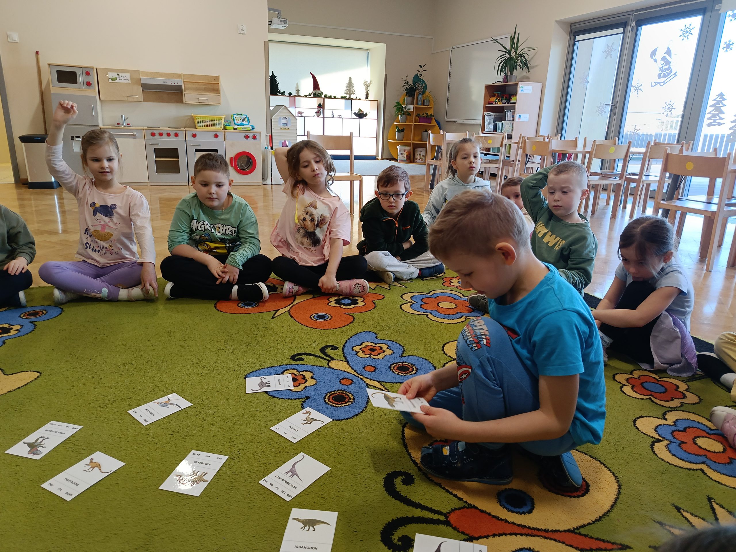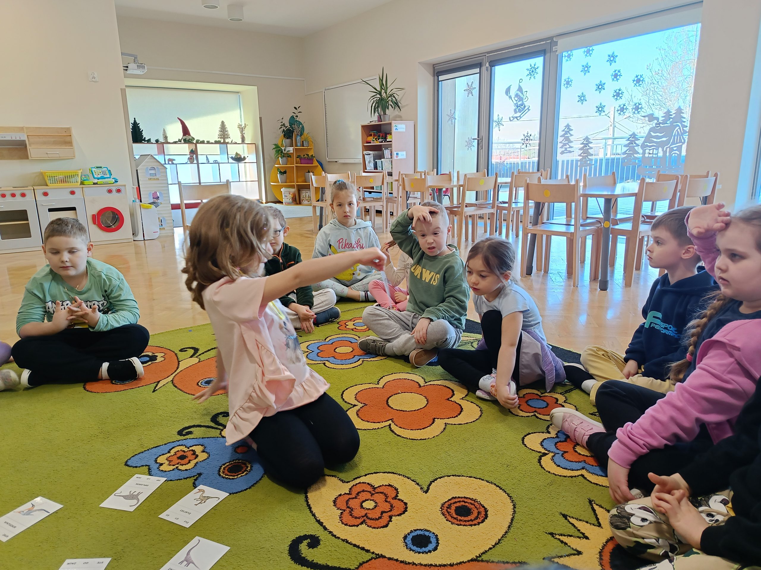 Nie zabrakło także ciekawych zagadek, quizów oraz różnorodnych zadań do rozwiązania, które rozwijały logiczne myślenie, spostrzegawczość i współpracę w grupie. Dzieci brały udział w zabawach ruchowych oraz zadaniach tematycznych związanych z dinozaurami.