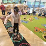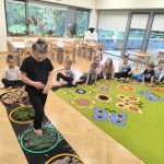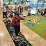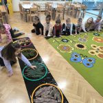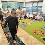 o tym, co można znaleźć w lesie. Dzieci wymieniały „dary lasu”, takie jak: szyszki, mech, kora drzew, liście, kasztany, żołędzie. Następnie przedszkolaki oglądały i dotykały zgromadzonych materiałów, opisując ich fakturę, zapach i kolor. Każde dziecko przeszło ścieżkę boso, odczuwając różne wrażenia dotykowe: miękkość mchu, szorstkość kory, czy delikatność liści. Zajęcia dostarczyły dzieciom wielu pozytywnych emocji, rozwijały sprawność ruchową, koordynację i świadomość ciała. Na zakończenie zajęć odbyła się rozmowa podsumowująca – przedszkolaki opowiadały o tym, co najbardziej im się podobało i które faktury były dla nich najprzyjemniejsze.