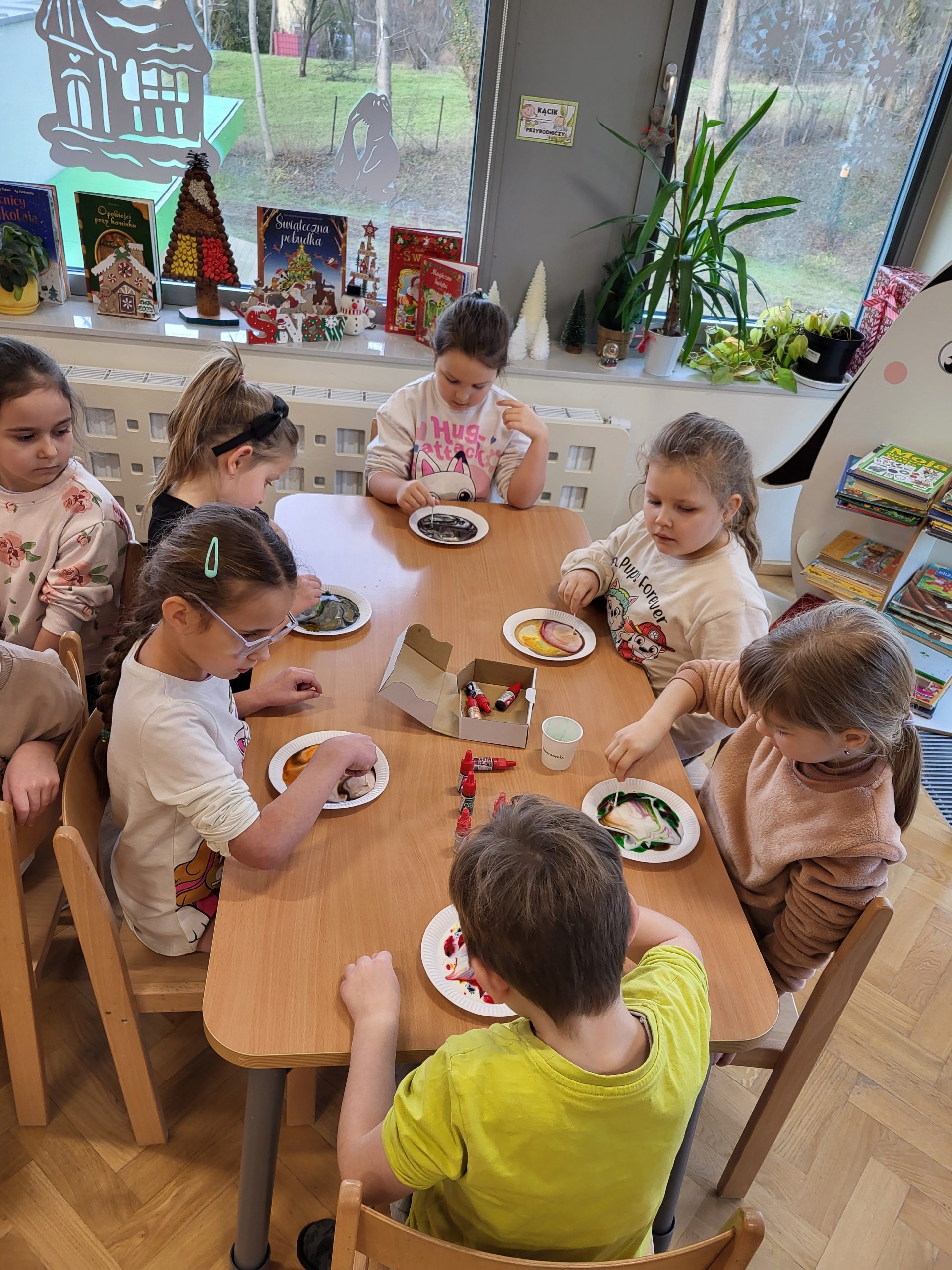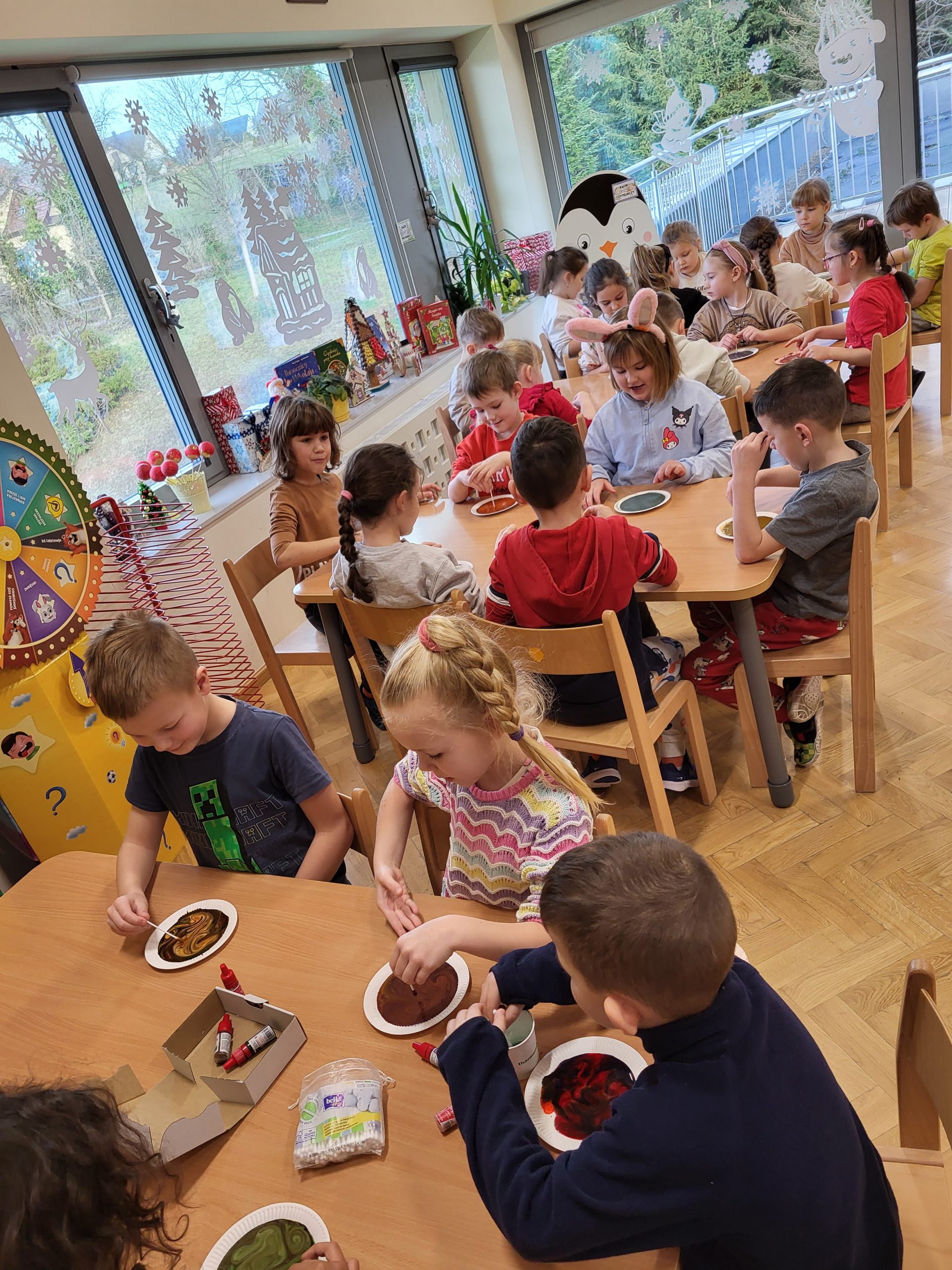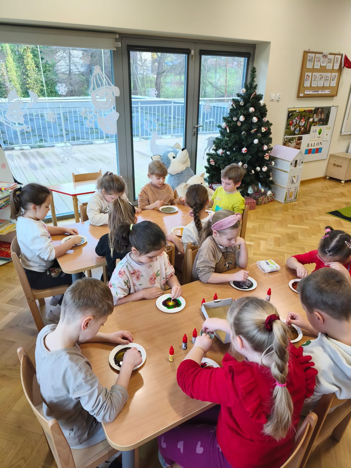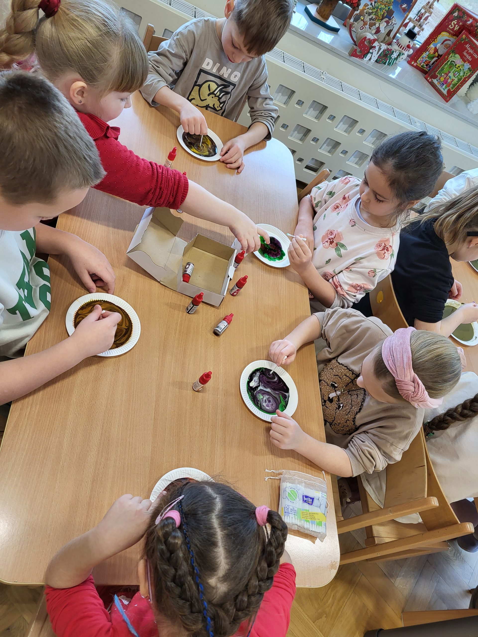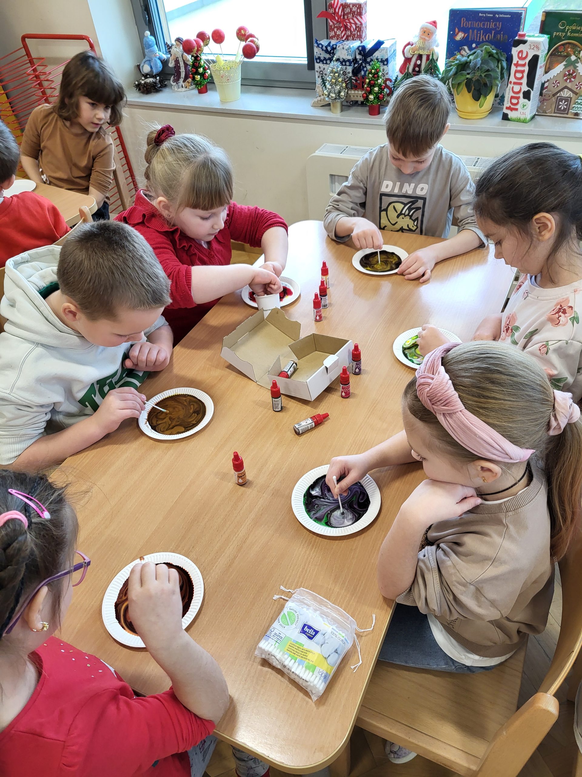 W dniu 17 grudnia w naszej grupie odbyły się zajęcia rozwijające zmysł wzroku, jako kolejne zadanie w ramach Ogólnopolskiego Projektu Edukacyjnego „Gramy Zmysłami”. Celem zajęć było stymulowanie percepcji wzrokowej, rozwijanie spostrzegawczości oraz zainteresowanie dzieci prostymi doświadczeniami badawczymi. Podczas zajęć przedszkolaki uczestniczyły w eksperymencie z mlekiem, barwnikami spożywczymi oraz płynem do naczyń. Obserwowały zmiany zachodzące na talerzykach, po dodaniu poszczególnych składników, zwracając uwagę na mieszanie się kolorów, ich ruch oraz powstające barwy i wzory. Zajęcia wzbudziły duże zainteresowanie i zaangażowanie dzieci, sprzyjały koncentracji uwagi oraz rozwijały umiejętność obserwowania i wyciągania wniosków. Aktywność przebiegała