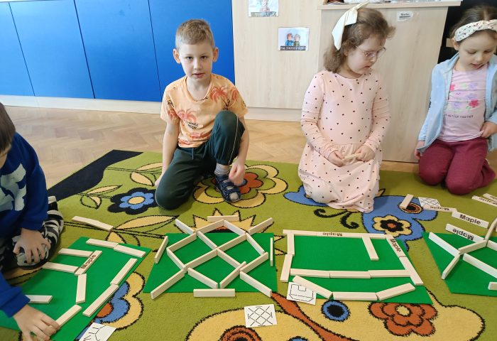 Podczas zajęć Liski brały udział w zabawach, które umożliwiły rozwijanie kompetencji matematycznych. Przedszkolaki doskonaliły orientację przestrzenną, tworzenie zbiorów, liczenie oraz porównywanie gdzie jest więcej, a gdzie mniej przedmiotów. Zabawy matematyczne sprawiły dzieciom ogromną radość.