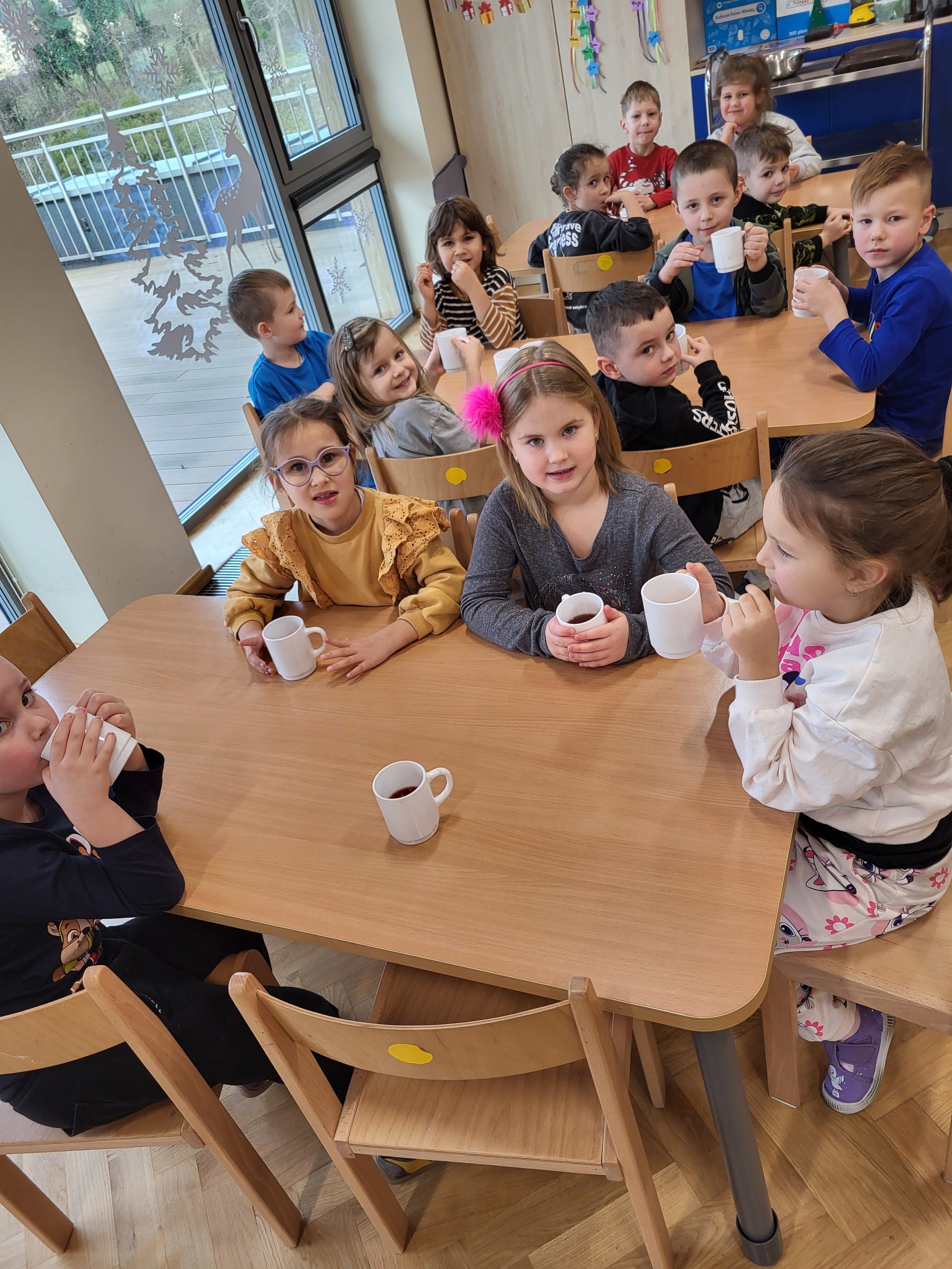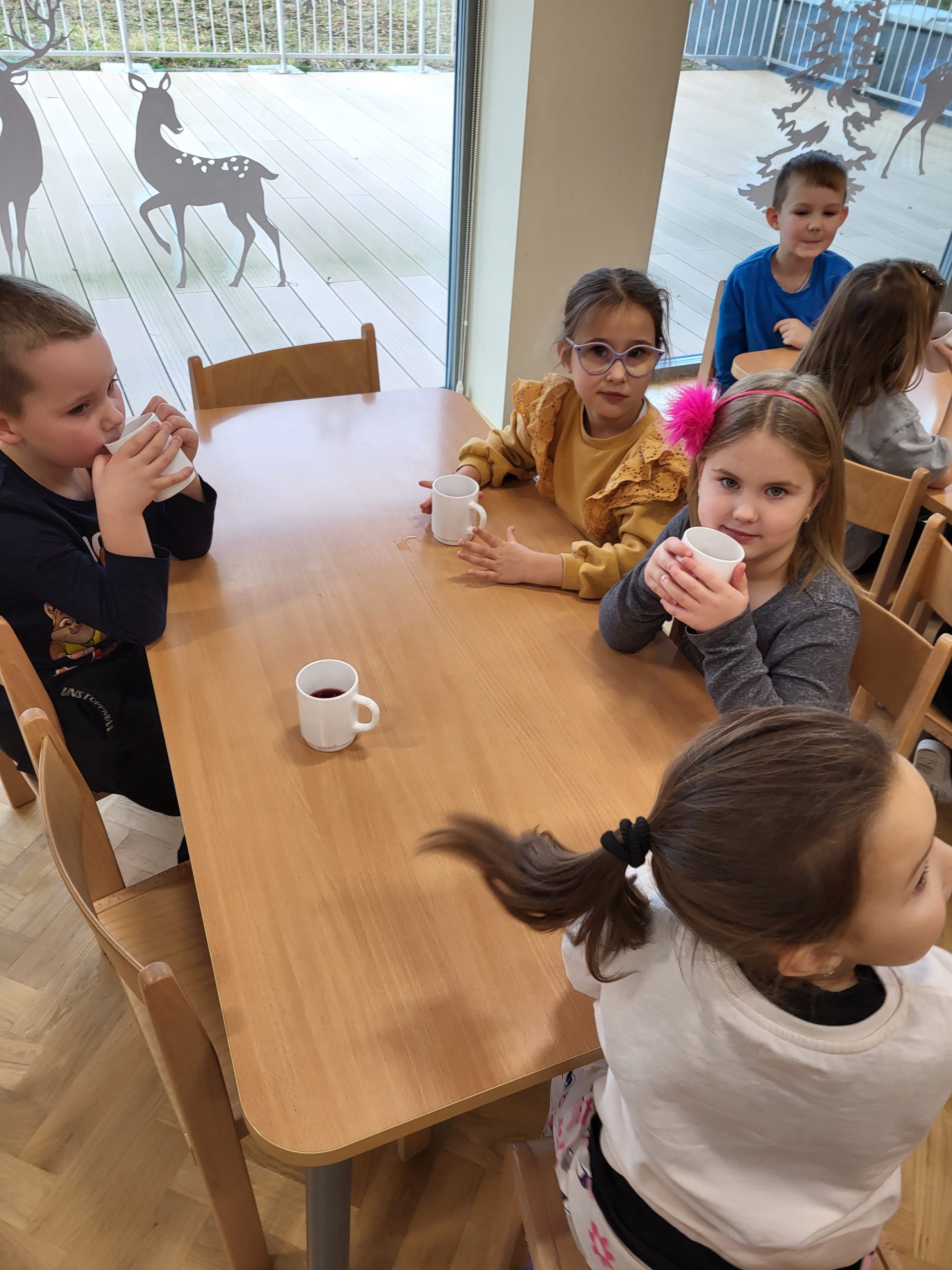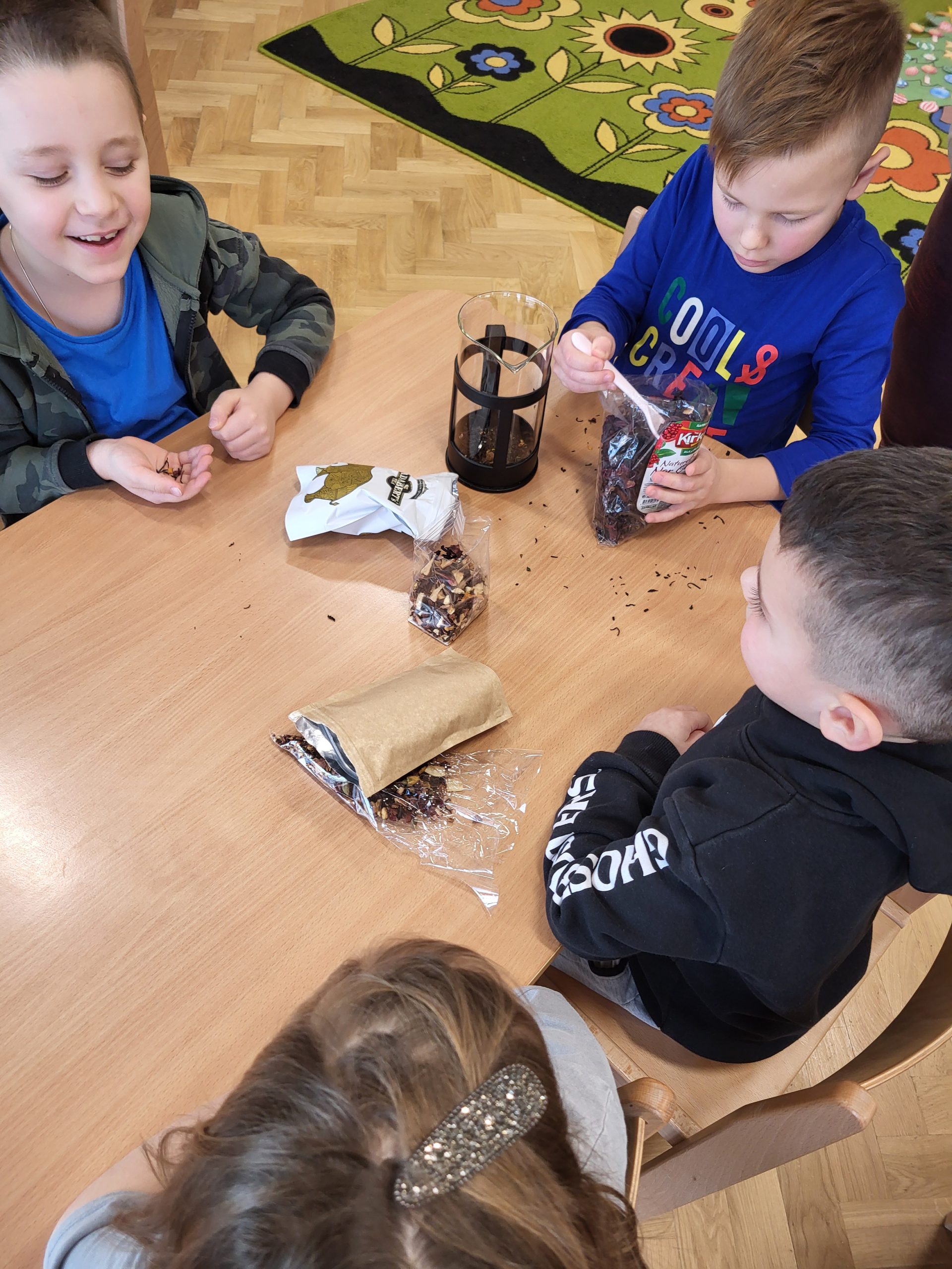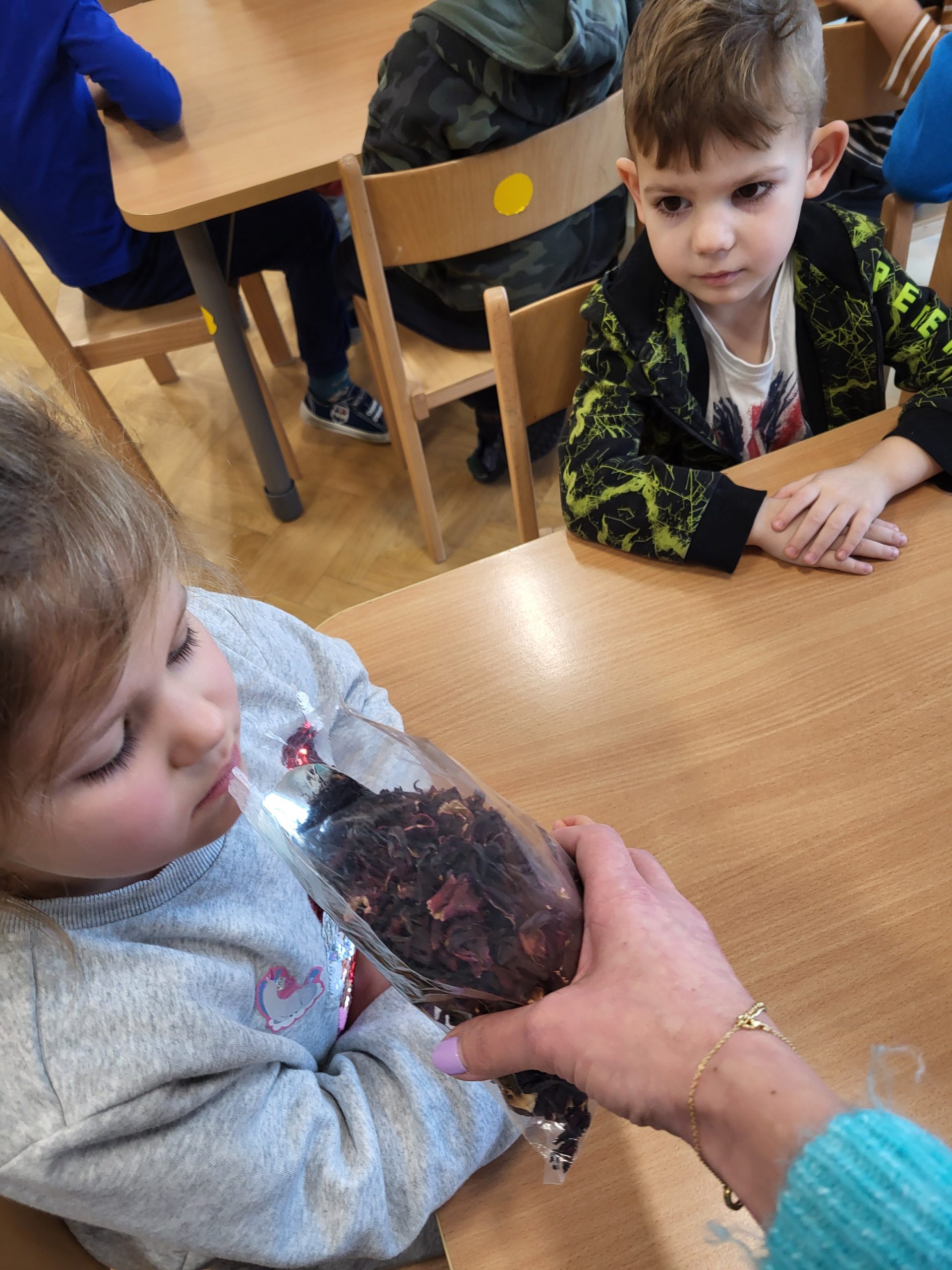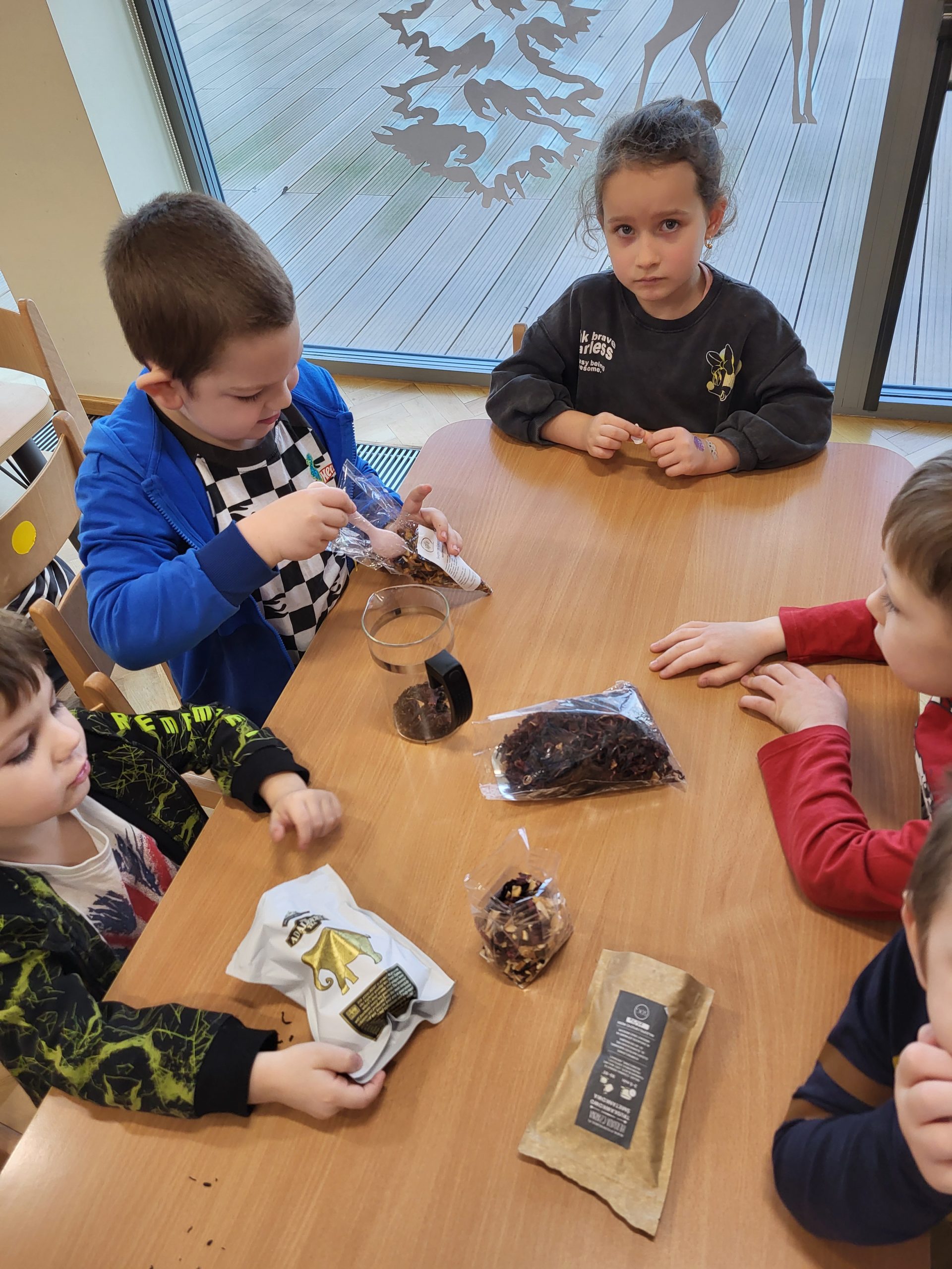 W dniu 18 grudnia dzieci z naszej grupy w ramach Ogólnopolskiego Projektu Edukacyjnego „Gramy Zmysłami” przygotowały mieszankę z różnych rodzajów herbat owocowych, jako styczniowe zadanie. Na początku zajęć zapoznawały się z ich zapachami, próbując odgadnąć jakie owoce wyczuwają oraz wskazywały, które aromaty podobają się im najbardziej. Następnie każdy przedszkolak wsypywał wybraną herbatę do zaparzacza i tak przygotowana mieszanka była niepowtarzalna. Na koniec dzieci delektowały się jej wyjątkowym smakiem, a piękny owocowy aromat unosił się po całej sali.
