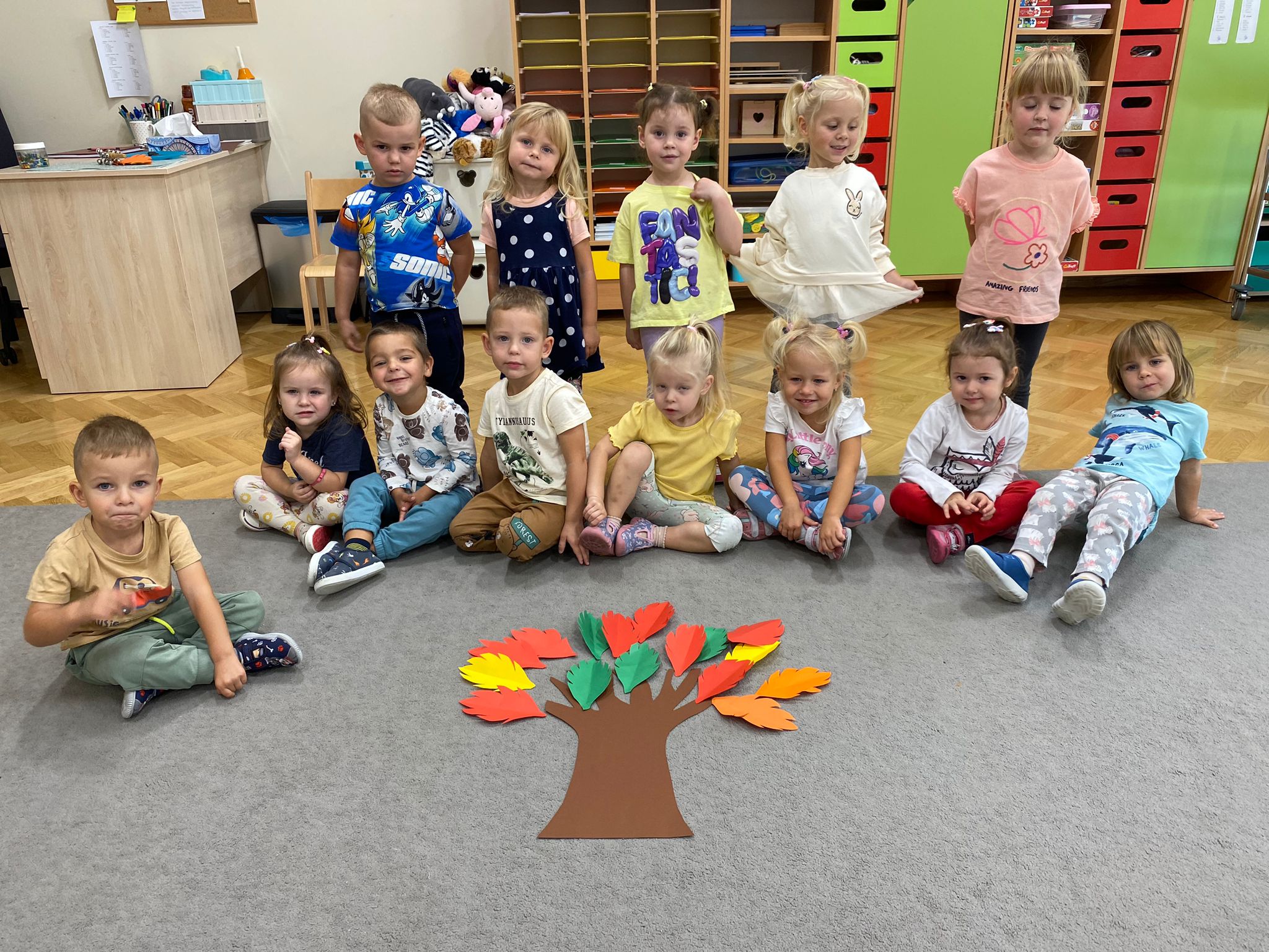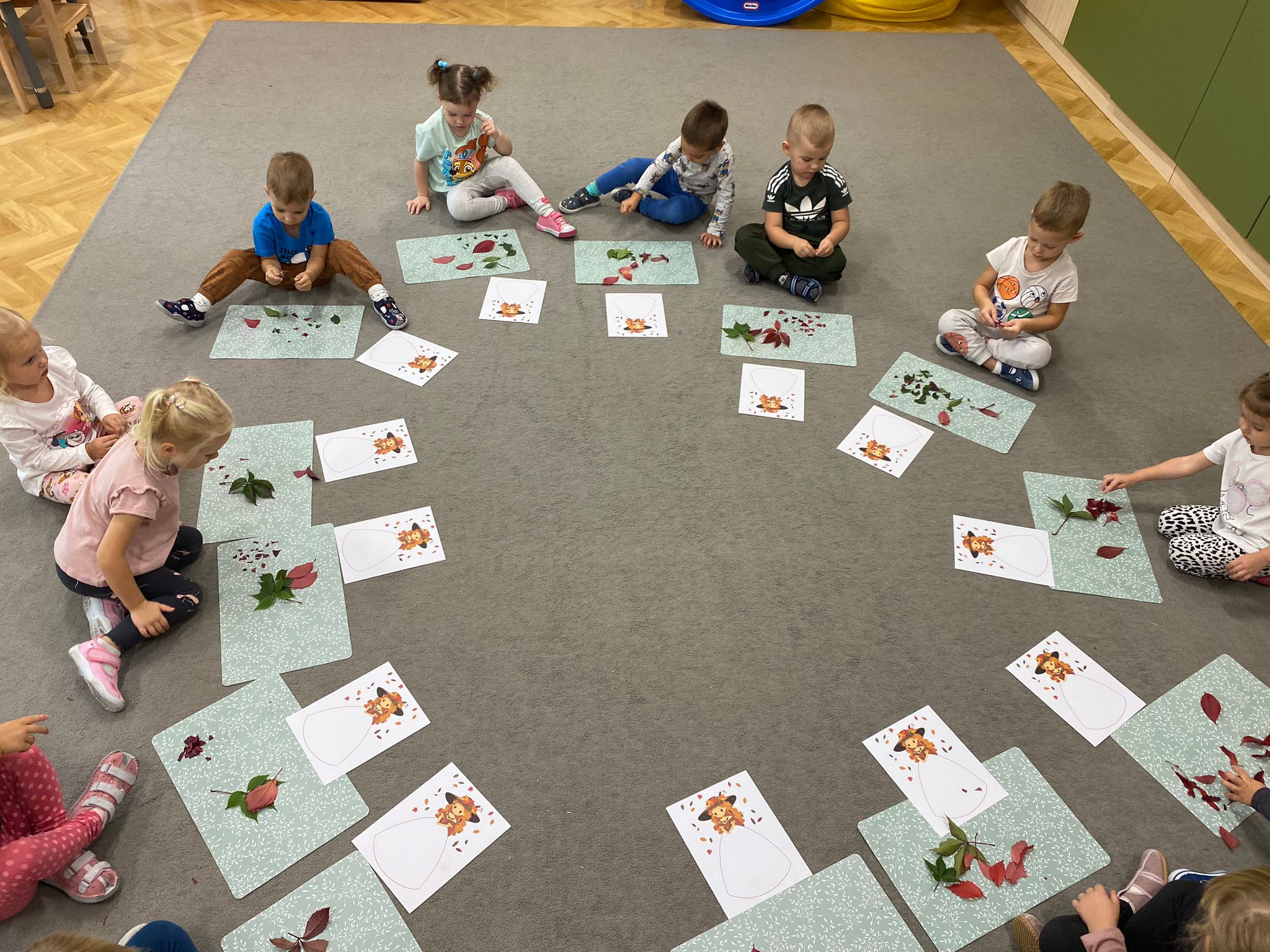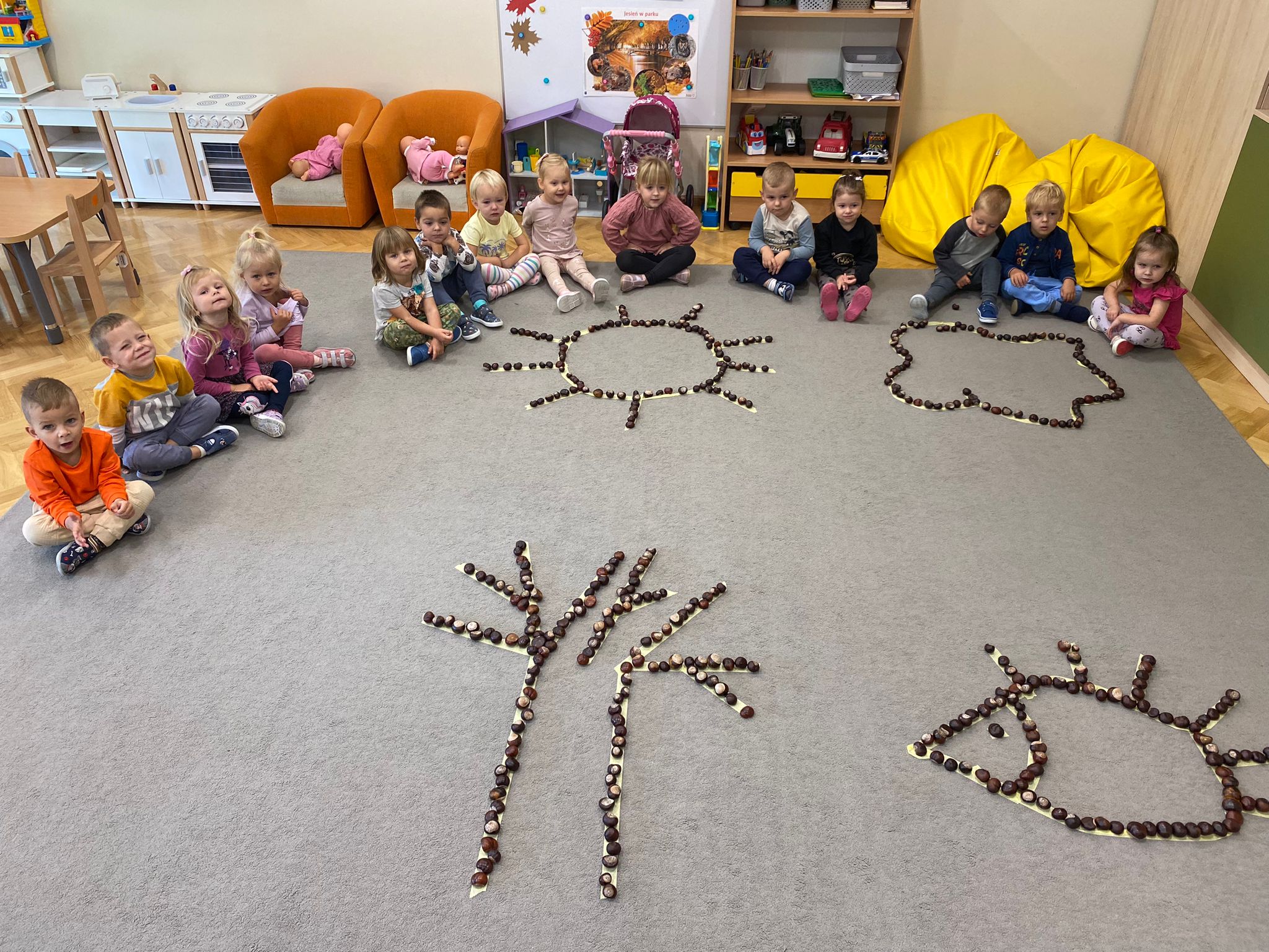 „W kolorach brązu, w odcieniach zieleni, idzie Pani Jesień, nic tego nie zmieni. Niesie nam w prezencie grzyby i kasztany, z uśmiechem na twarzy chętnie je zbieramy”.
