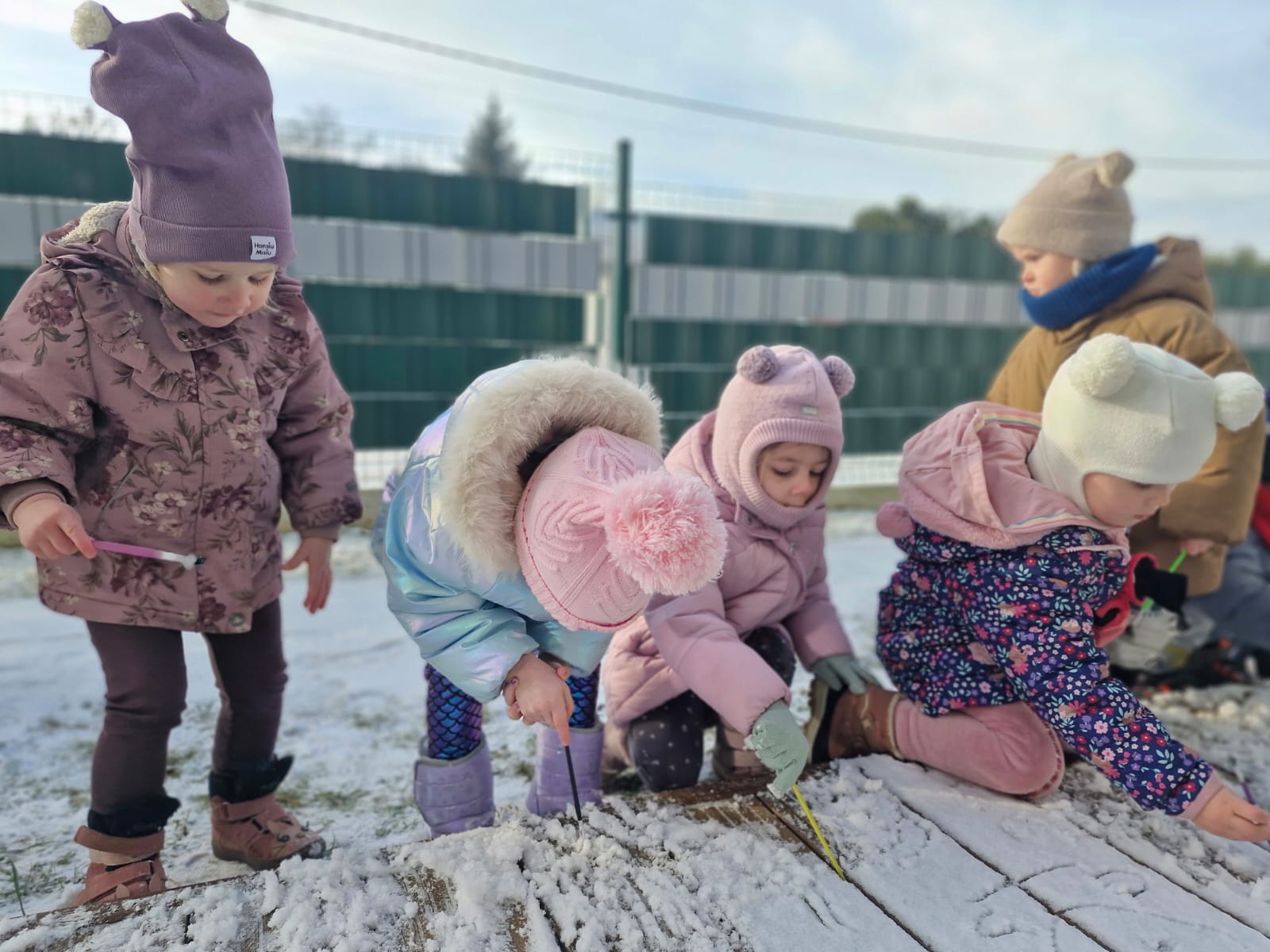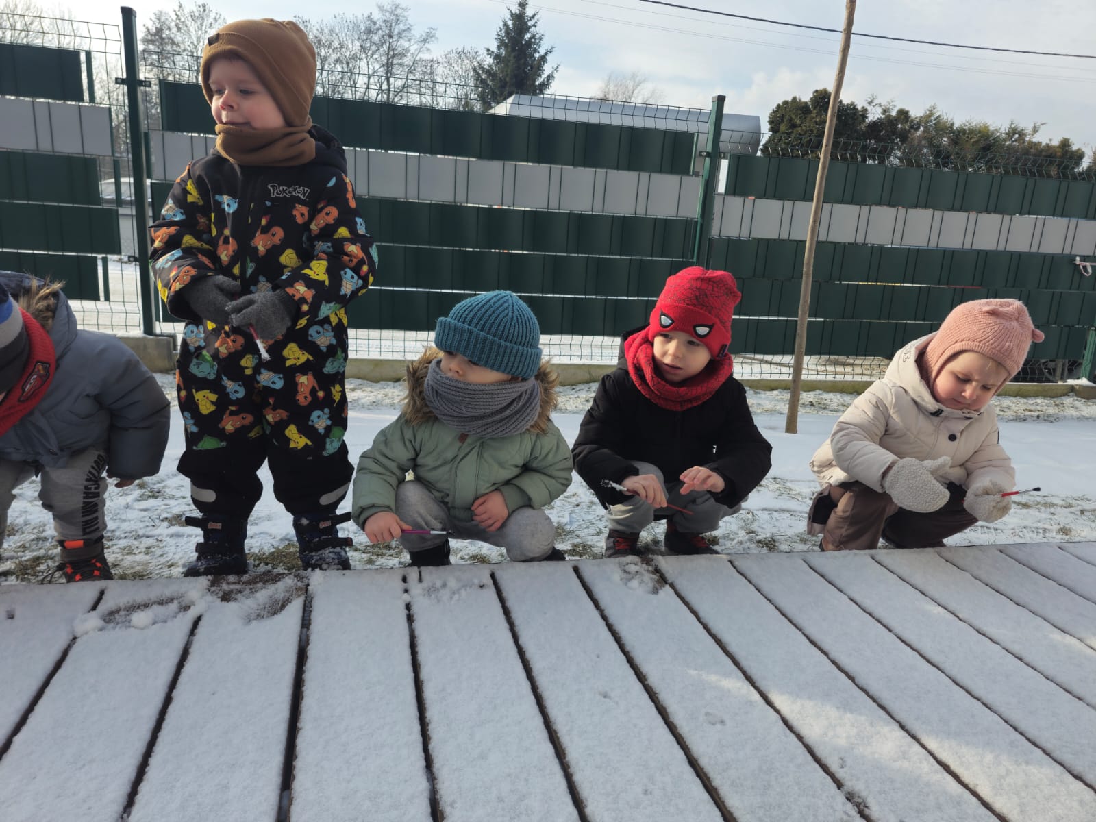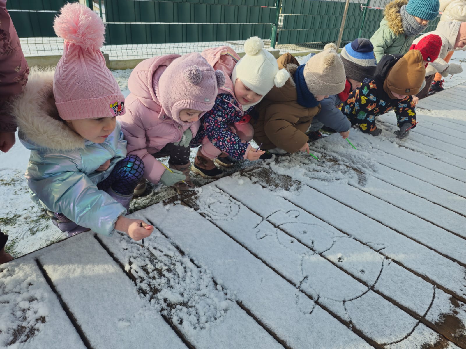 Podczas pobytu na świeżym powietrzu dzieci aktywnie uczestniczyły w zabawach na śniegu, które były doskonałą okazją do ruchu oraz poznawania zimowej aury. Przedszkolaki odciskały ślady butów w śniegu, tworzyły aniołki na śniegu, a także brały udział w prostych zabawach ruchowych, co sprawiło im mnóstwo radości. Zimowe wyjście było także okazją do zabaw sensorycznych na śniegu. Przedszkolaki malowały po śniegu, rozwijając swoją kreatywność, wyobraźnię oraz sprawność manualną. Dzieci badały śnieg za pomocą obserwacji, sprawdzając, czy jest czysty, zwracając uwagę na jego kolor i strukturę. Po jego rozpuszczeniu okazało się, że śnieg jest brudny, ponieważ zawierał zanieczyszczenia, pojawiły się drobinki piasku, kurzu co było dla przedszkolaków ciekawym doświadczeniem. Na tej podstawie dzieci doszły do wniosku, że śnieg, mimo białego koloru, nie jest czysty i nie nadaje się do jedzenia. Kontakt z zimową przyrodą dostarczył dzieciom wielu pozytywnych emocji i wrażeń sensorycznych, wspierając naturalną odporność organizmu oraz budując radość ze wspólnej zabawy i aktywności.