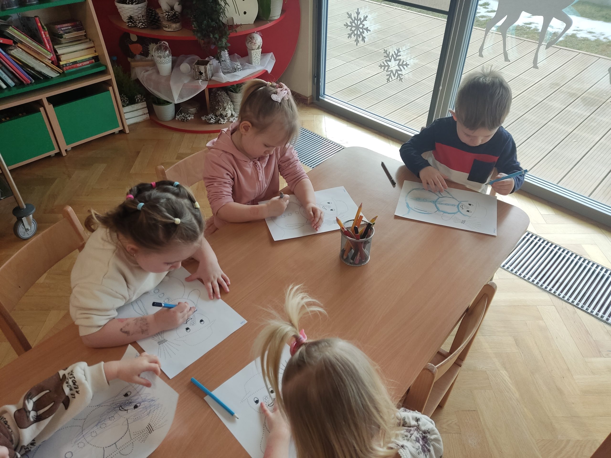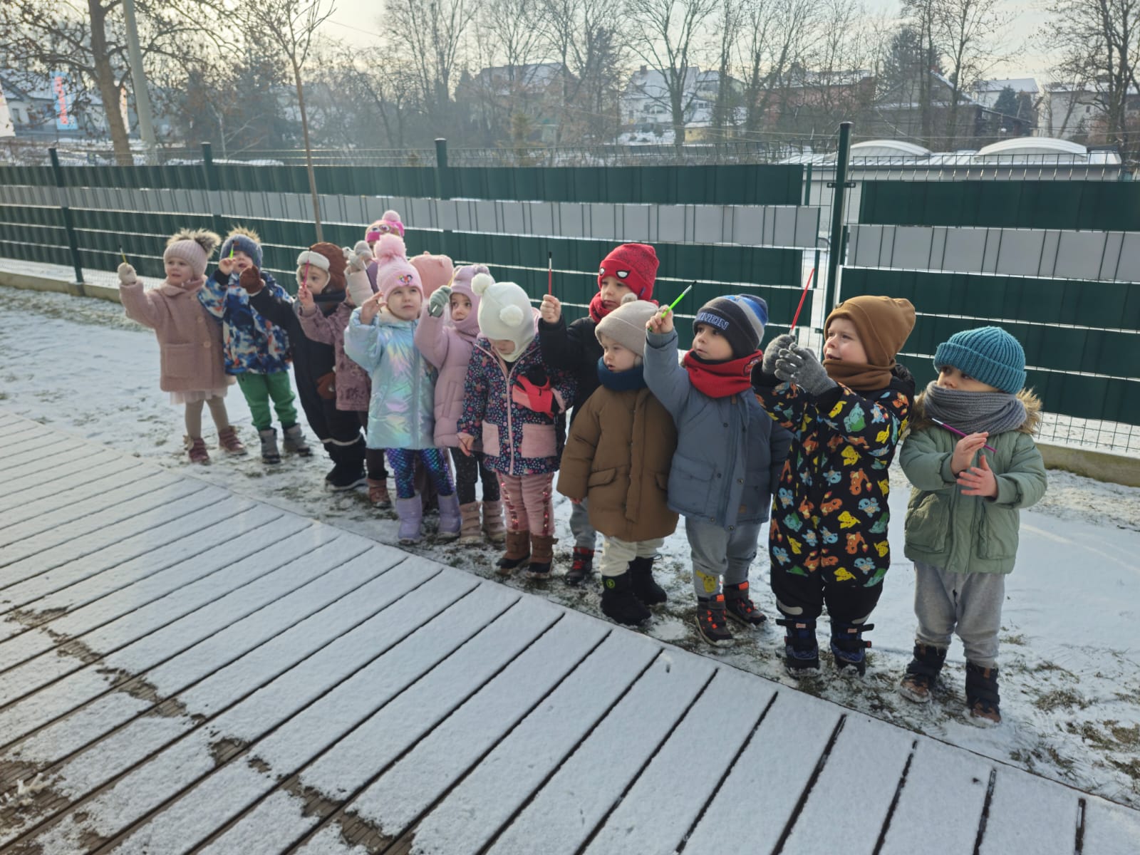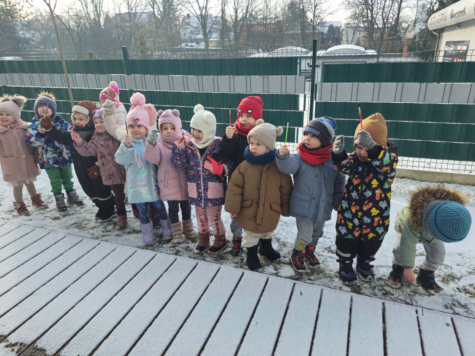 Podczas pobytu na świeżym powietrzu dzieci aktywnie uczestniczyły w zabawach na śniegu, które były doskonałą okazją do ruchu oraz poznawania zimowej aury. Przedszkolaki odciskały ślady butów w śniegu, tworzyły aniołki na śniegu, a także brały udział w prostych zabawach ruchowych, co sprawiło im mnóstwo radości. Zimowe wyjście było także okazją do zabaw sensorycznych na śniegu. Przedszkolaki malowały po śniegu, rozwijając swoją kreatywność, wyobraźnię oraz sprawność manualną. Dzieci badały śnieg za pomocą obserwacji, sprawdzając, czy jest czysty, zwracając uwagę na jego kolor i strukturę. Po jego rozpuszczeniu okazało się, że śnieg jest brudny, ponieważ zawierał zanieczyszczenia, pojawiły się drobinki piasku, kurzu co było dla przedszkolaków ciekawym doświadczeniem. Na tej podstawie dzieci doszły do wniosku, że śnieg, mimo białego koloru, nie jest czysty i nie nadaje się do jedzenia. Kontakt z zimową przyrodą dostarczył dzieciom wielu pozytywnych emocji i wrażeń sensorycznych, wspierając naturalną odporność organizmu oraz budując radość ze wspólnej zabawy i aktywności.