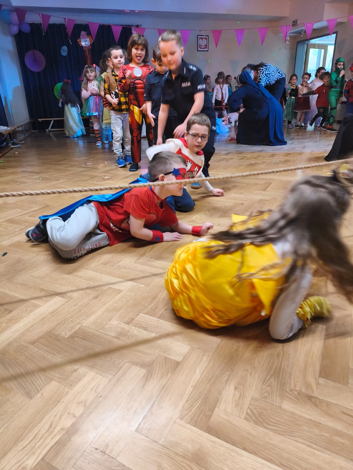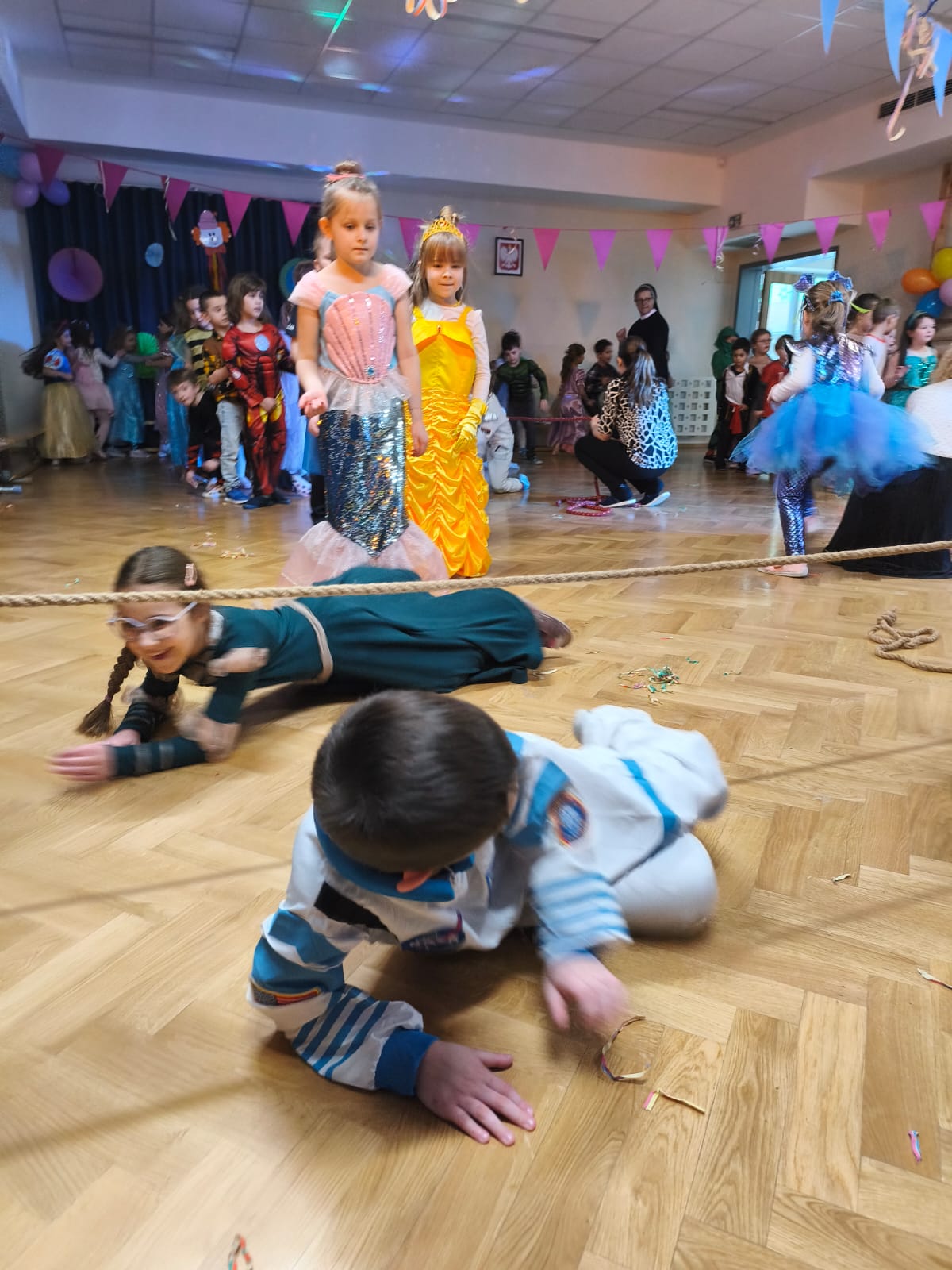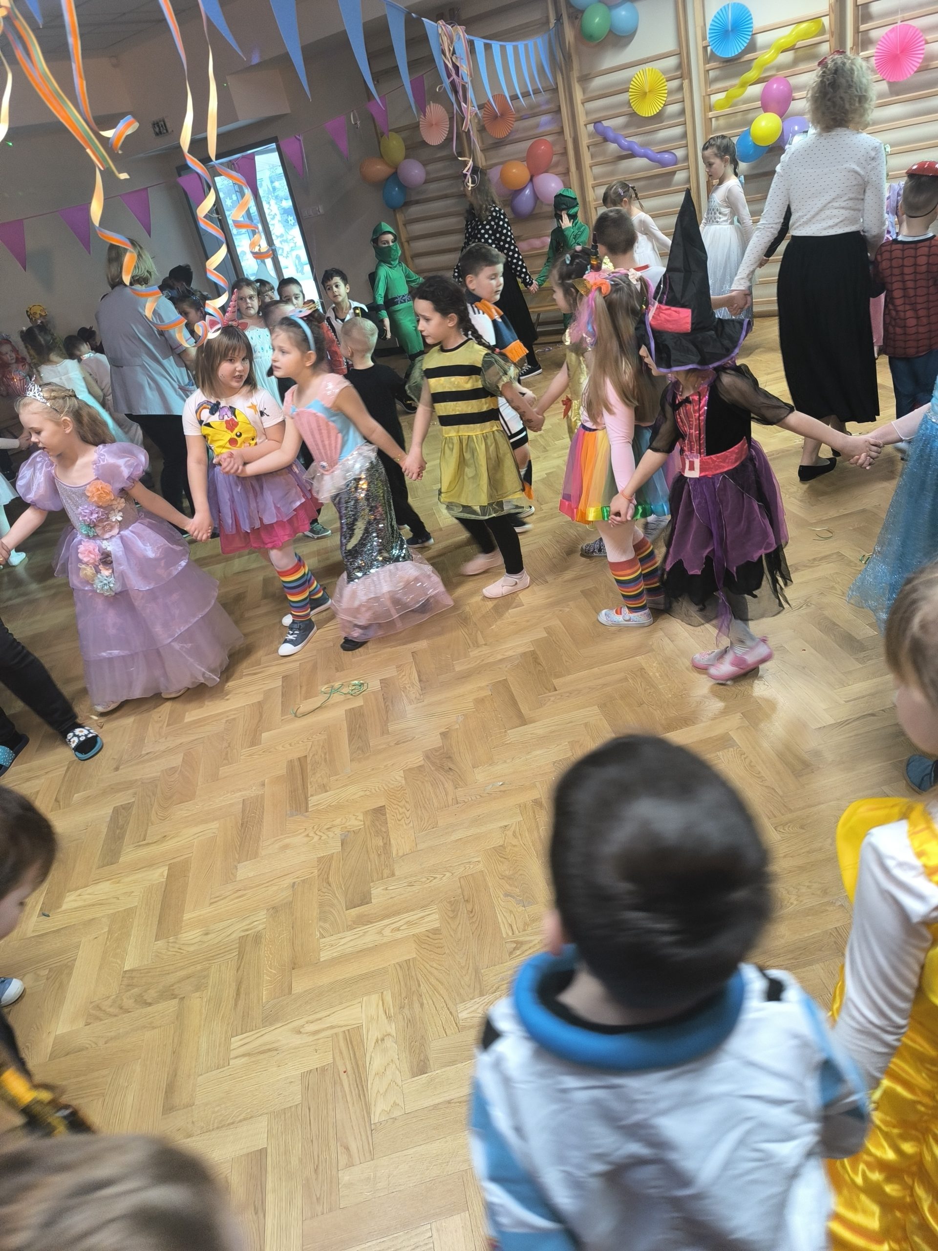 Podczas balu było wiele wesołych zabaw, tańców i konkursów, w których dzieci chętnie i z dużym zaangażowaniem brały udział. W przerwie na uczestników czekał słodki poczęstunek, który dodał energii do dalszej zabawy.