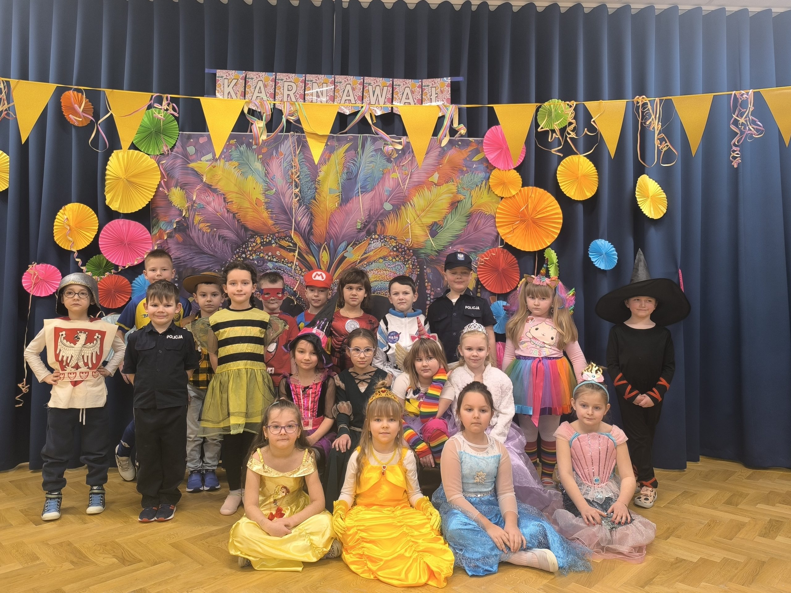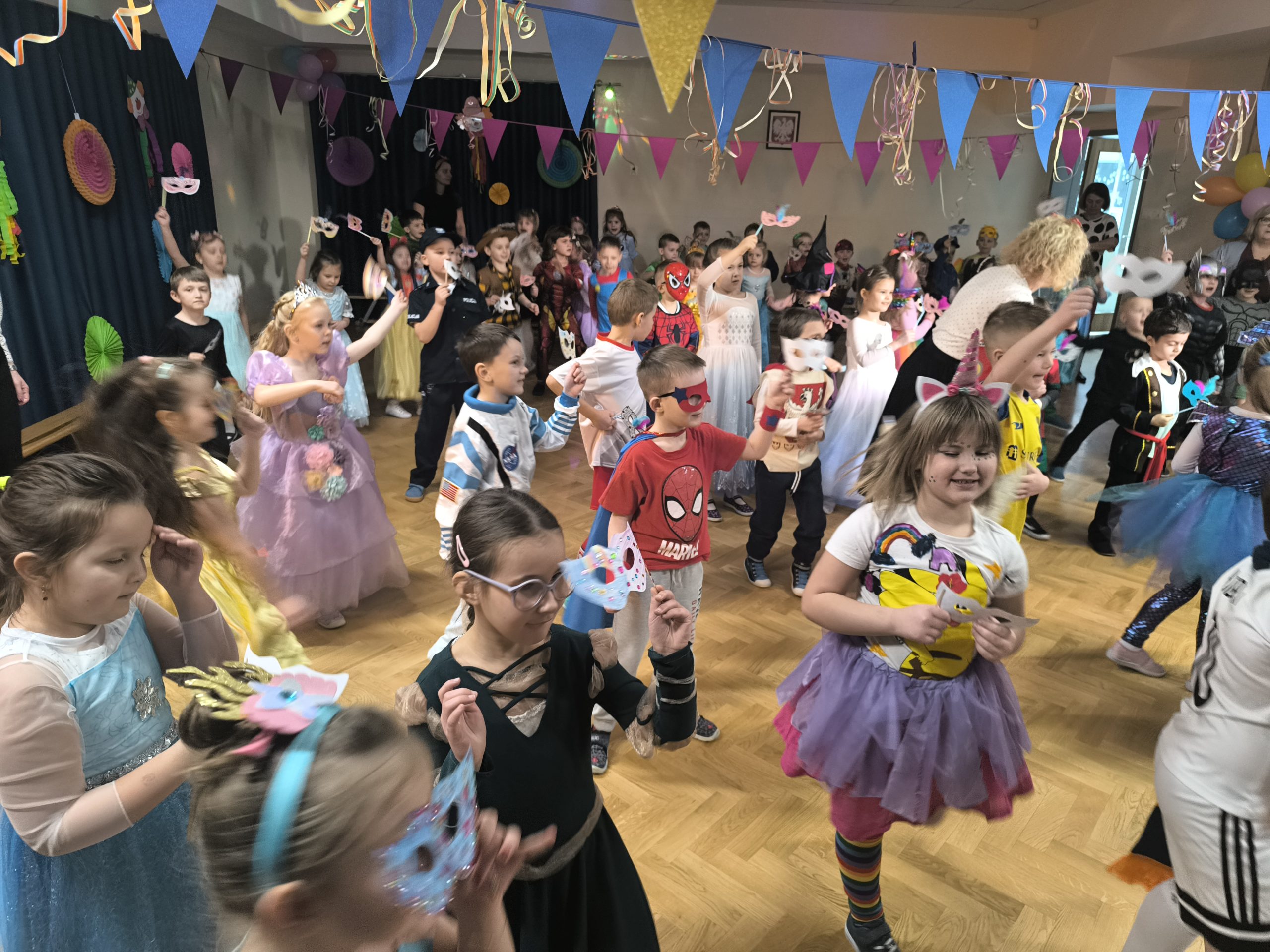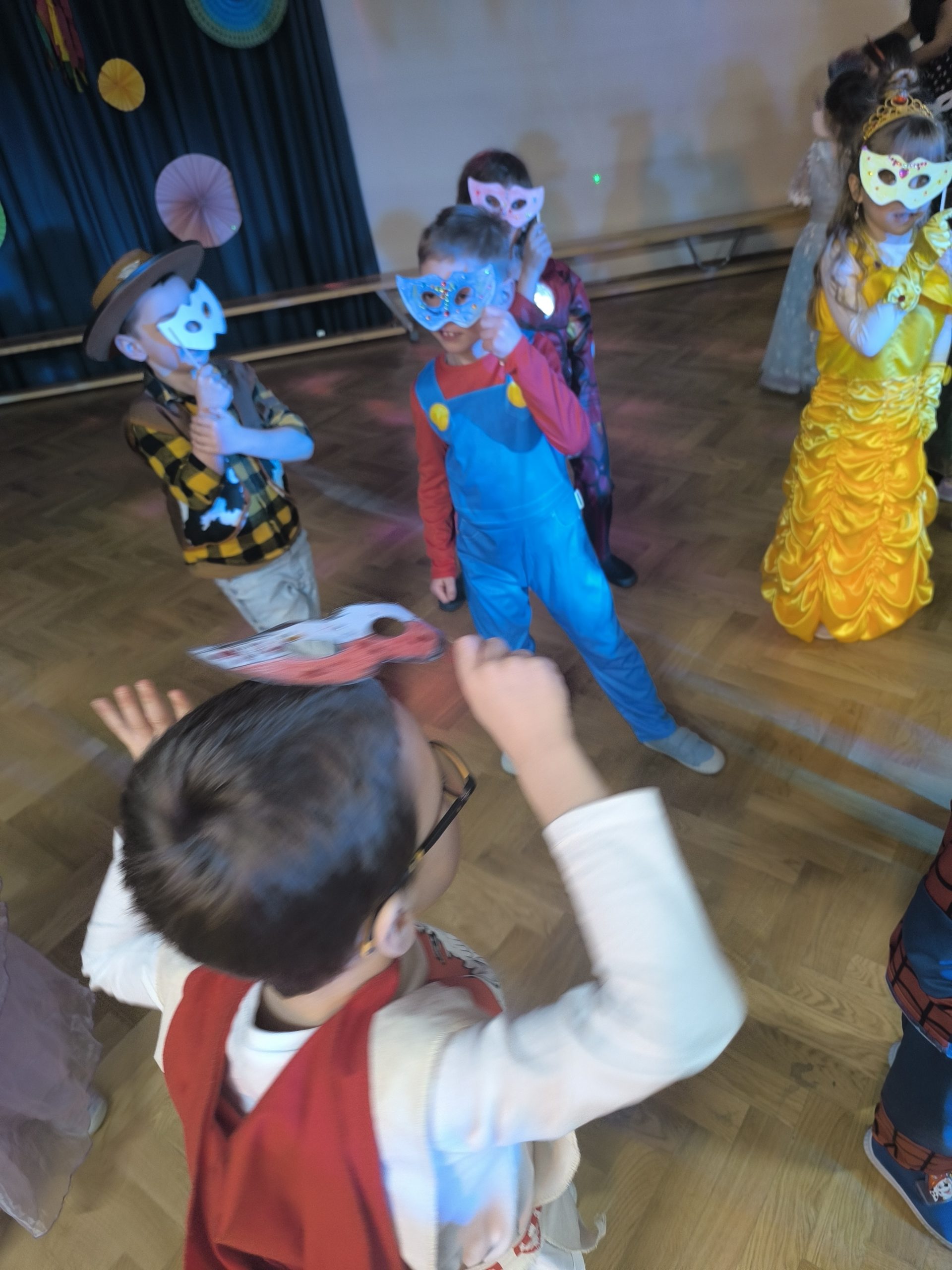 Dodatkową atrakcją było wykonanie kolorowych masek karnawałowych, które dzieci ozdabiały według własnych pomysłów. Zabawa karnawałowa była wspaniałą okazją do integracji, rozwijania kreatywności oraz wspólnego, radosnego świętowania.
