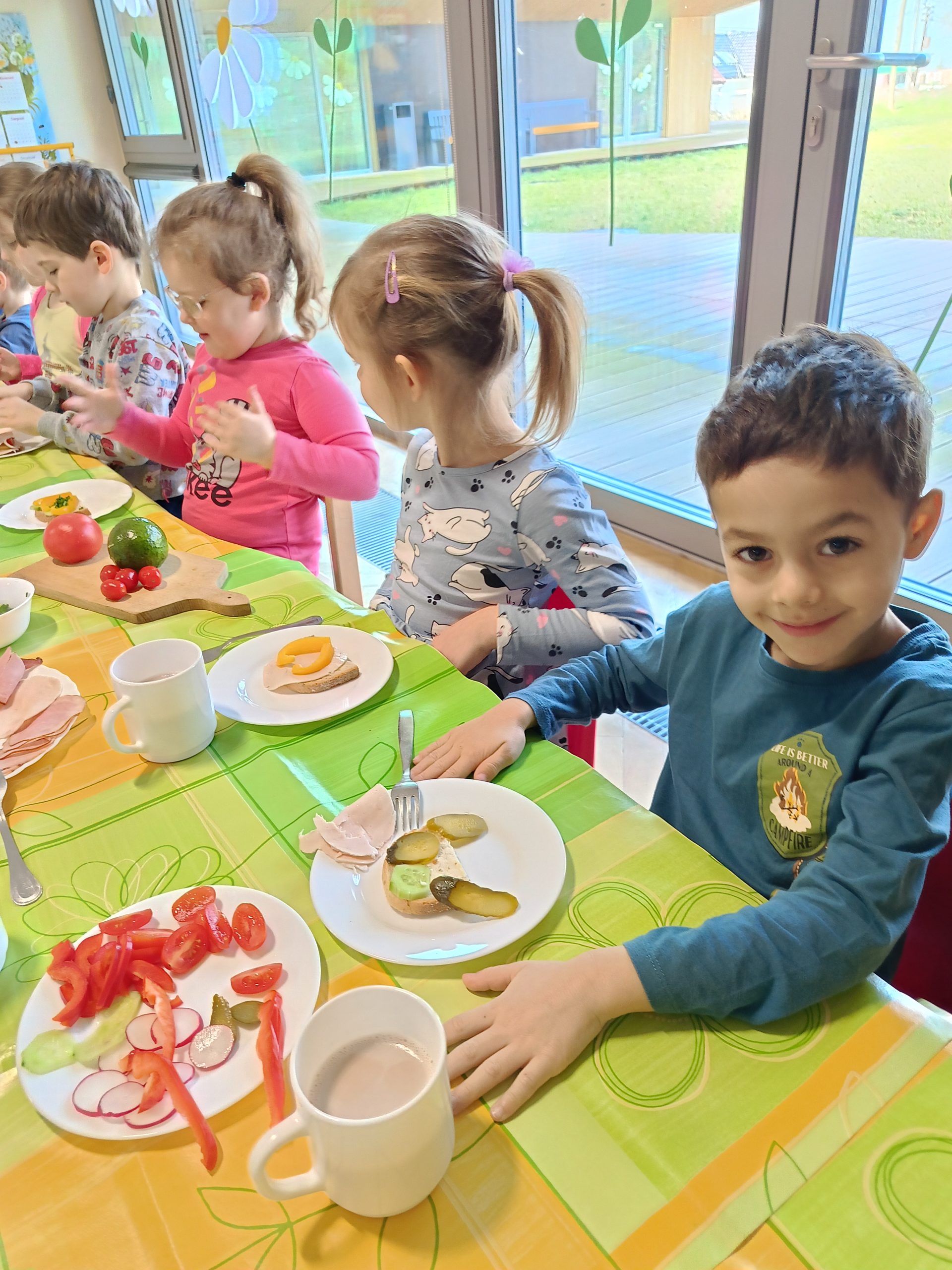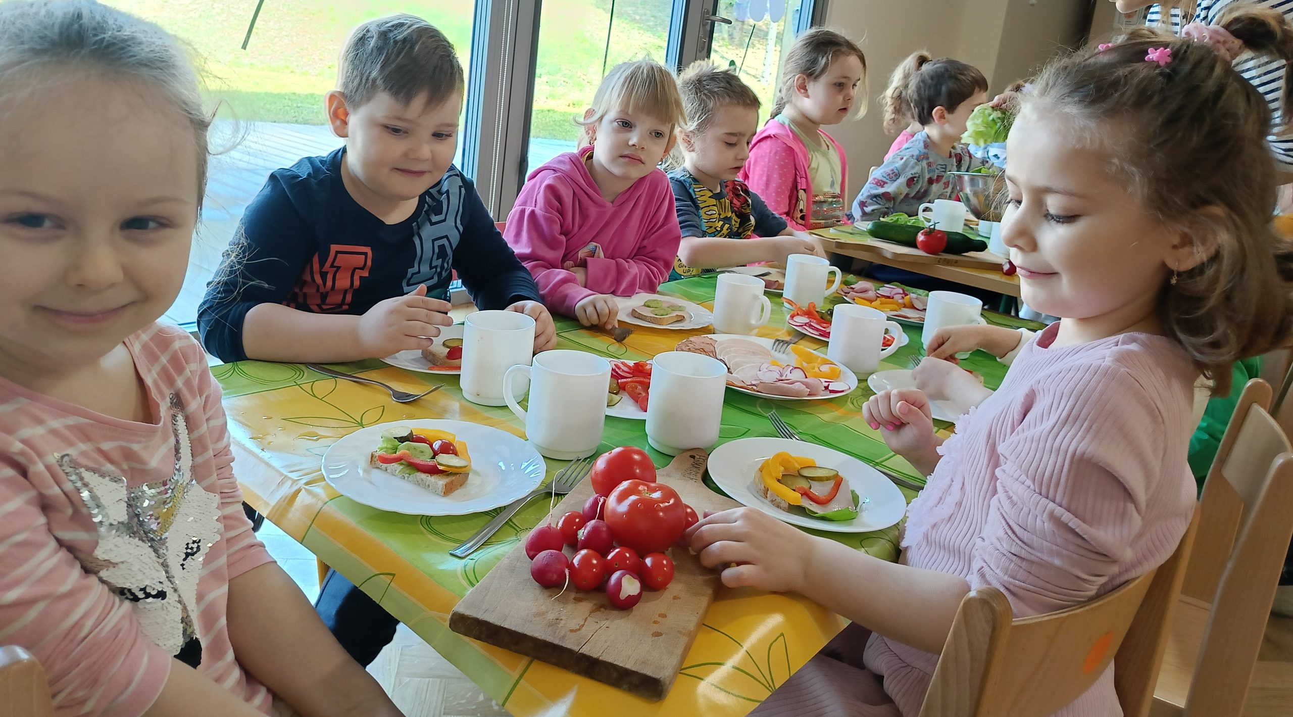 W ramach realizowanego w tym tygodniu tematu „Dbamy o zdrowie” przedszkolaki miały okazję samodzielnie przygotować wiosenne, kolorowe, zdrowe kanapki. Podczas zajęć dzieci dowiedziały się między innymi, jak ważne jest spożywanie warzyw i owoców oraz jakie witaminy kryją się w zdrowych produktach. Po krótkiej rozmowie i wspólnym planowaniu, dzieci samodzielnie komponowały swoje kanapki, wybierając spośród wielu świeżych warzyw.