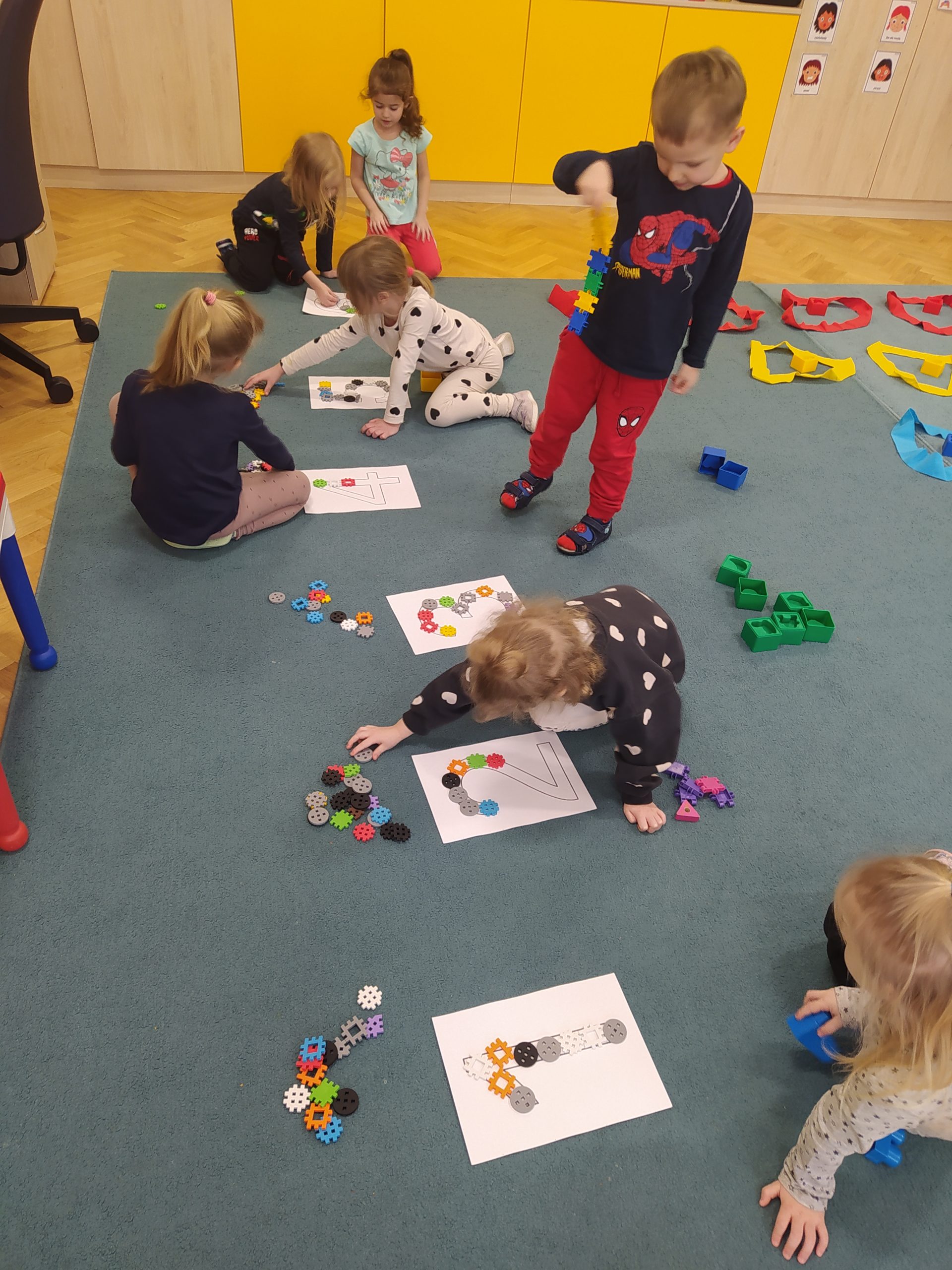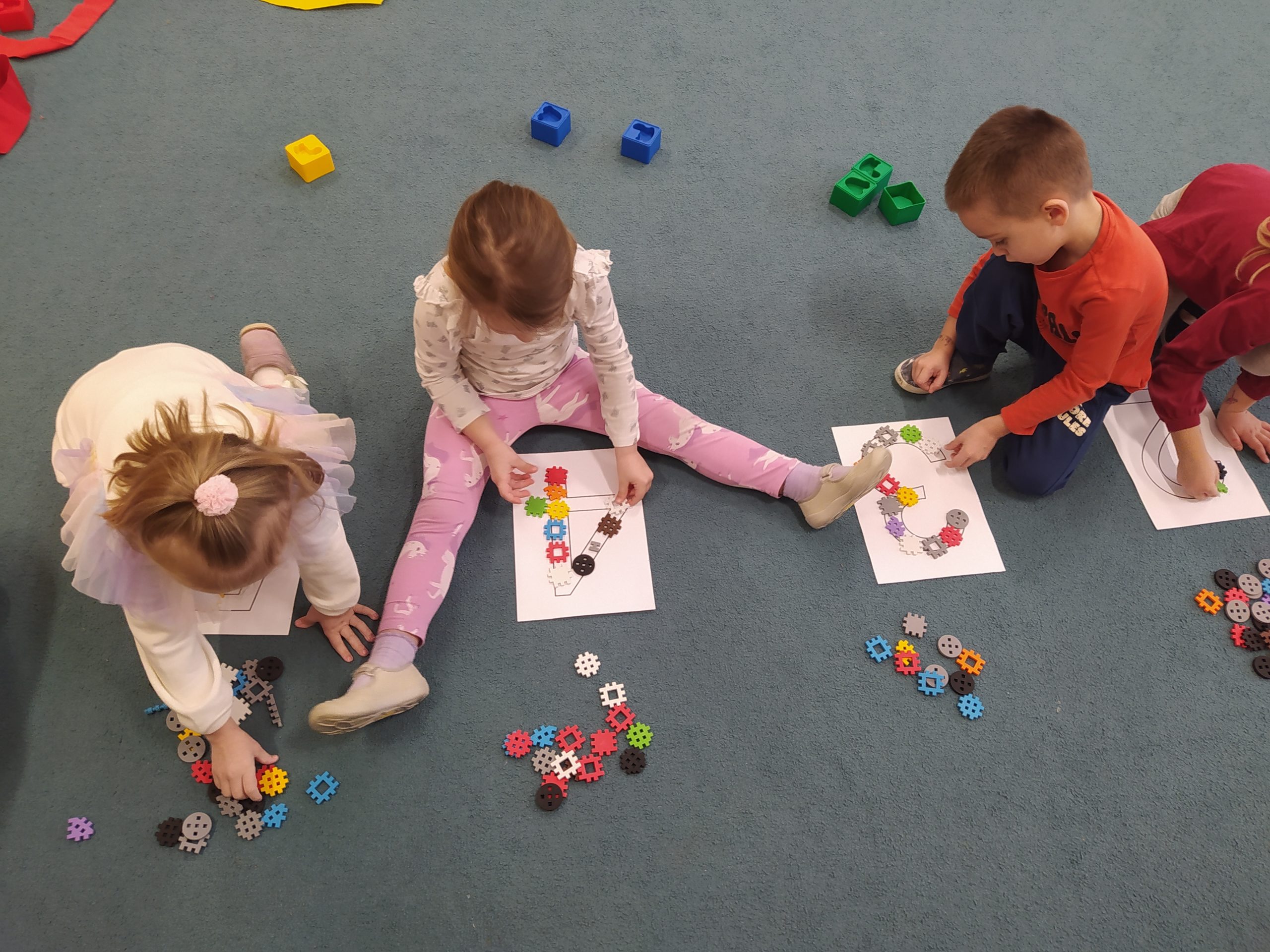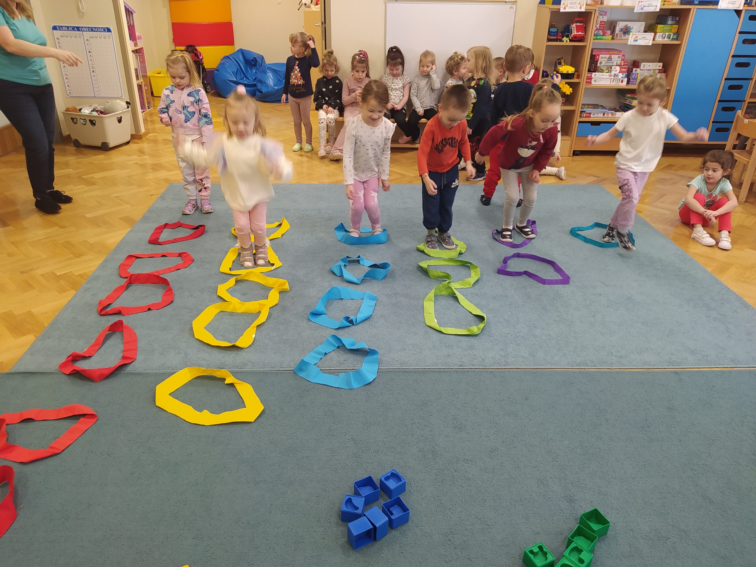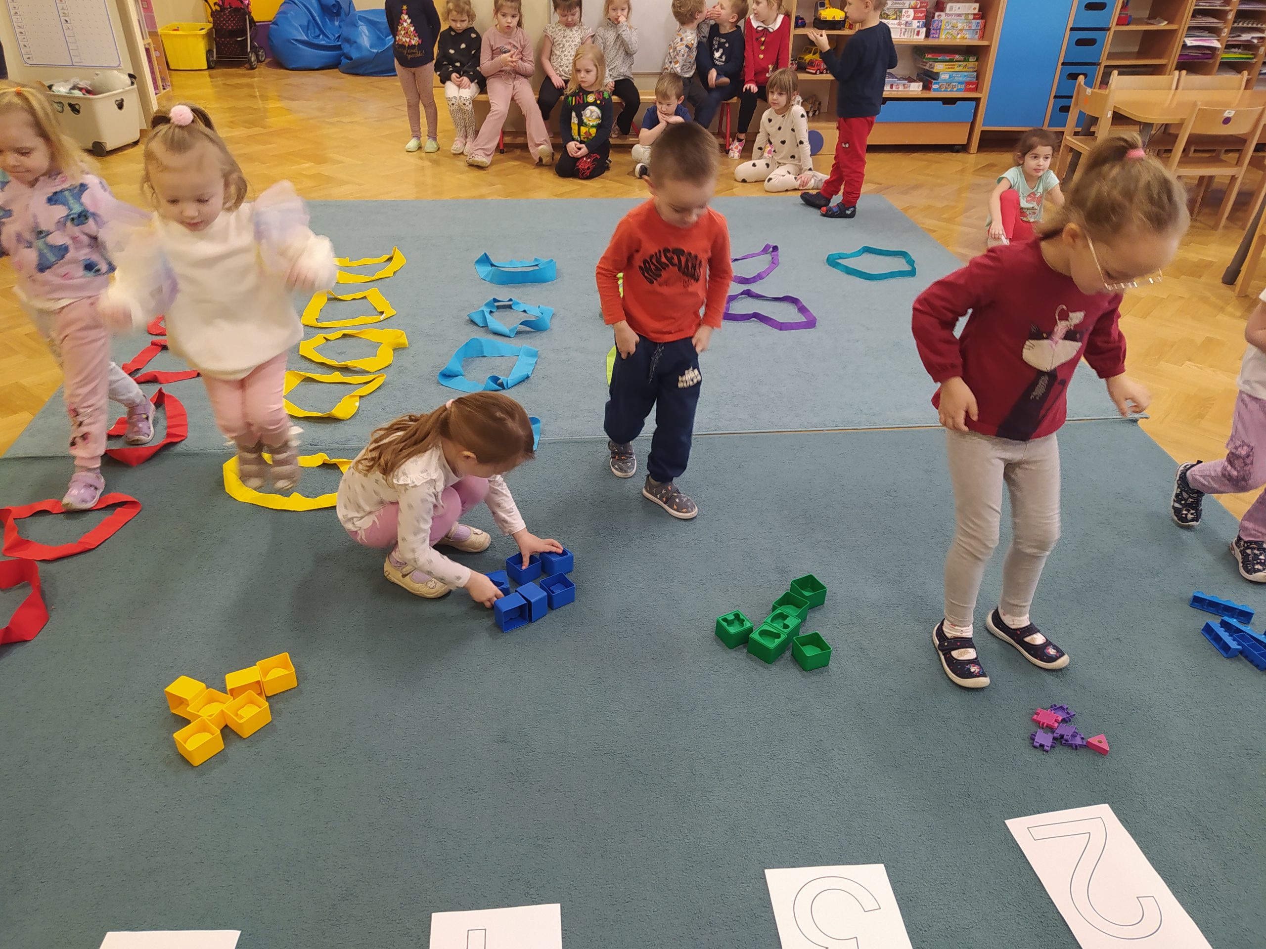 Podczas zajęć przedszkolnych dzieci miały okazje uczestniczyć w zabawie ” kolorowe przeliczanie na dywanie”. Dzieci doskonaliły umiejętność rozpoznawania i nazywania kolorów oraz ćwiczyły umiejętności matematyczne, takie jak liczenie i klasyfikowanie. Zajęcia dostarczyły dzieciom wiele radości oraz pokazały, że matematyka może być wesoła i kolorowa.