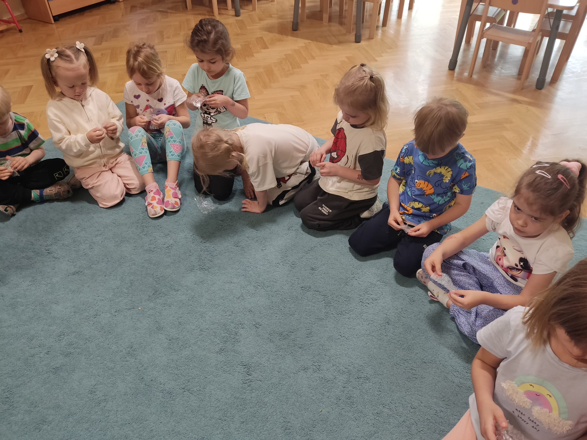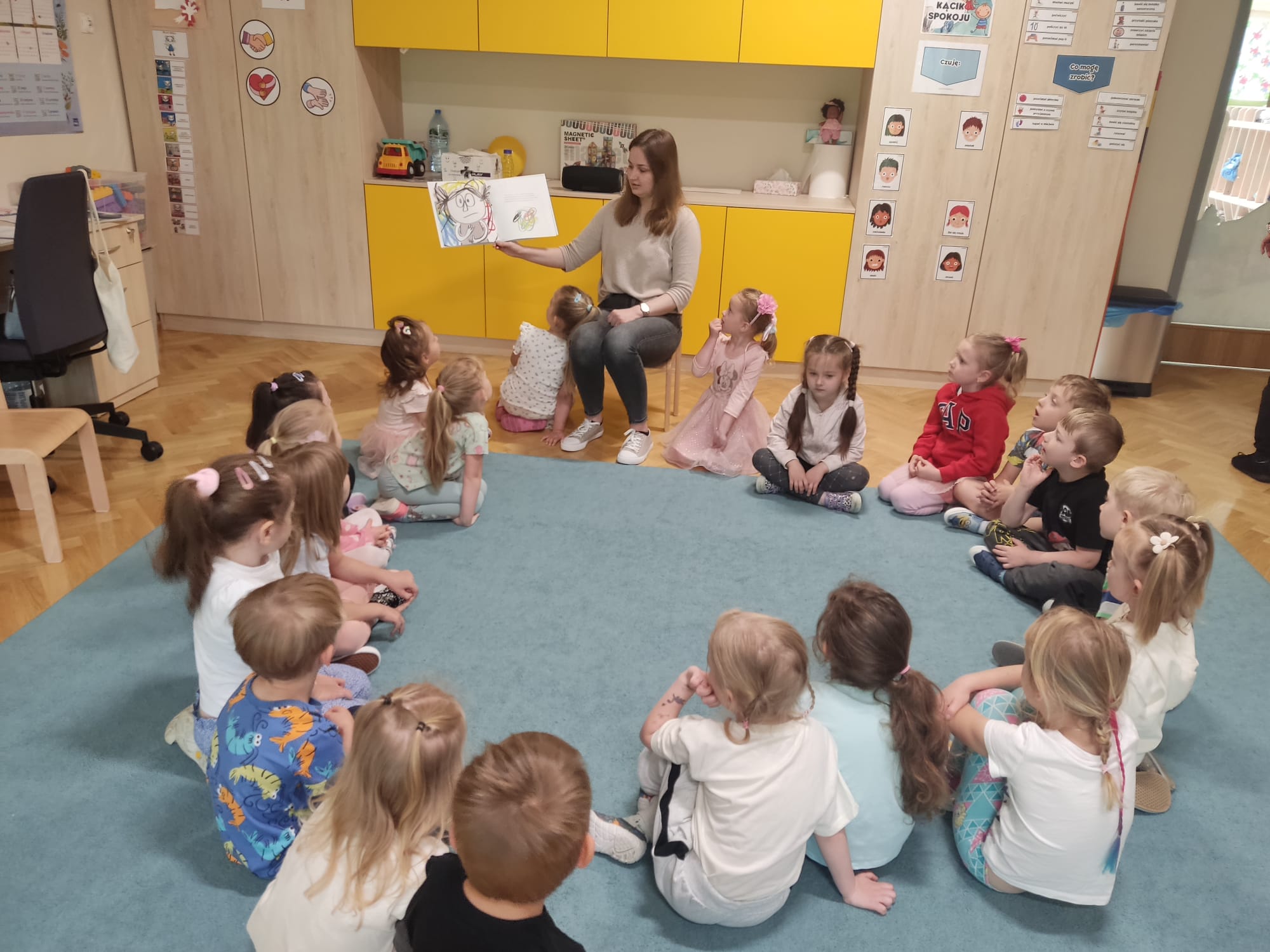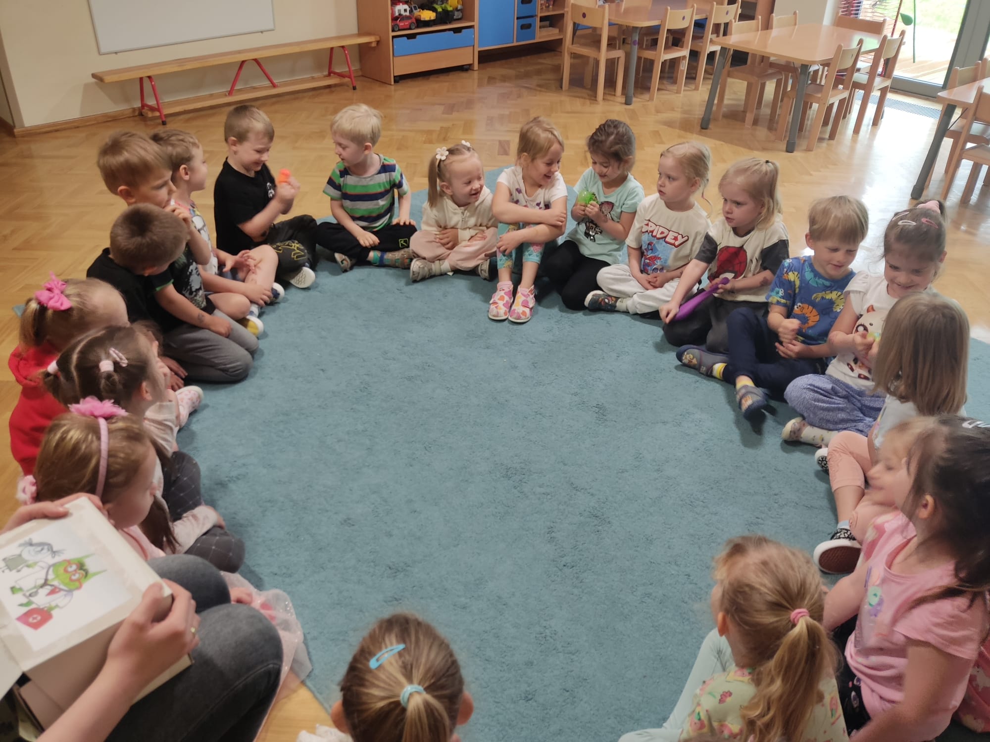 Dzieci z naszej grupy miały przyjemność uczestniczyć 03.06.2025 r. w zajęciach prowadzonych przez Panią psycholog pt. ,,Kolorowy potwór – doktor od emocji”. Zajęcie opierały się na książce ,,Kolorowy potwór. Doktor od emocji” – w książce dzieci zapoznały się z apteczką kolorowego potwora i poznały jego sposoby na radzenie sobie z emocjami. Podczas zajęć dzieci przypomniały sobie podstawowe emocje oraz wyrażały je za pomocą swojej mimiki twarzy oraz gestów. Poznały techniki radzenia sobie z odczuwanymi emocjami (techniki oddechowe, pękanie foli bąbelkowej, gazety, zabawa gniotkami, mandala oraz muzyka relaksacyjna).