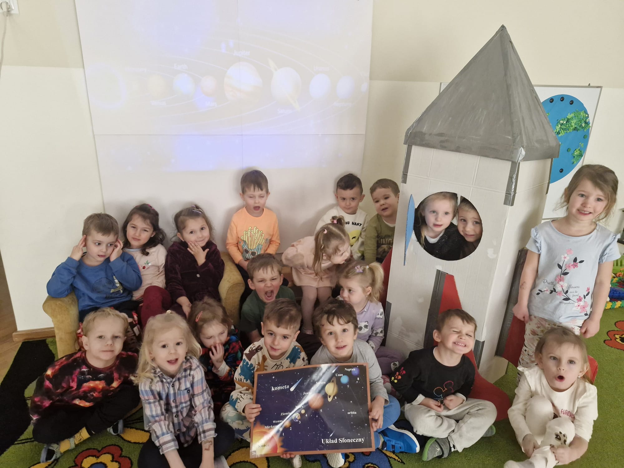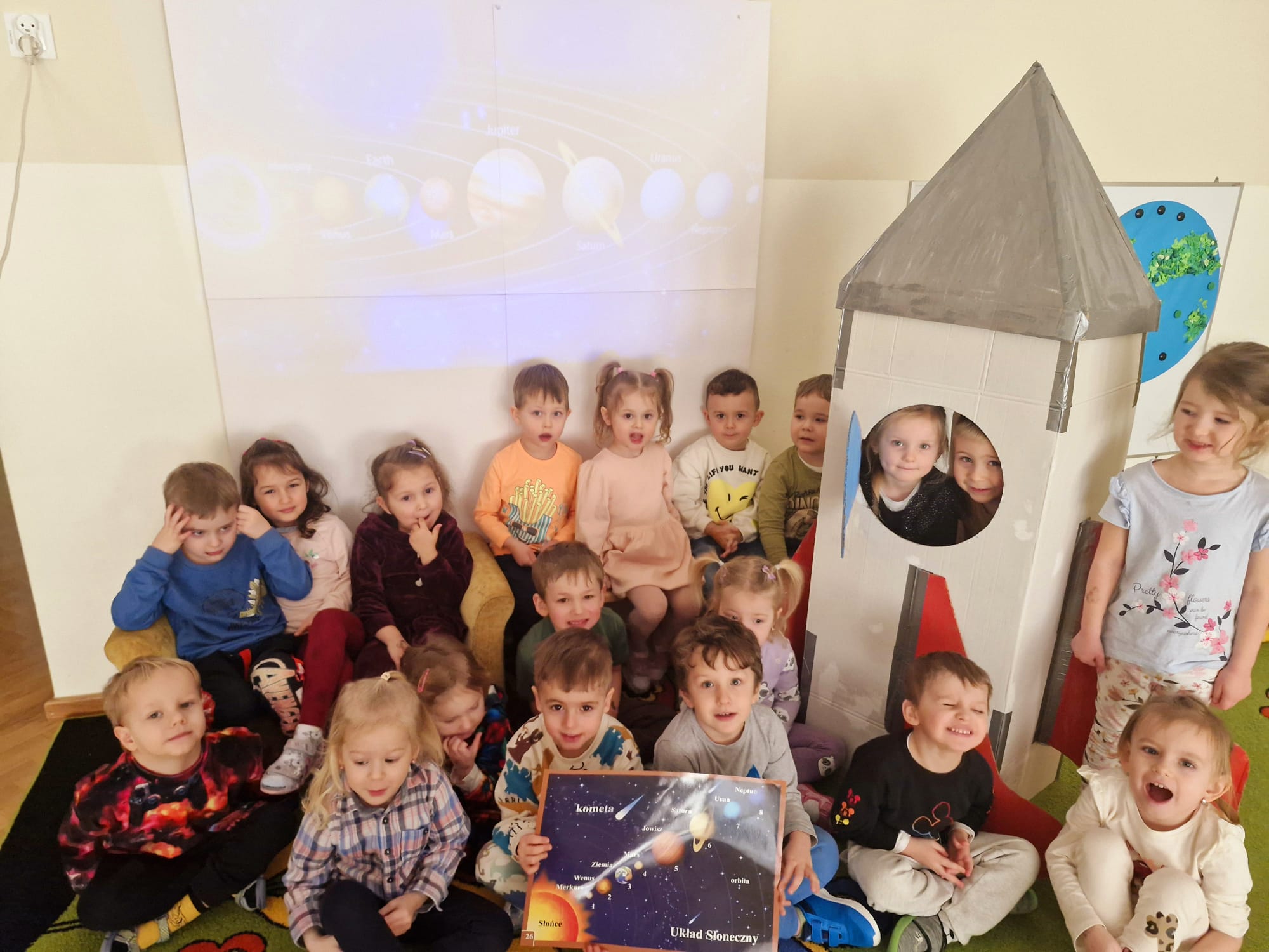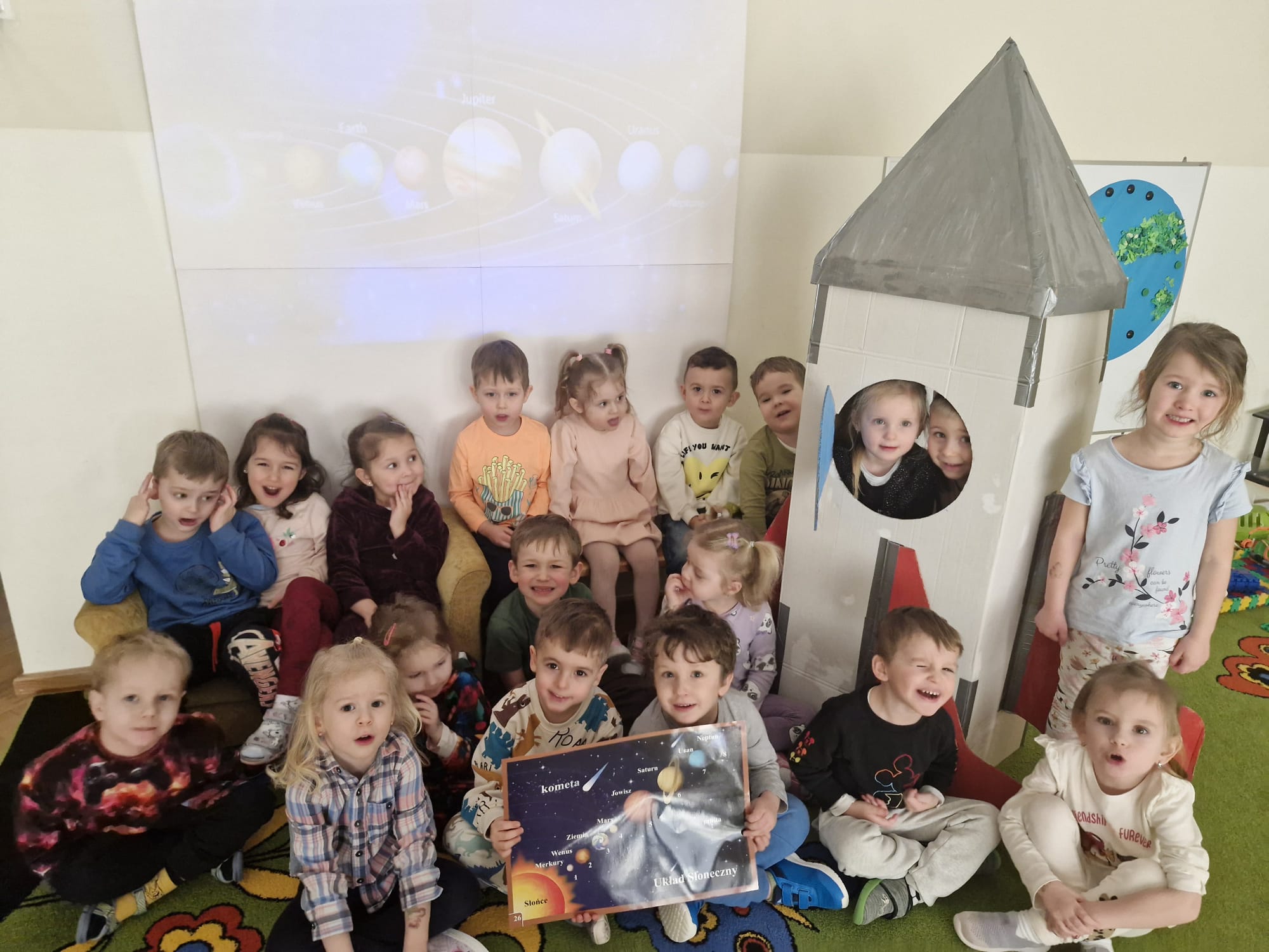 21 lutego „Zajączki” świetnie bawiły się podczas zajęć o kosmosie. Były bardzo zainteresowane tematem i aktywnie uczestniczyły w zabawach. Szczególnie podobała im się zabawa w rakietę oraz tworzenie własnych planet. Każde dziecko chętnie opowiadało o swojej planecie, wykazując się dużą kreatywnością. Na zakończenie wszystkie dzieci wykonały pracę plastyczną na której przedstawione zostały elementy powiązane z kosmosem i z uśmiechem wrócili do swoich zabaw.