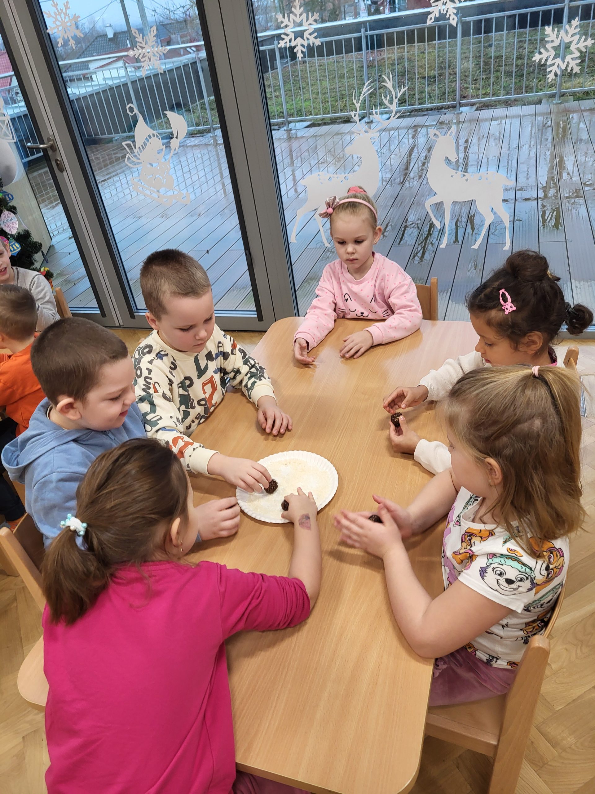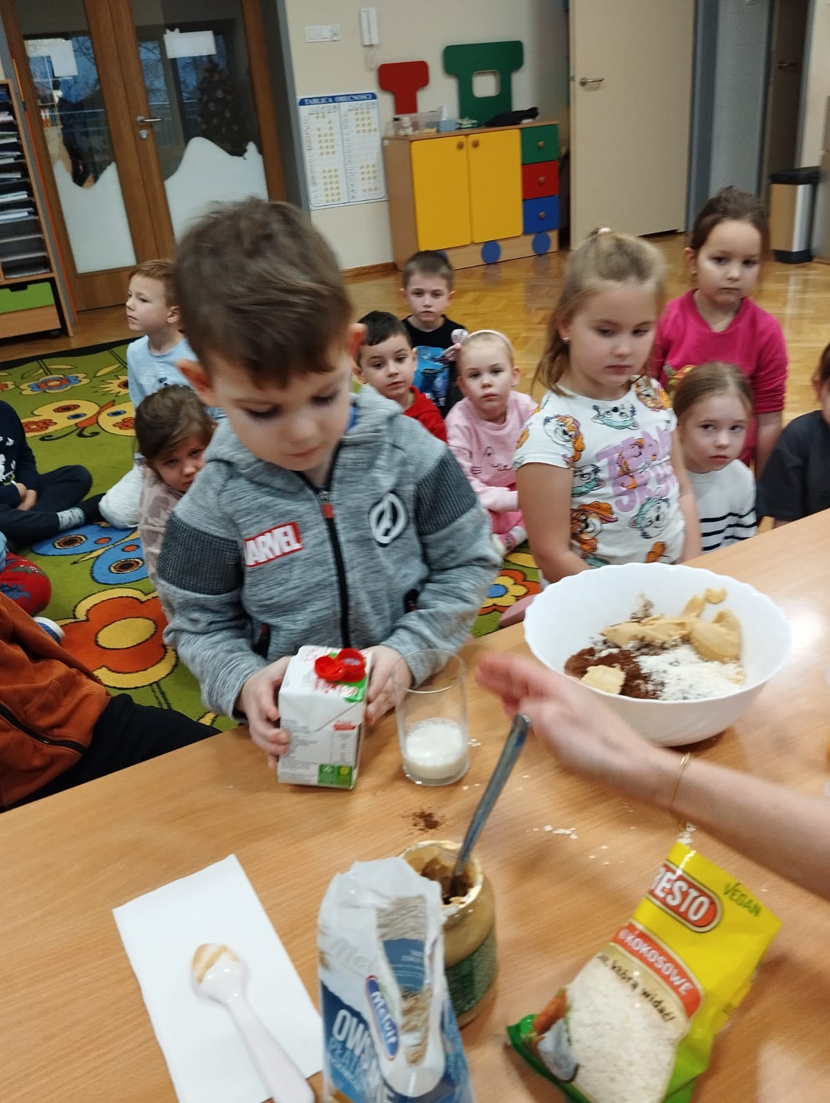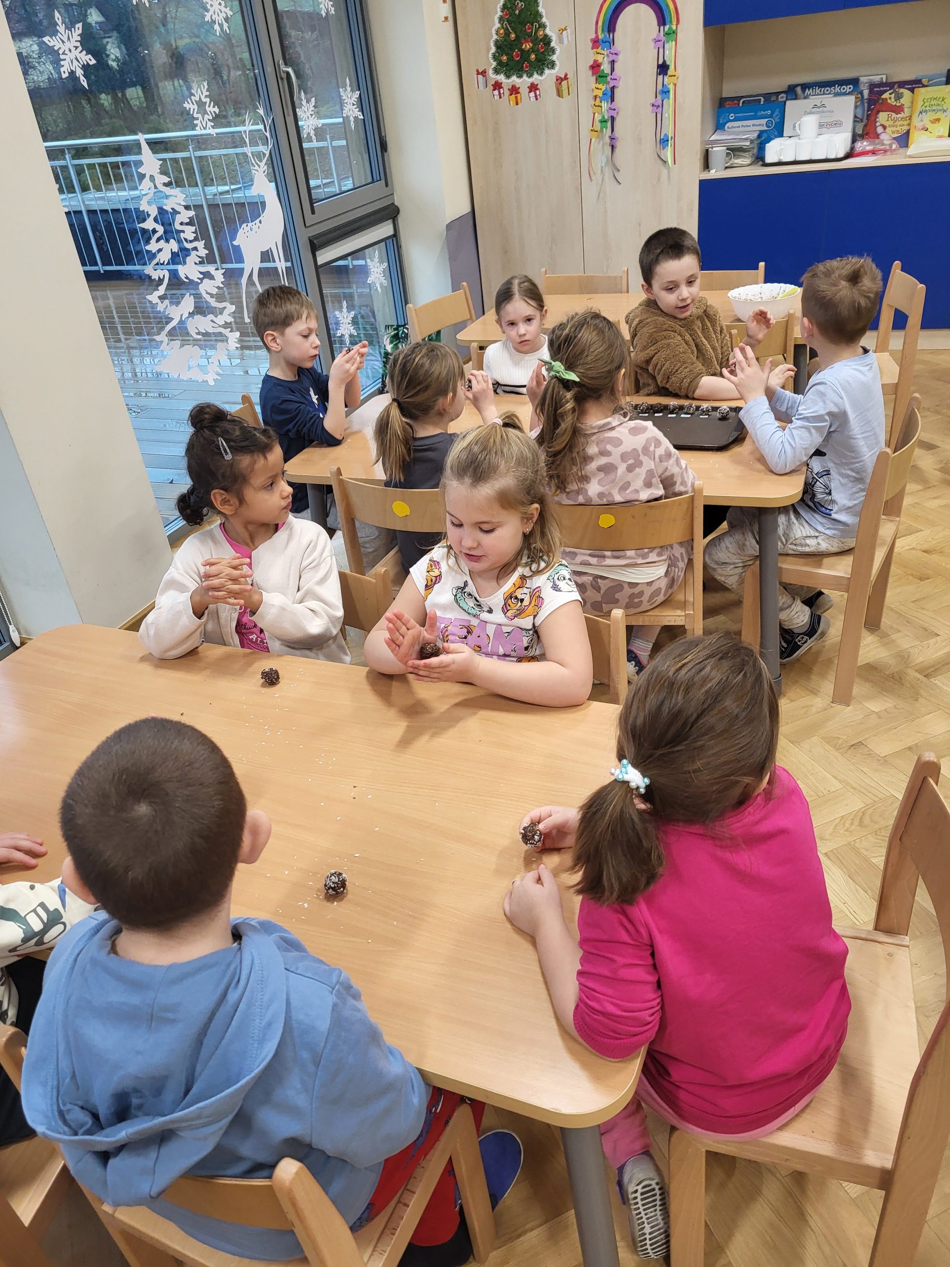 W naszej grupie 10 stycznia w ramach Ogólnopolskiego Projektu Edukacyjnego „Gramy Zmysłami” oraz programu „Zdrowie to skarb – dbaj o siebie każdego dnia” robiliśmy kulki mocy z płatków owsianych, wiórków kokosowych, kakao, miodu, masła orzechowego oraz mleka, które są zdrowym zamiennikiem słodyczy. Podczas ich wykonywania na dzieci oddziaływały różnorodne bodźce zmysłowe – wzrokowe, węchowe, dotykowe i smakowe. Celem zajęć był nie tylko odbiór wrażeń sensorycznych, ale również pokazanie dzieciom, że zamiast sięgania po niezdrowe słodycze, można samemu zrobić pyszną, zdrową przekąskę. Dzieci z dużym zaangażowaniem i ciekawością brały udział w przygotowaniu kulek mocy oraz nie mogły się doczekać skosztowania przygotowanych przez siebie smakołyków.