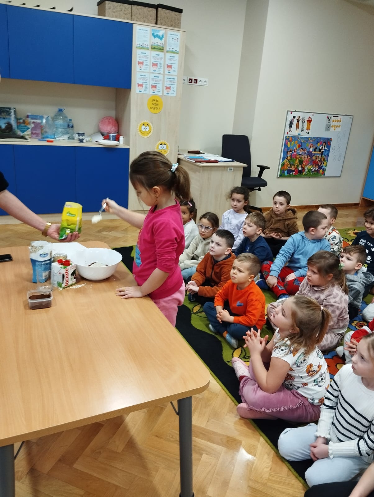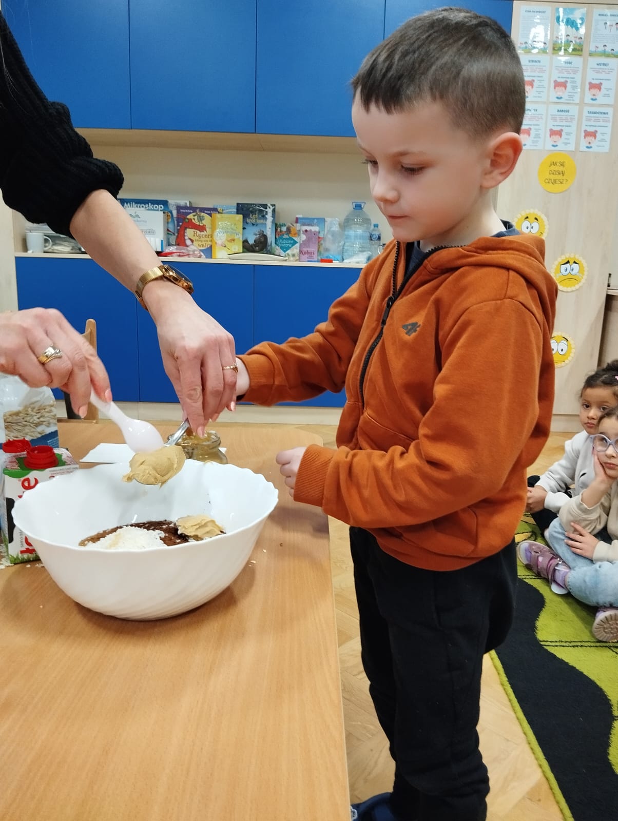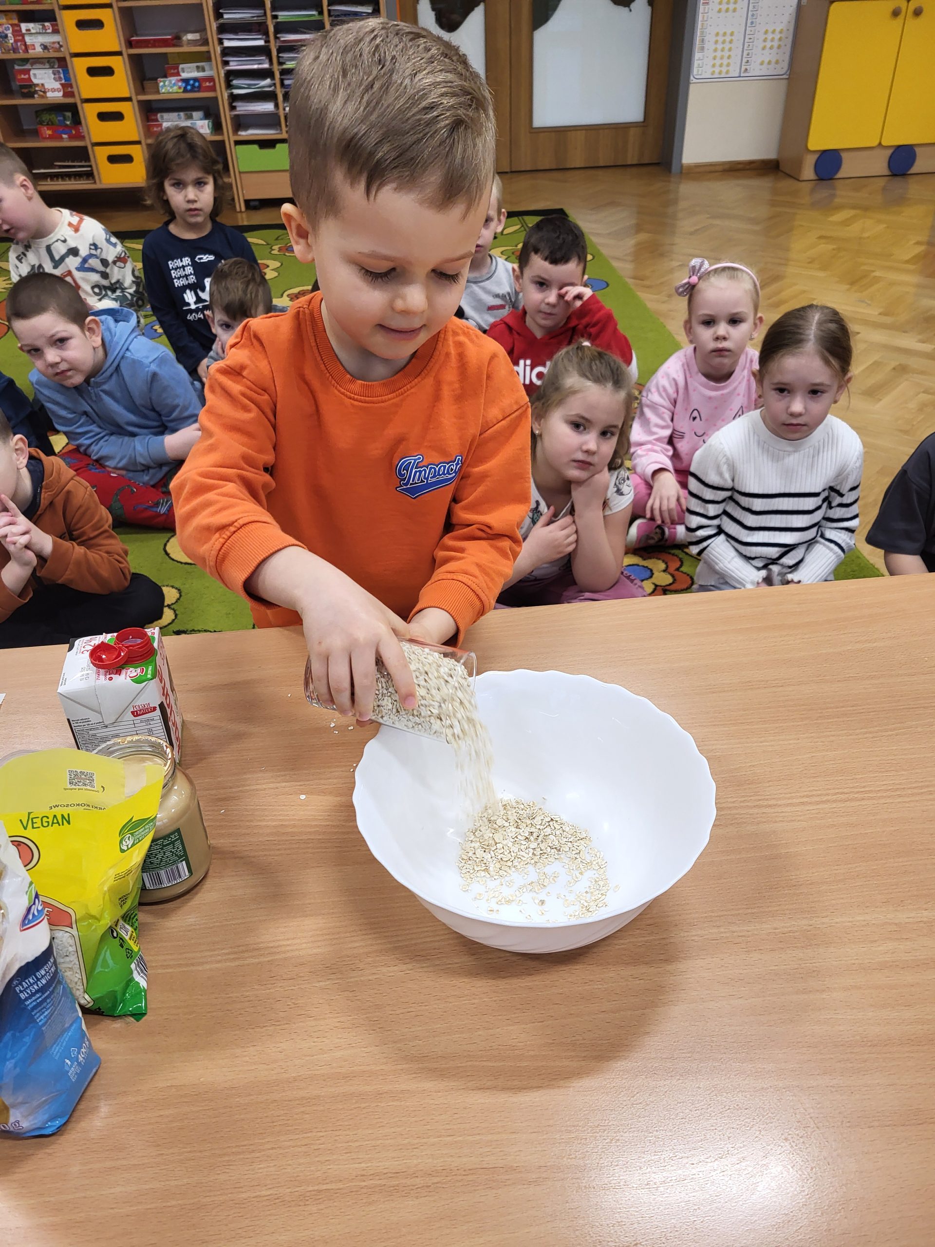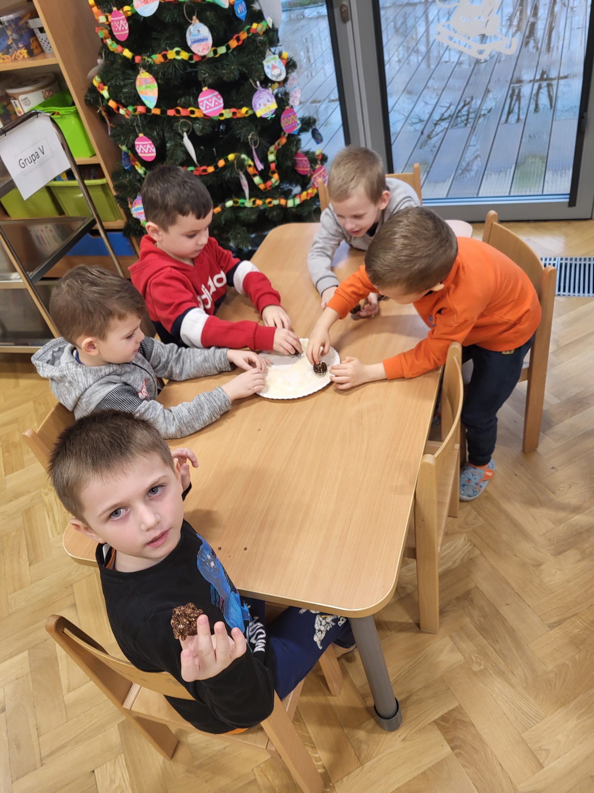 W naszej grupie 10 stycznia w ramach Ogólnopolskiego Projektu Edukacyjnego „Gramy Zmysłami” oraz programu „Zdrowie to skarb – dbaj o siebie każdego dnia” robiliśmy kulki mocy z płatków owsianych, wiórków kokosowych, kakao, miodu, masła orzechowego oraz mleka, które są zdrowym zamiennikiem słodyczy. Podczas ich wykonywania na dzieci oddziaływały różnorodne bodźce zmysłowe – wzrokowe, węchowe, dotykowe i smakowe. Celem zajęć był nie tylko odbiór wrażeń sensorycznych, ale również pokazanie dzieciom, że zamiast sięgania po niezdrowe słodycze, można samemu zrobić pyszną, zdrową przekąskę. Dzieci z dużym zaangażowaniem i ciekawością brały udział w przygotowaniu kulek mocy oraz nie mogły się doczekać skosztowania przygotowanych przez siebie smakołyków.